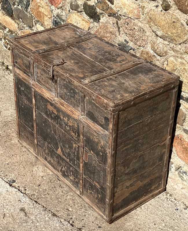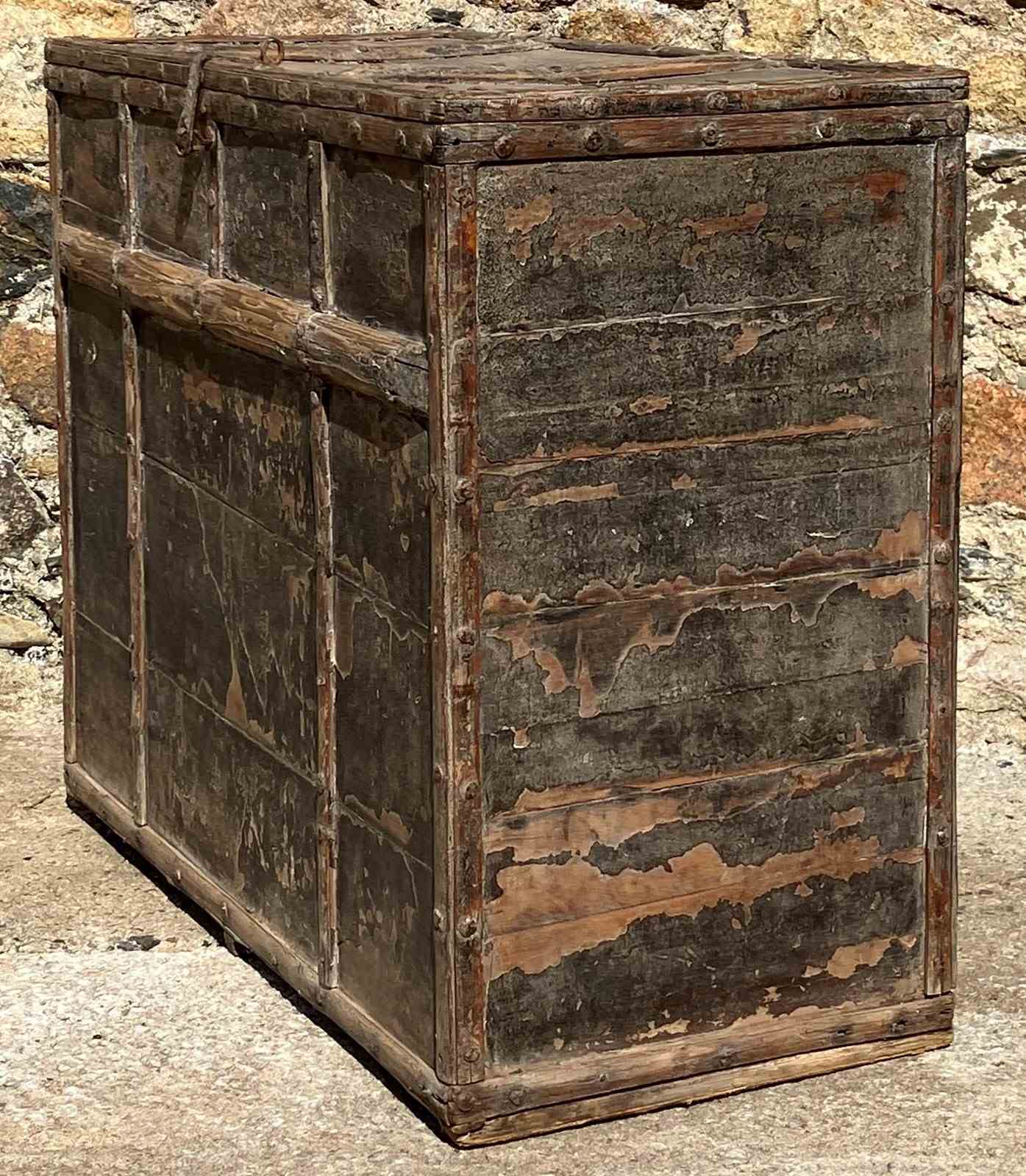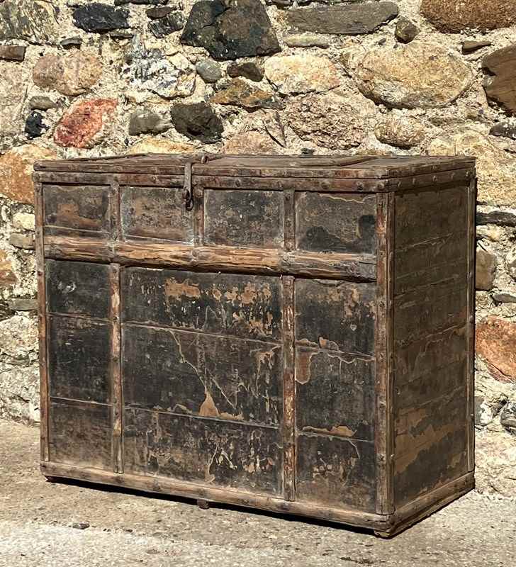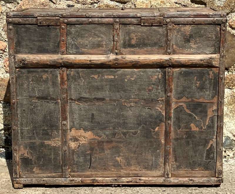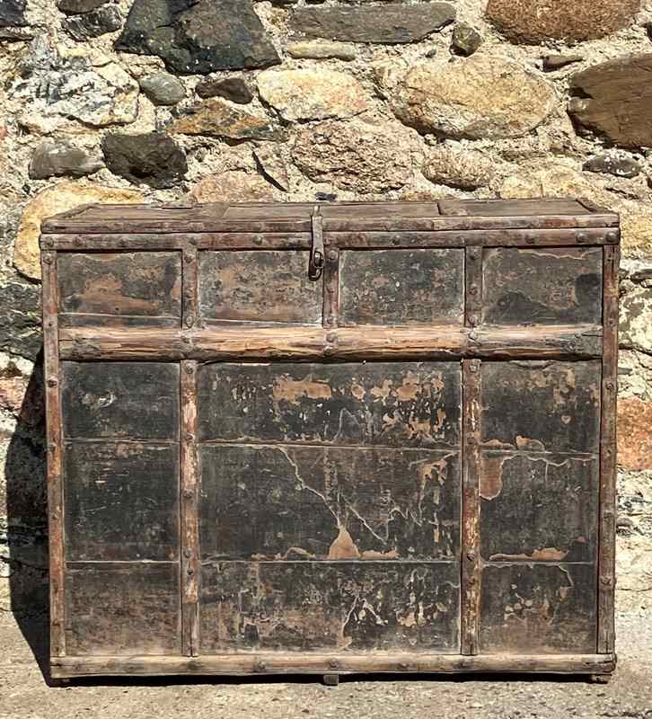A very unusual large antique trunk from Tibet with original wooden staves, metal studwork and hammered metal hook. There is great age to this trunk, and the wear to the old paint finish gives it a very attractive texture and patina. A great rustic piece with useful storage capacity.