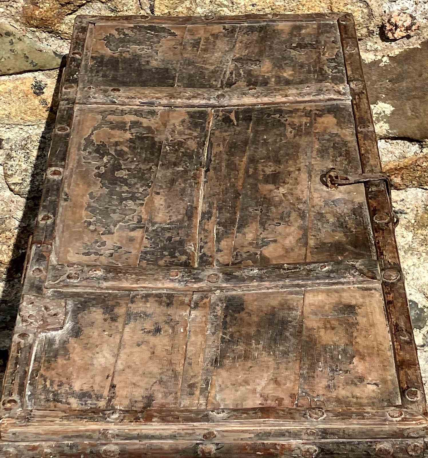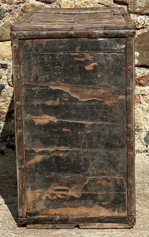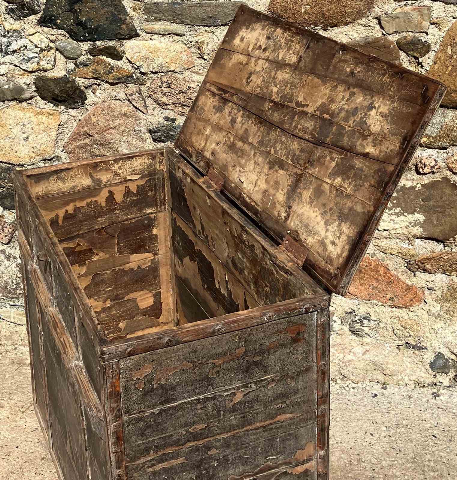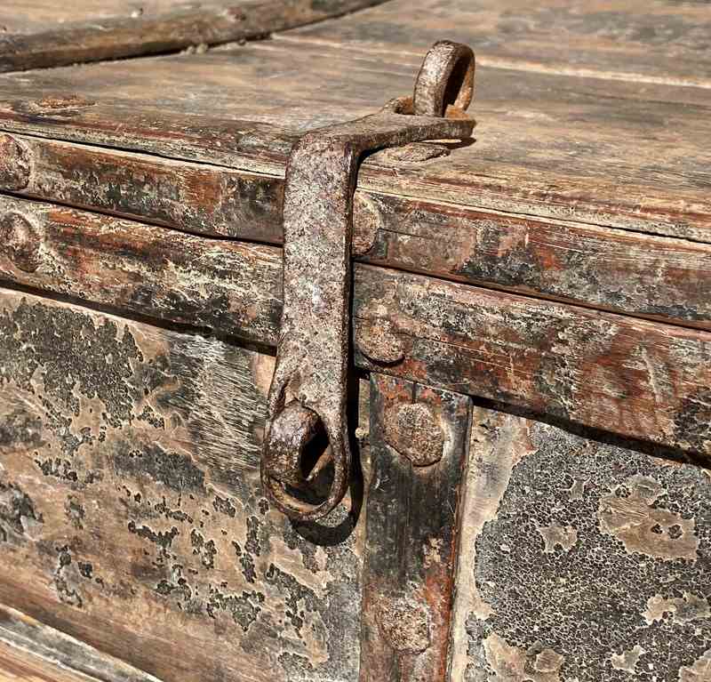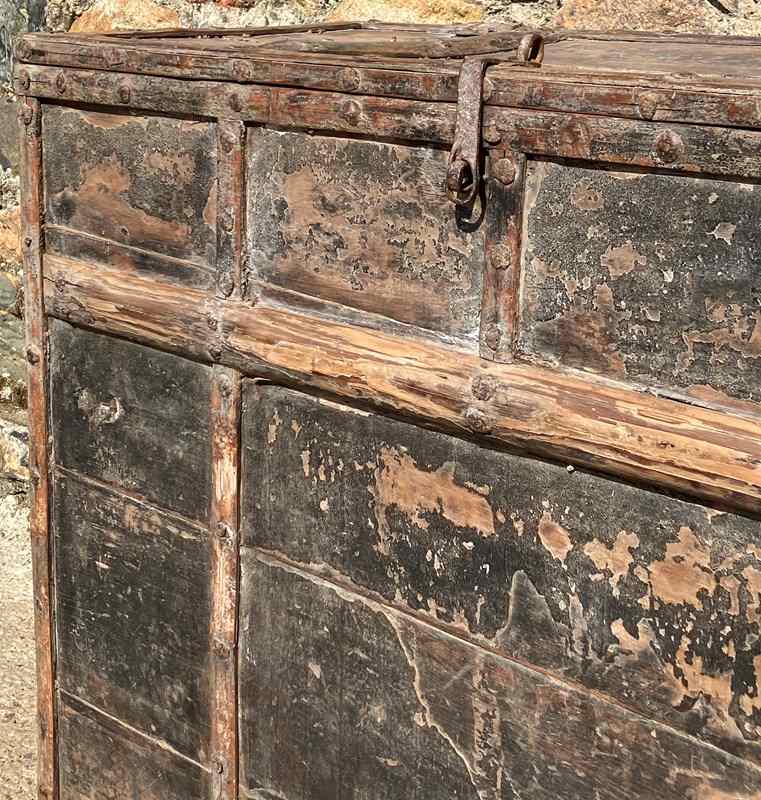 A very unusual large antique trunk from Tibet with original wooden staves, metal studwork and hammered metal hook. There is great age to this trunk, and the wear to the old paint finish gives it a very attractive texture and patina. A great rustic piece with useful storage capacity.