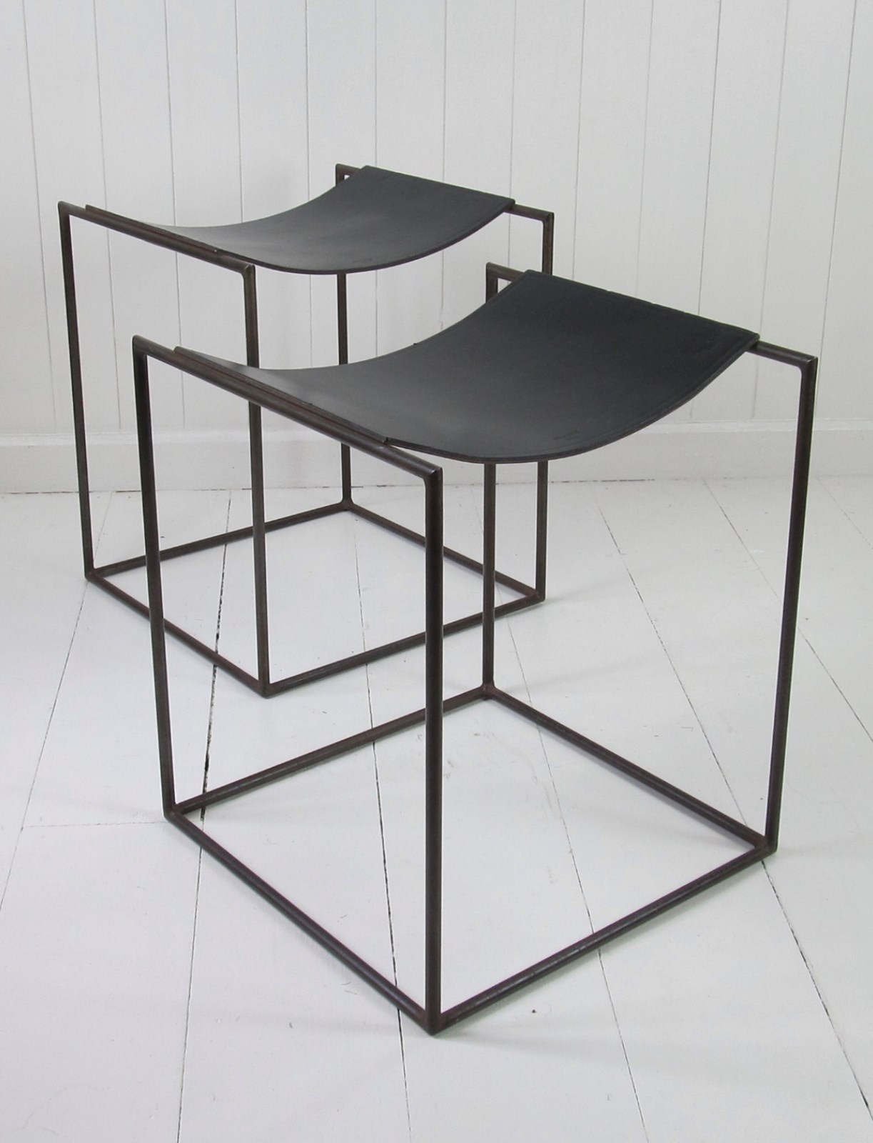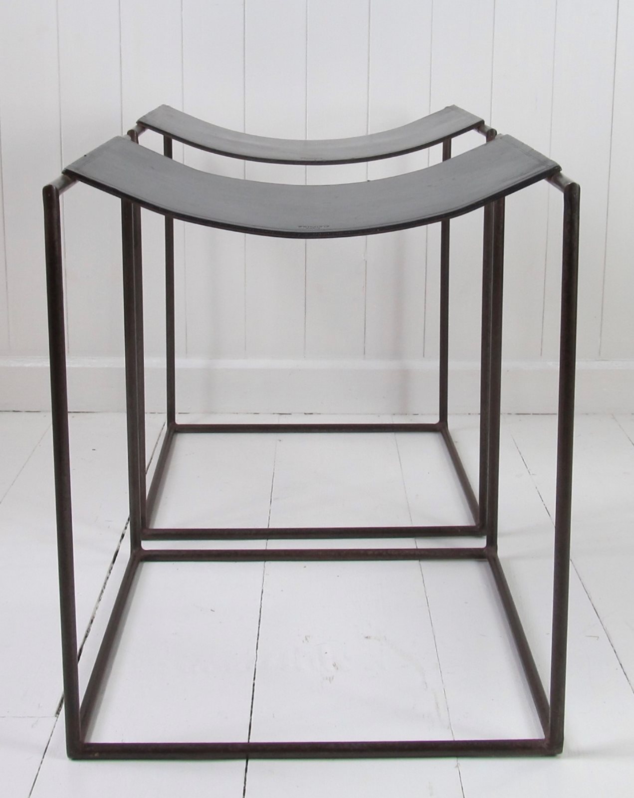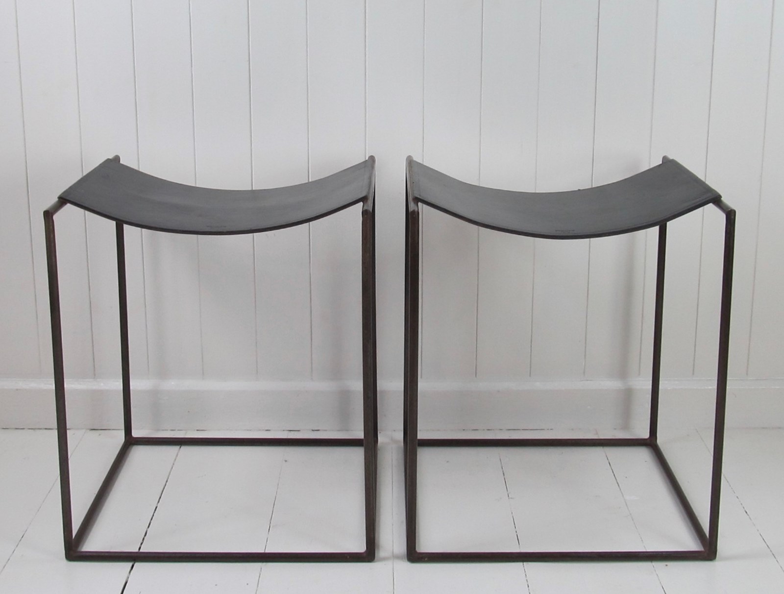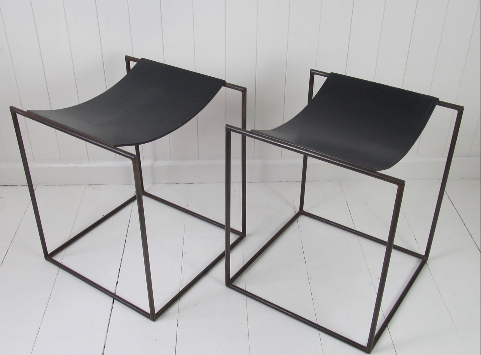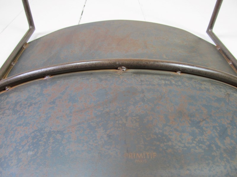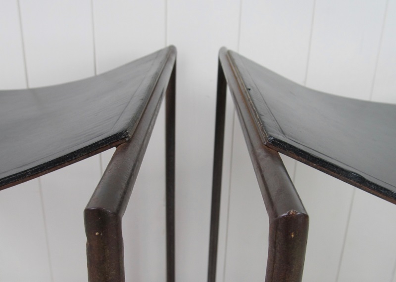A rare pair of patinated steel stools by Franck Robichez designed circa 1990 for Editions Primitif in Paris. The stools have the ‘Primitif Paris’ signature embossed on the black leather seats. The leather is in relatively good condition for its age, with a few small nicks and marks, and the distressing and slight rusting to the metal gives it a bronzed appearance and very interesting patina.