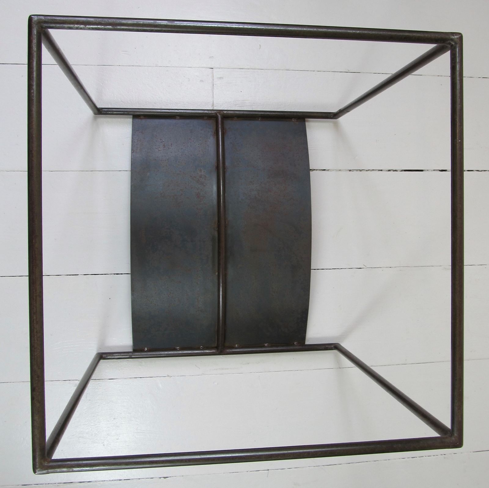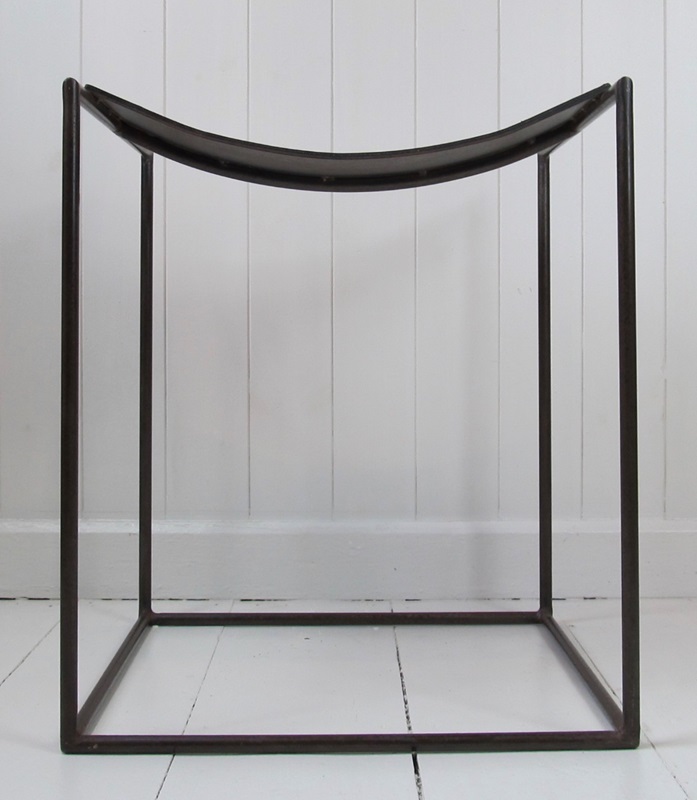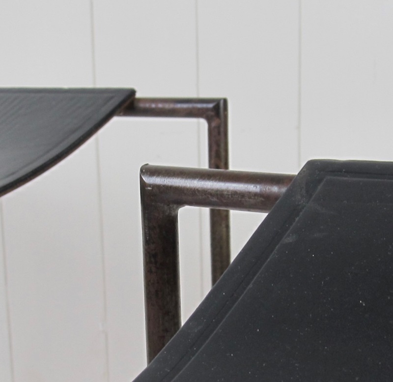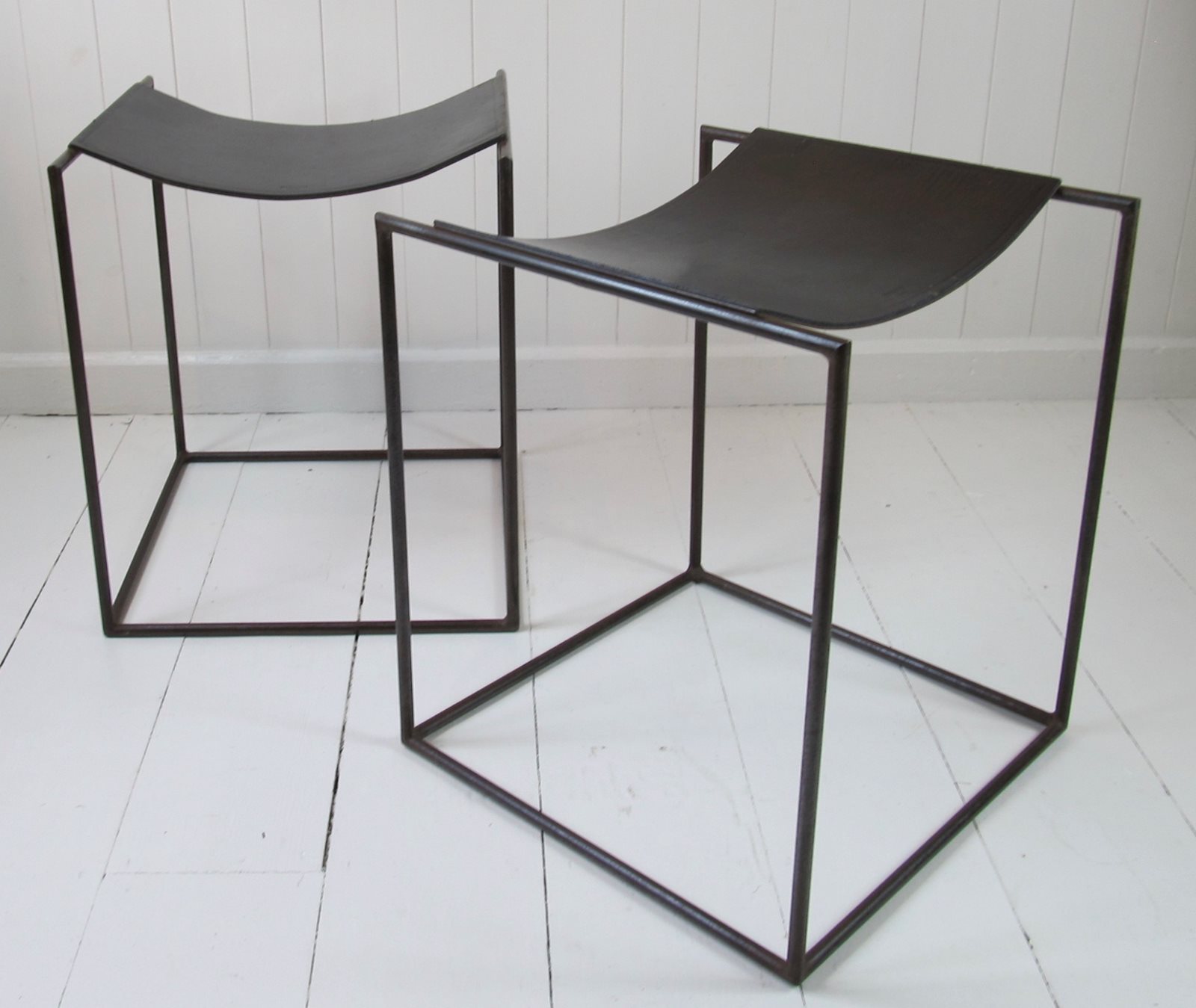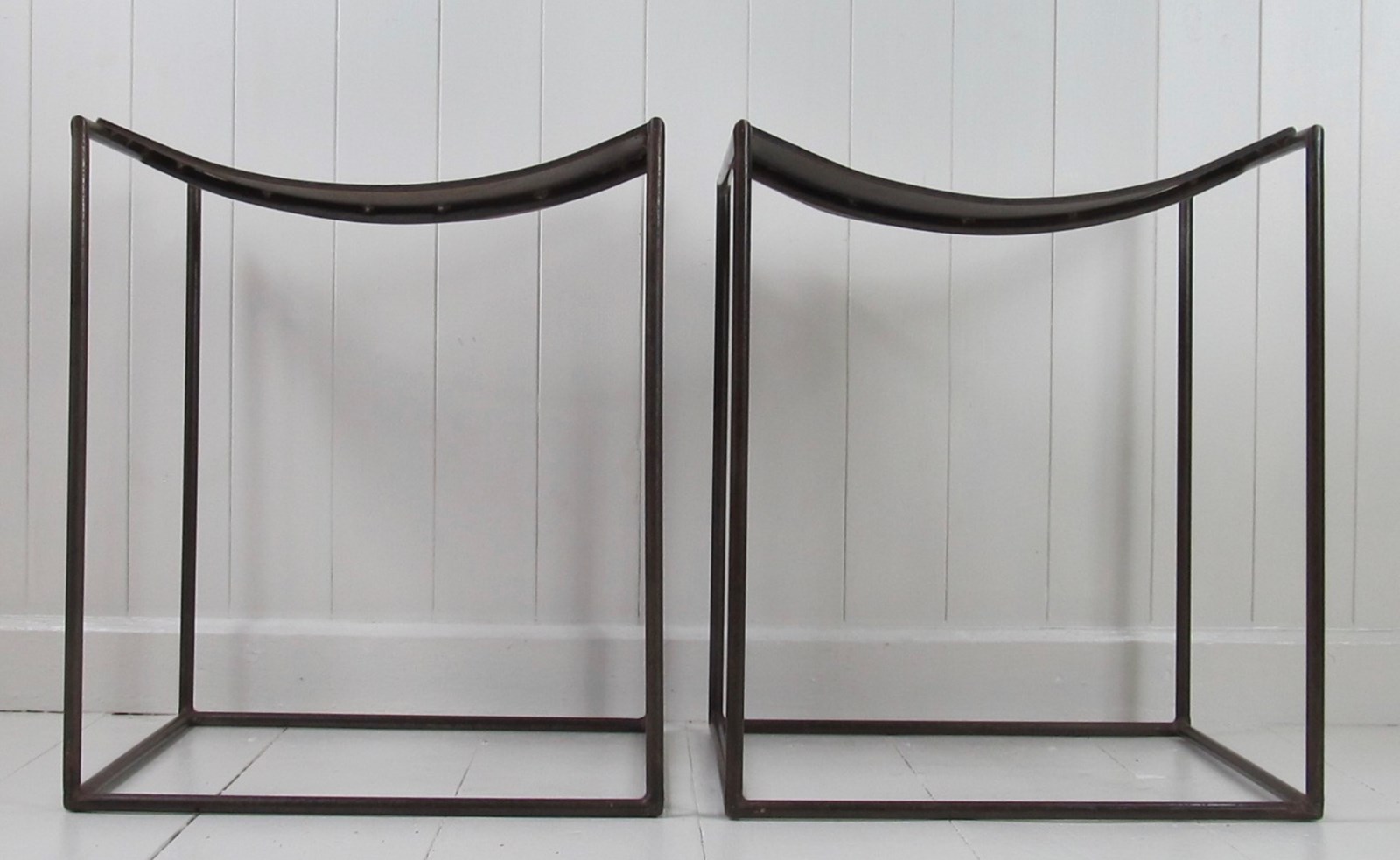 A rare pair of patinated steel stools by Franck Robichez designed circa 1990 for Editions Primitif in Paris. The stools have the ‘Primitif Paris’ signature embossed on the black leather seats. The leather is in relatively good condition for its age, with a few small nicks and marks, and the distressing and slight rusting to the metal gives it a bronzed appearance and very interesting patina.