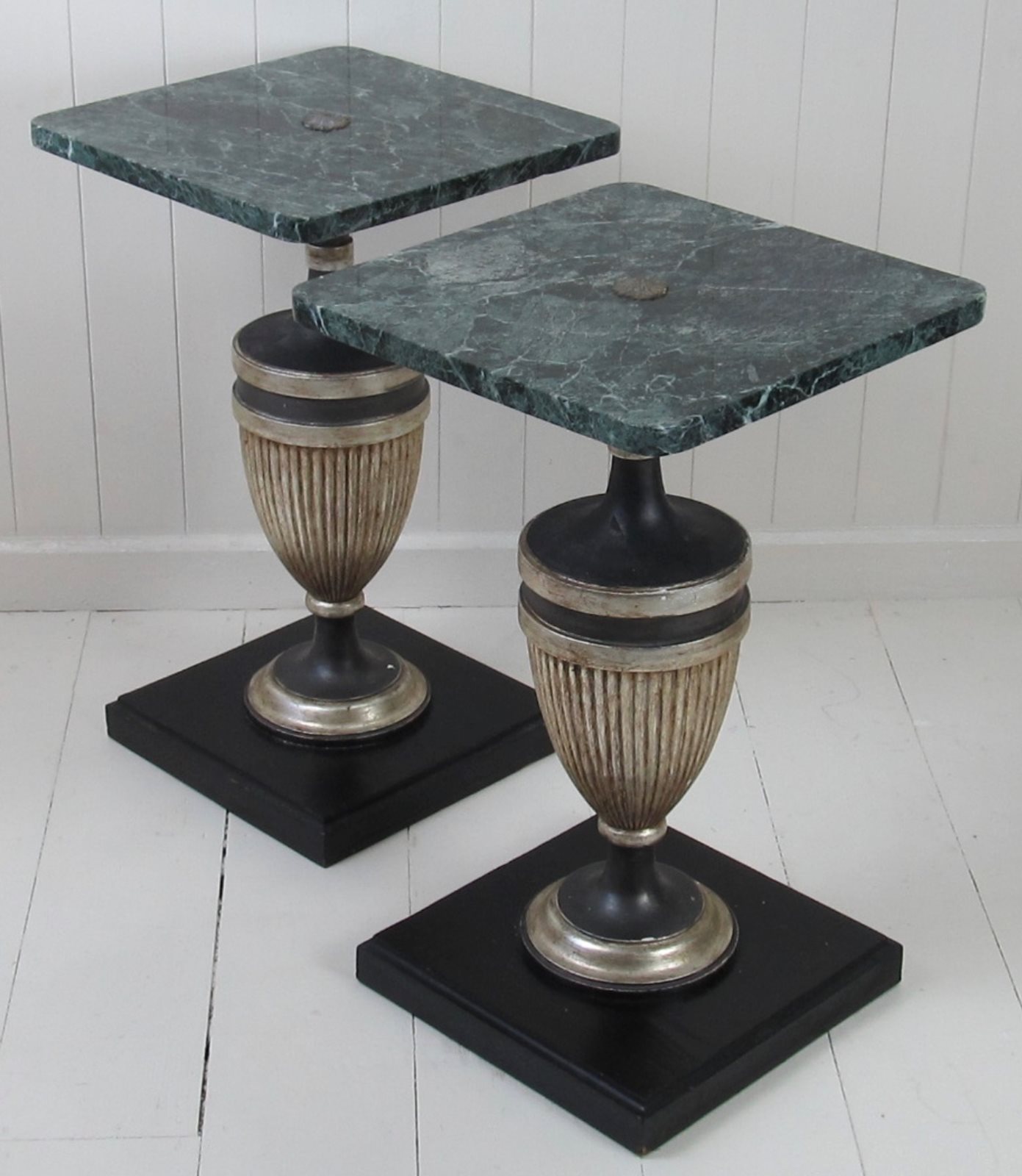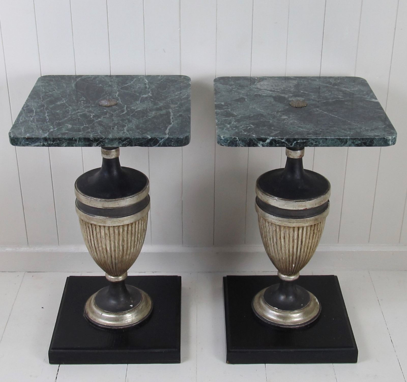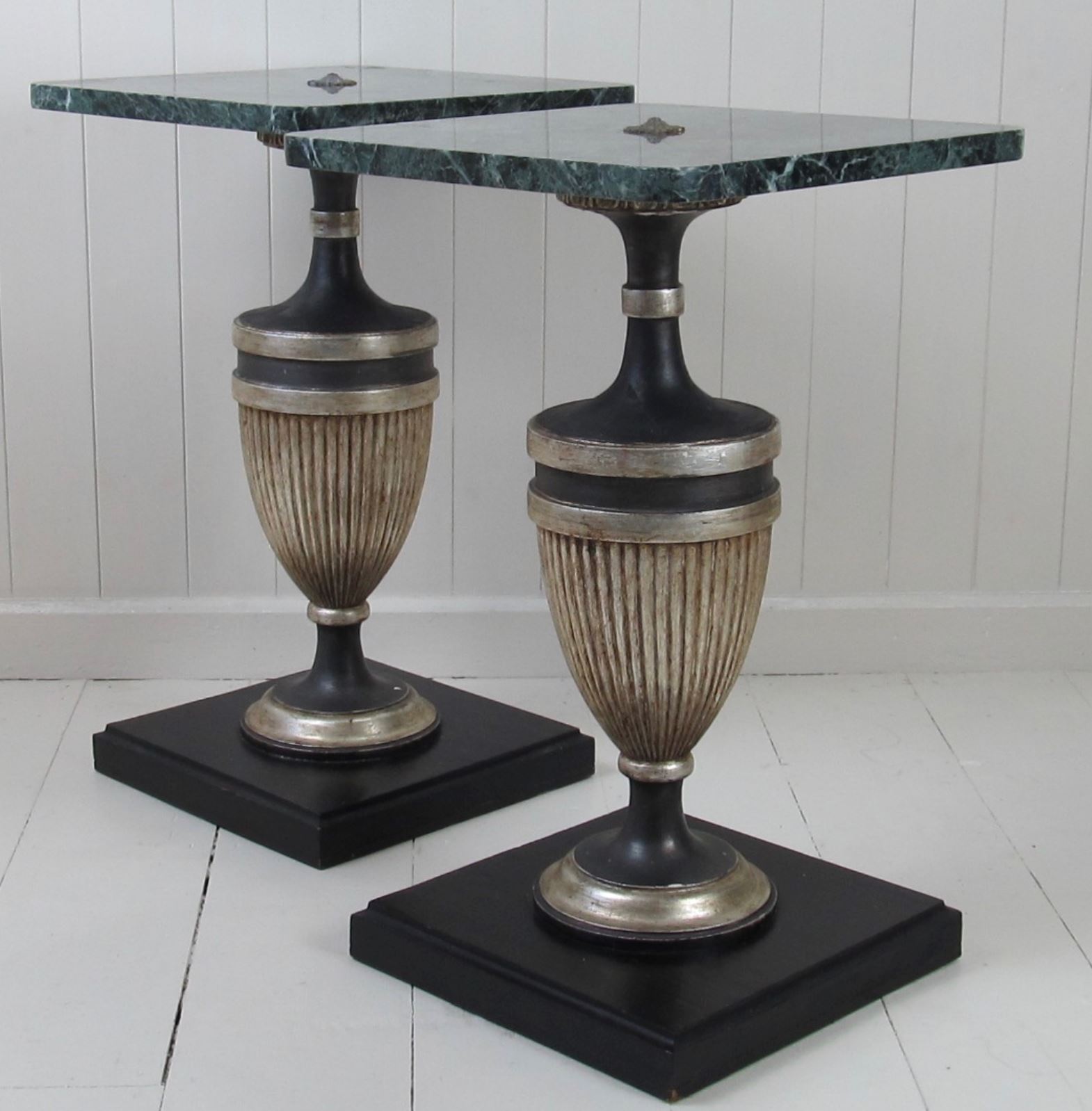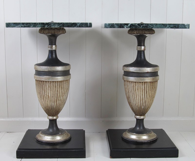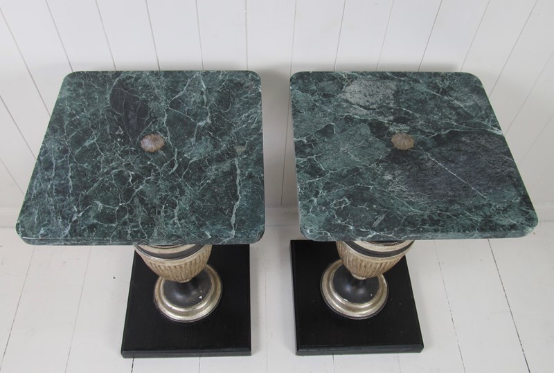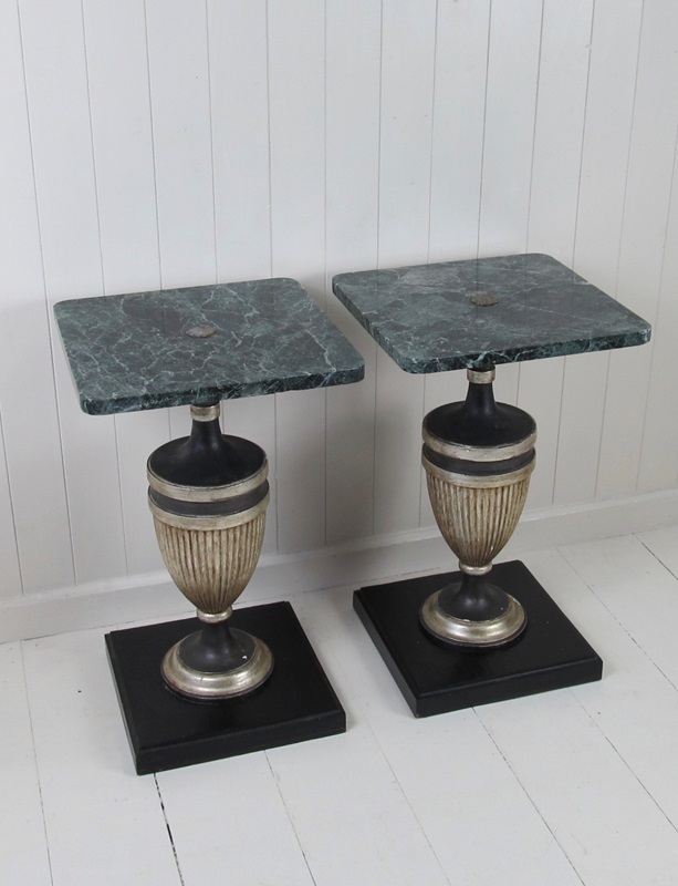 A very unusual pair of marble top tables with painted wood baluster bases. These are small tables but the rich dark green marble combined with the strong outline of the baluster supports give them tremendous impact. The marble tops are in good condition with no cracks. They have rounded corners and a (slightly raised) central flower-shaped metal finial detail in the centre.