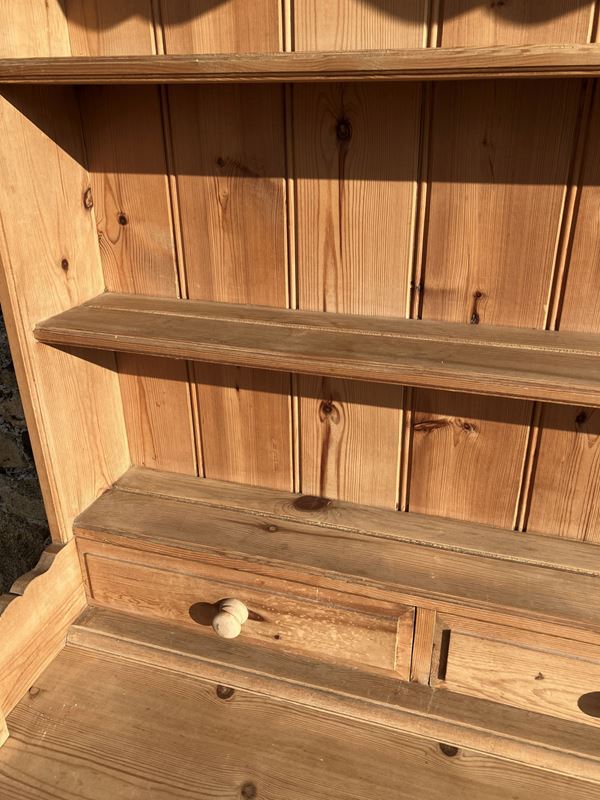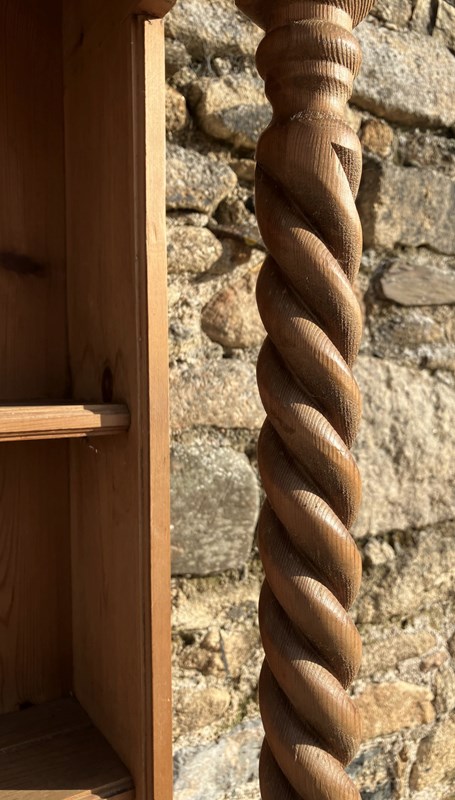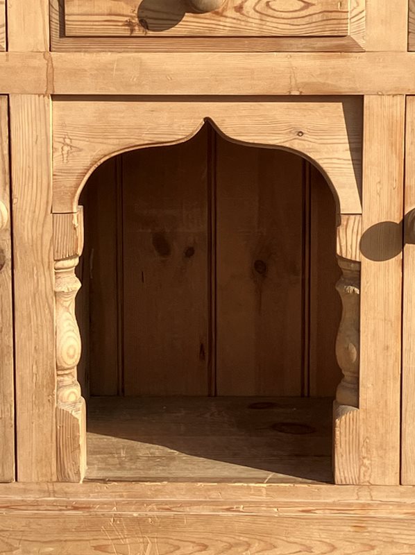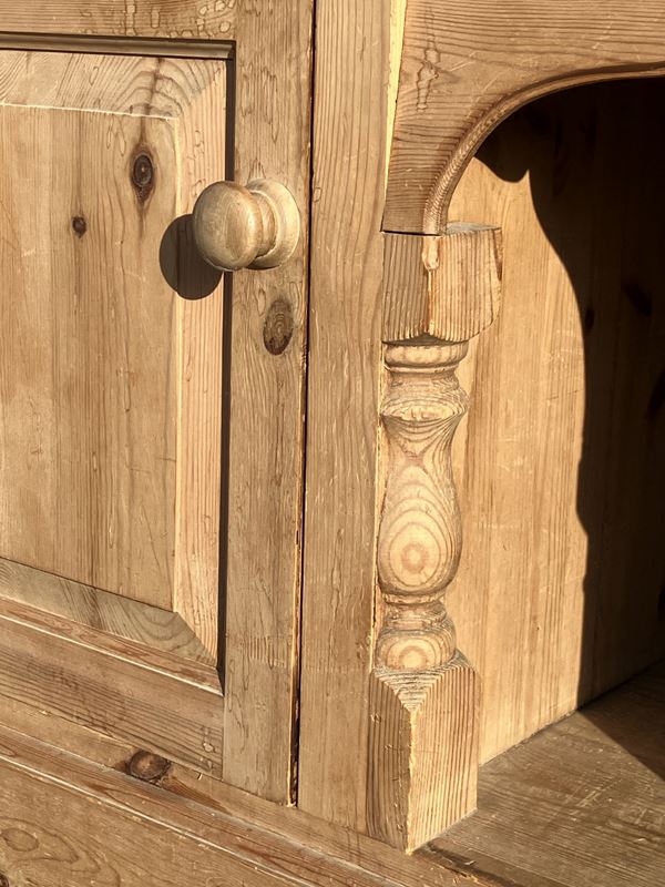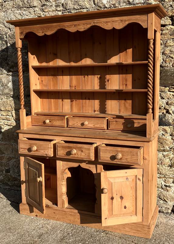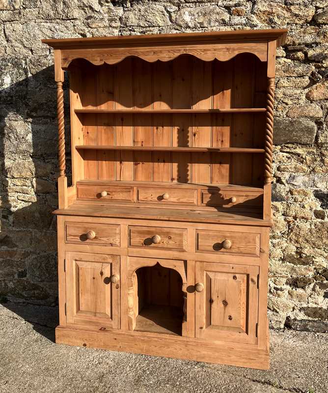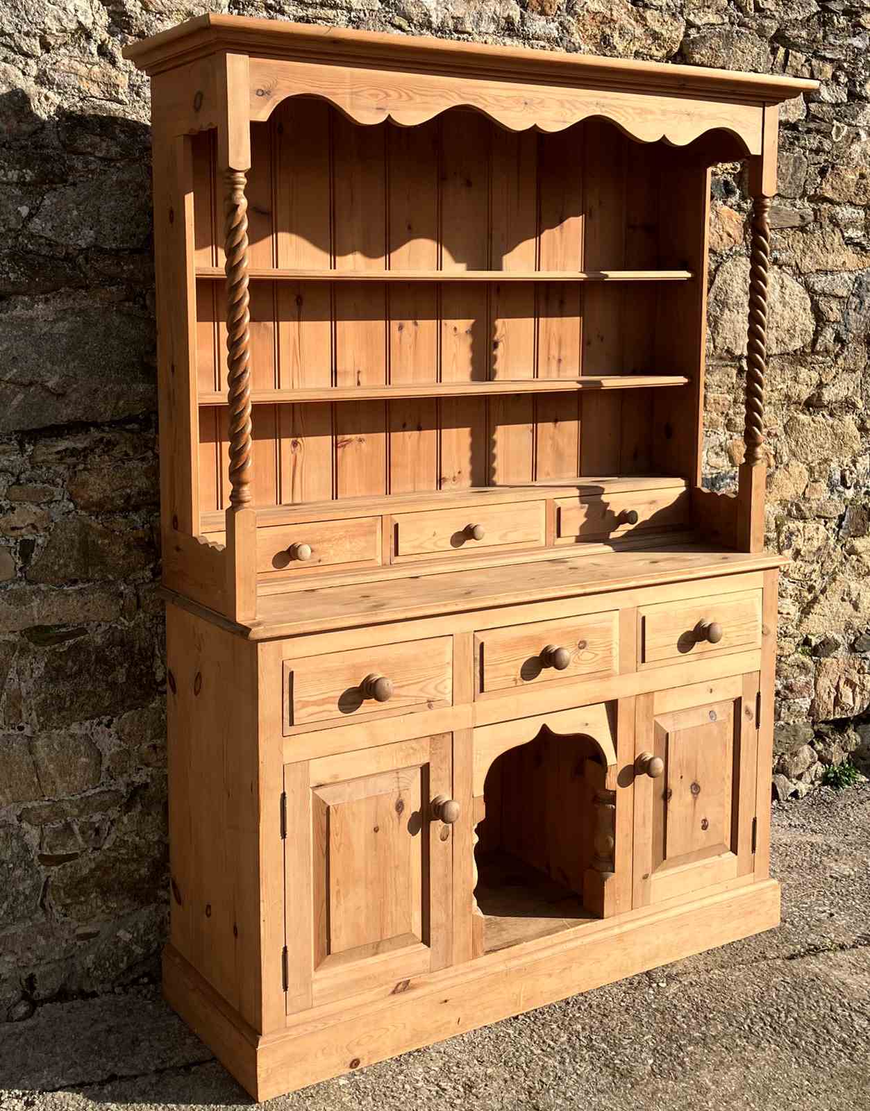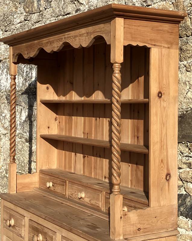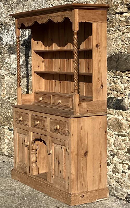 This pine dresser has a rich, warm colour to the wood, with attractive barley twist columns on the upper section and characterful ‘dog kennel’ opening in between the two cupboards on the lower section.