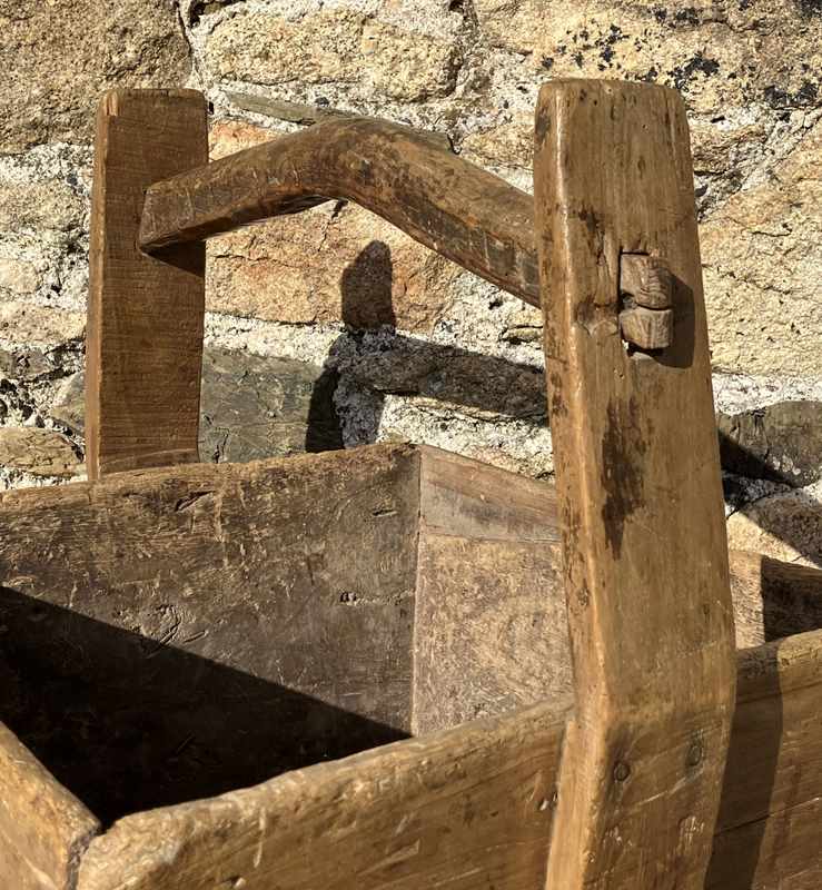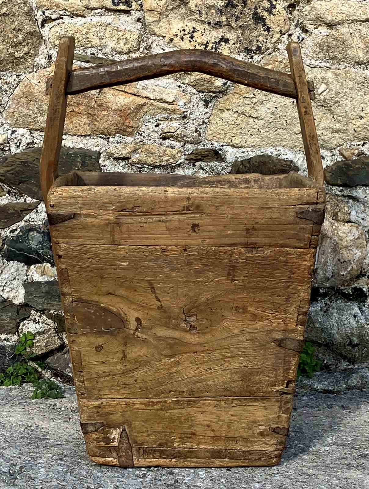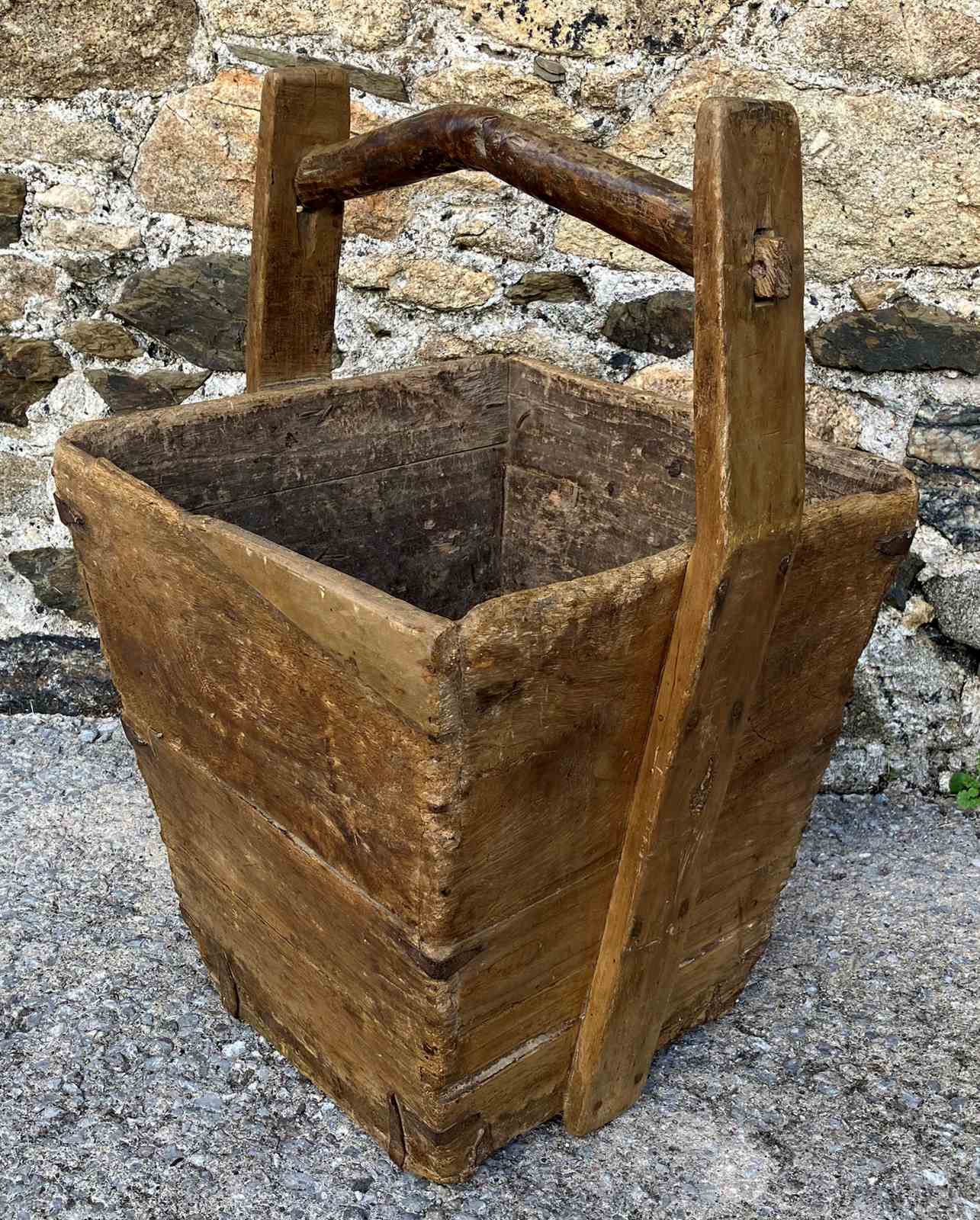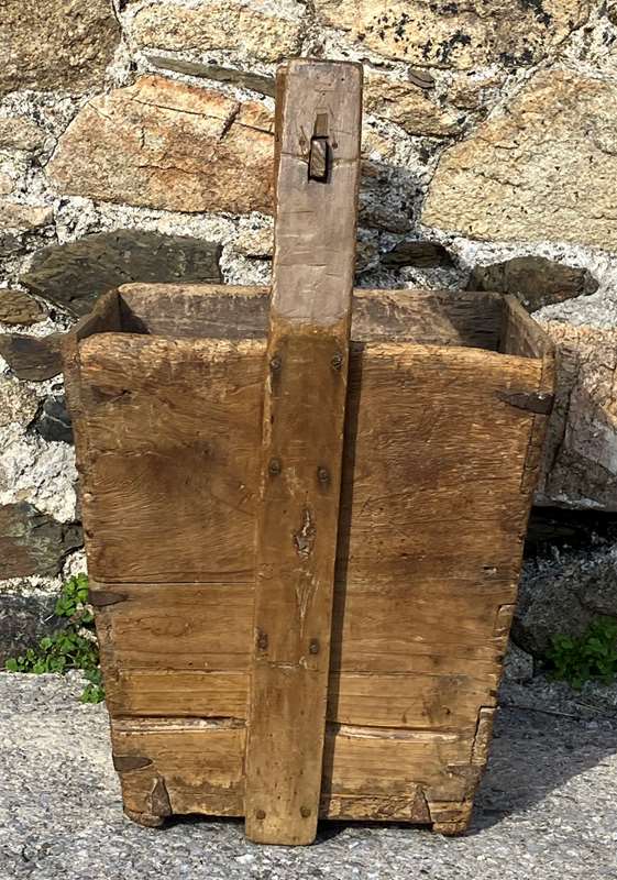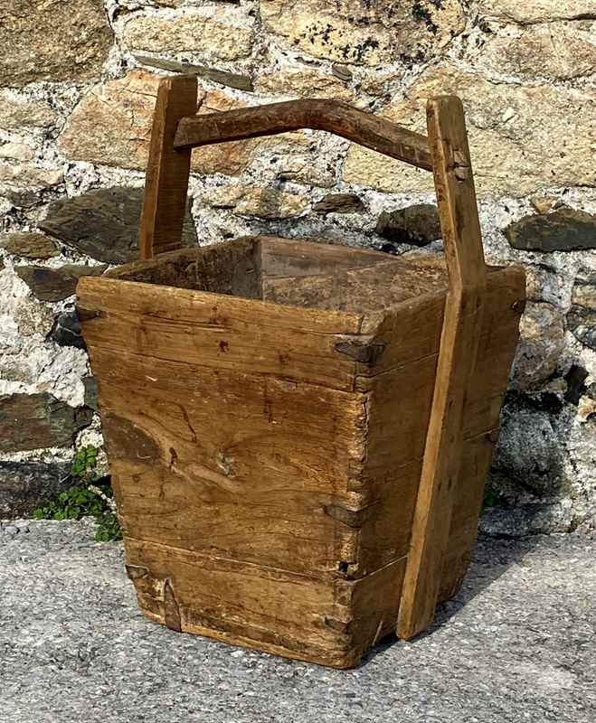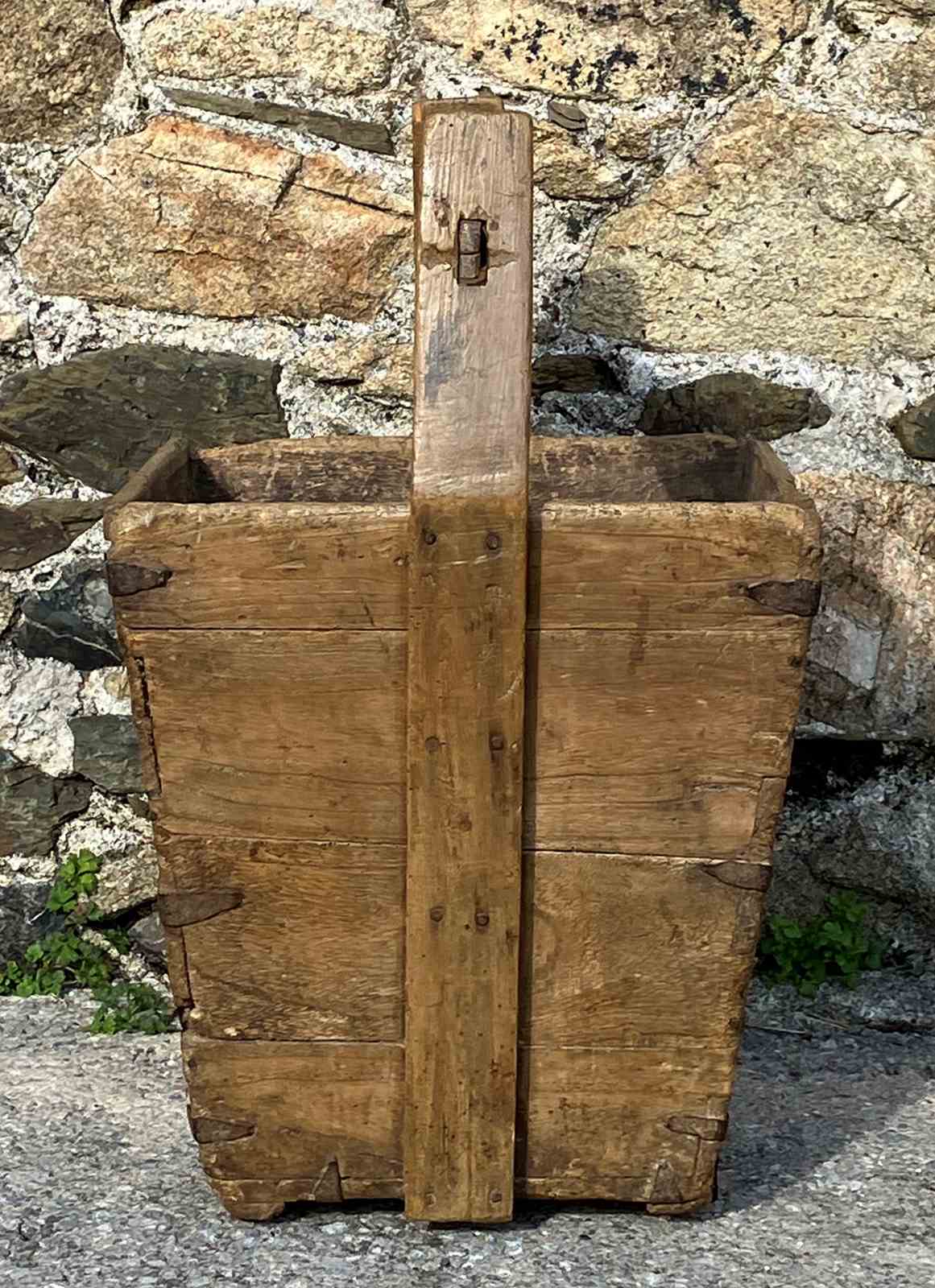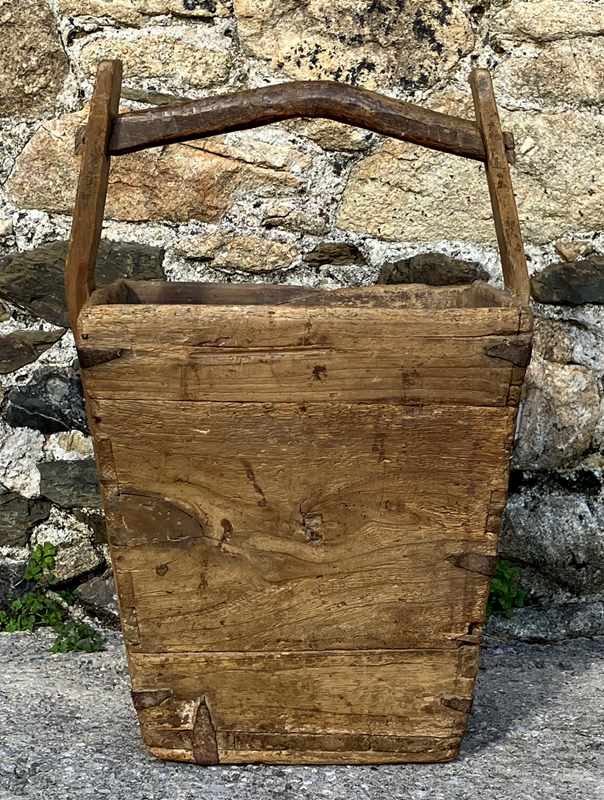 Beautiful, rustic antique Chinese bucket with bent wood pegged handle and metal braces to the corners. This would have been used for carrying rice and would make a great storage container for logs or kindling.