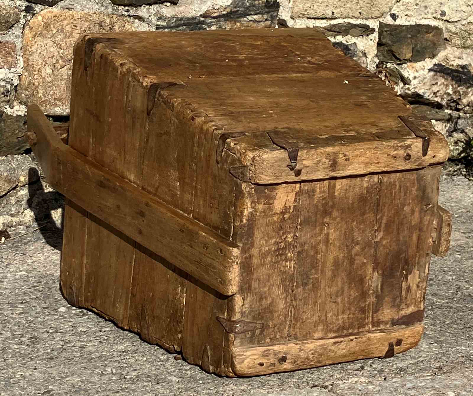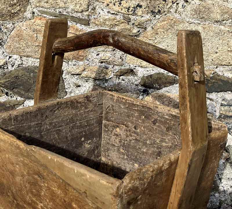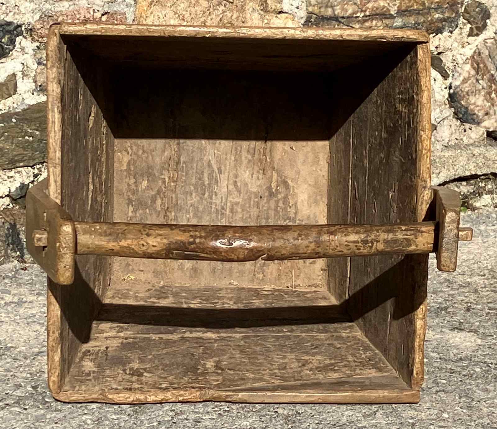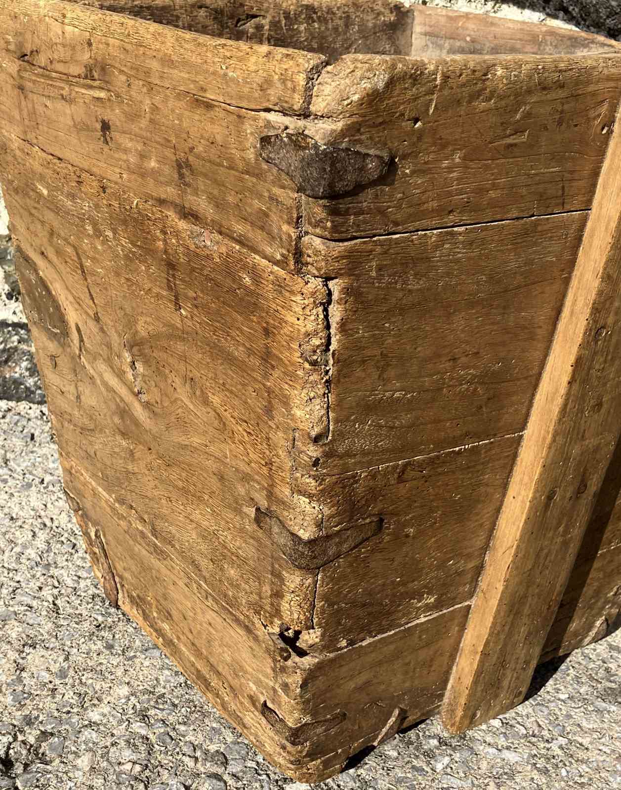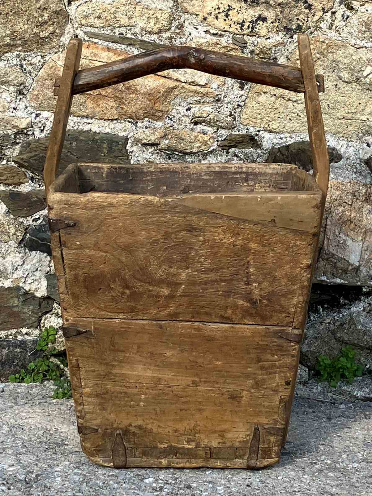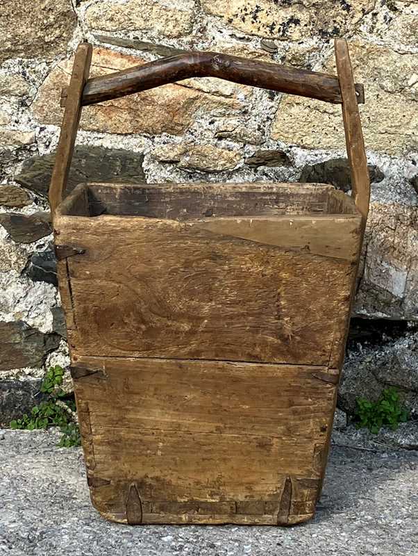 Beautiful, rustic antique Chinese bucket with bent wood pegged handle and metal braces to the corners. This would have been used for carrying rice and would make a great storage container for logs or kindling.
