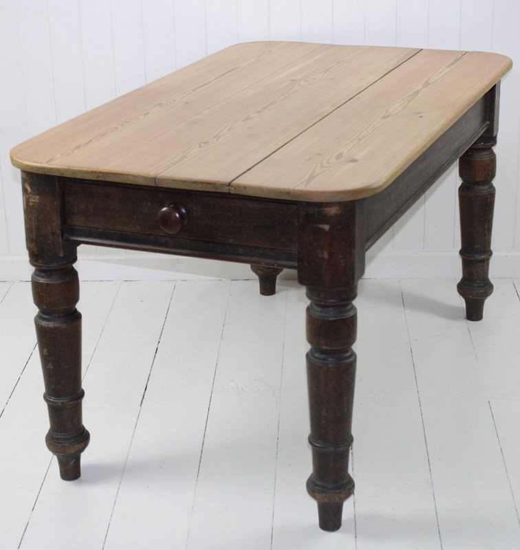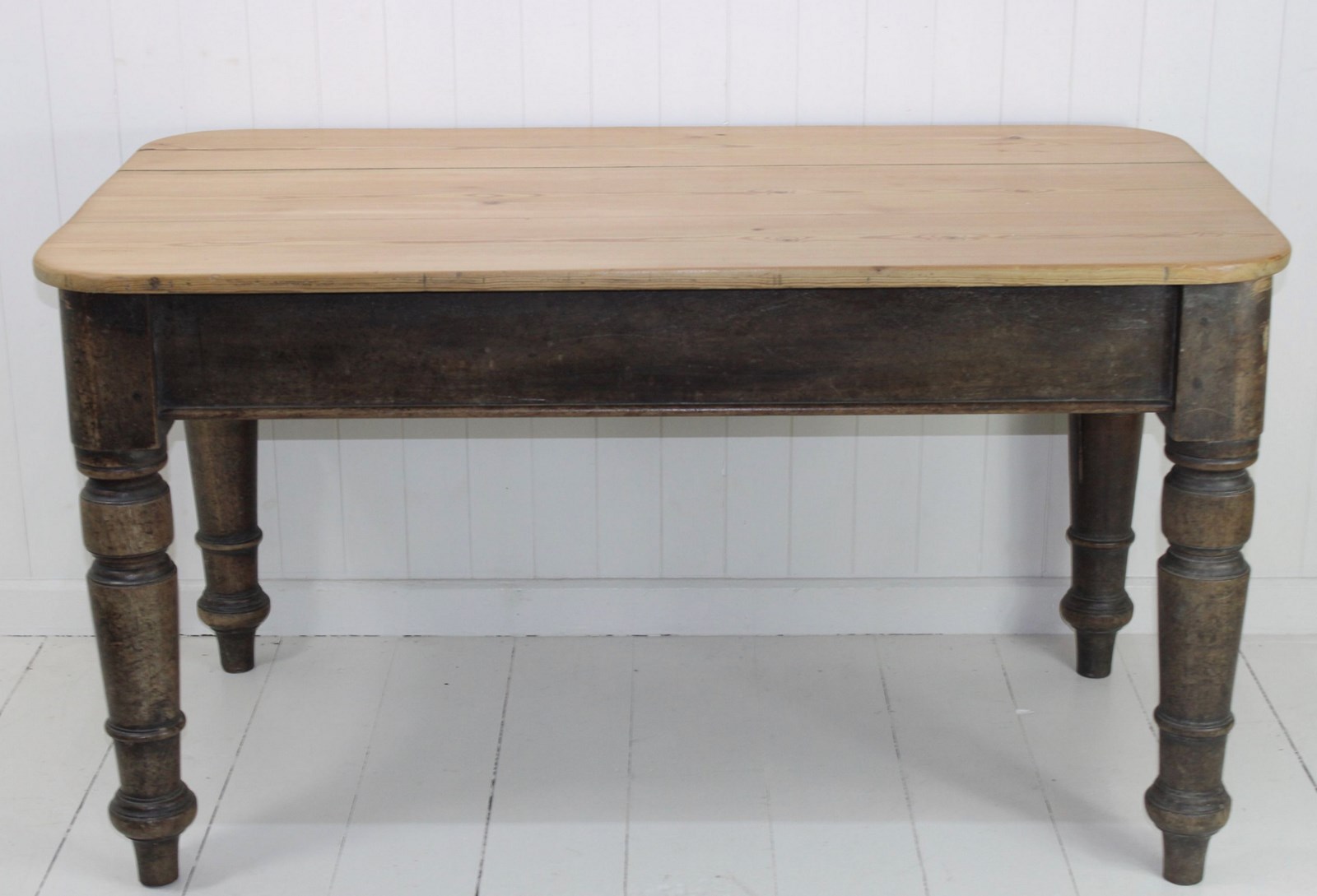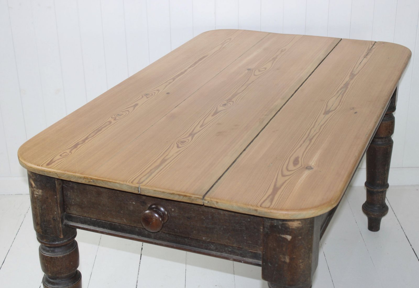 The turned legs and skirt are in the original aged dark finish, and the pitch pine three-plank top has been sanded and lightly waxed to highlight the attractive grain in the wood.