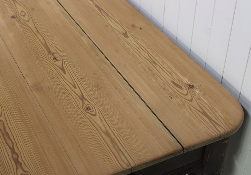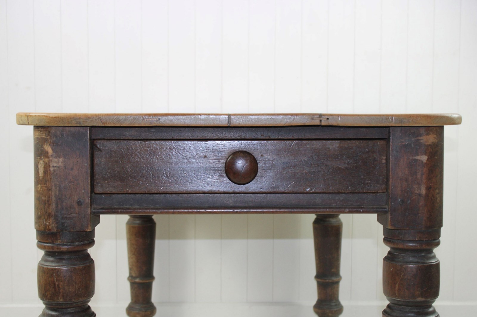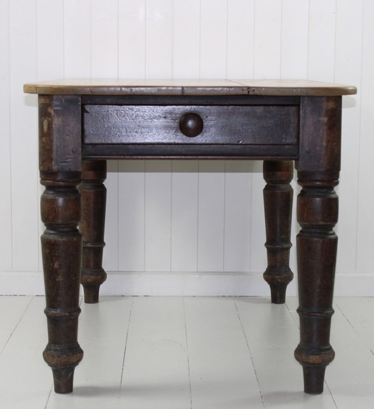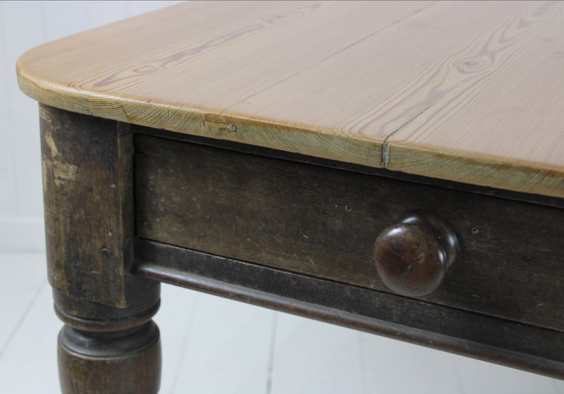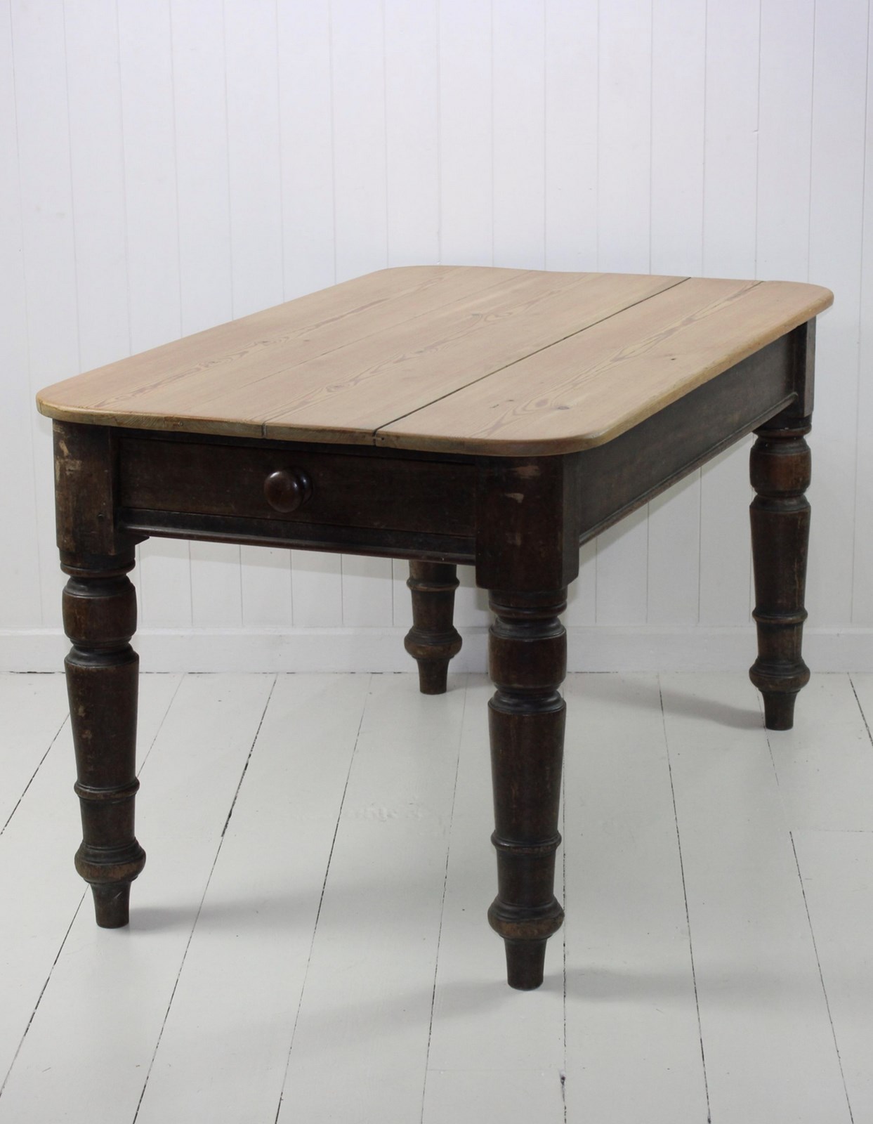 The turned legs and skirt are in the original aged dark finish, and the pitch pine three-plank top has been sanded and lightly waxed to highlight the attractive grain in the wood.