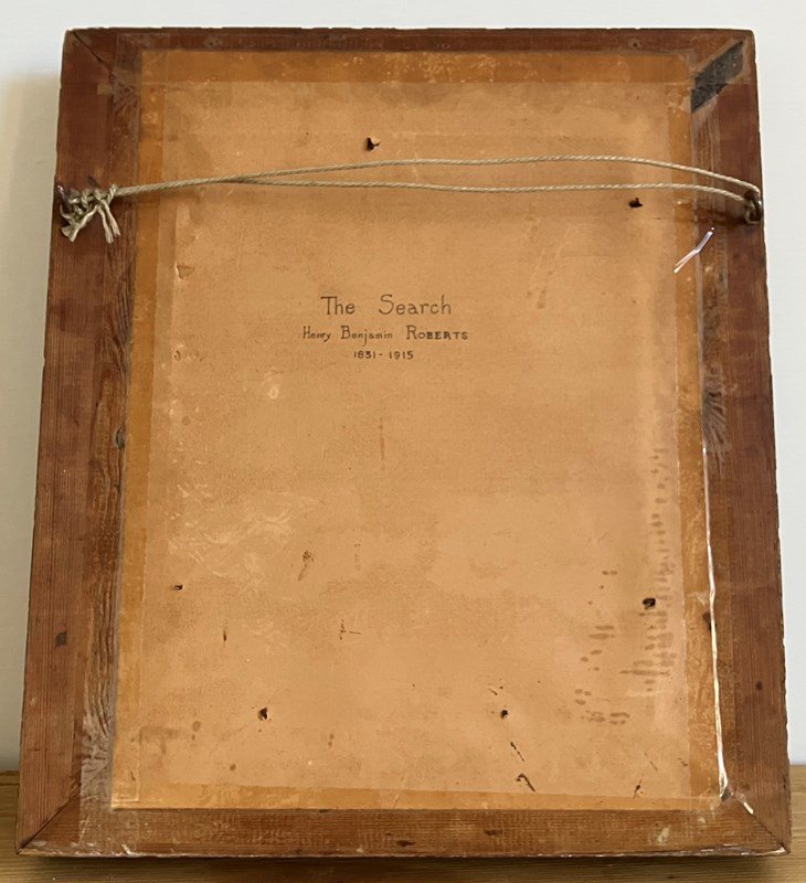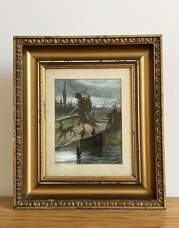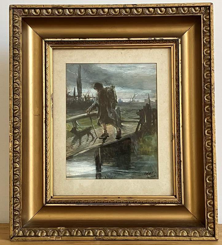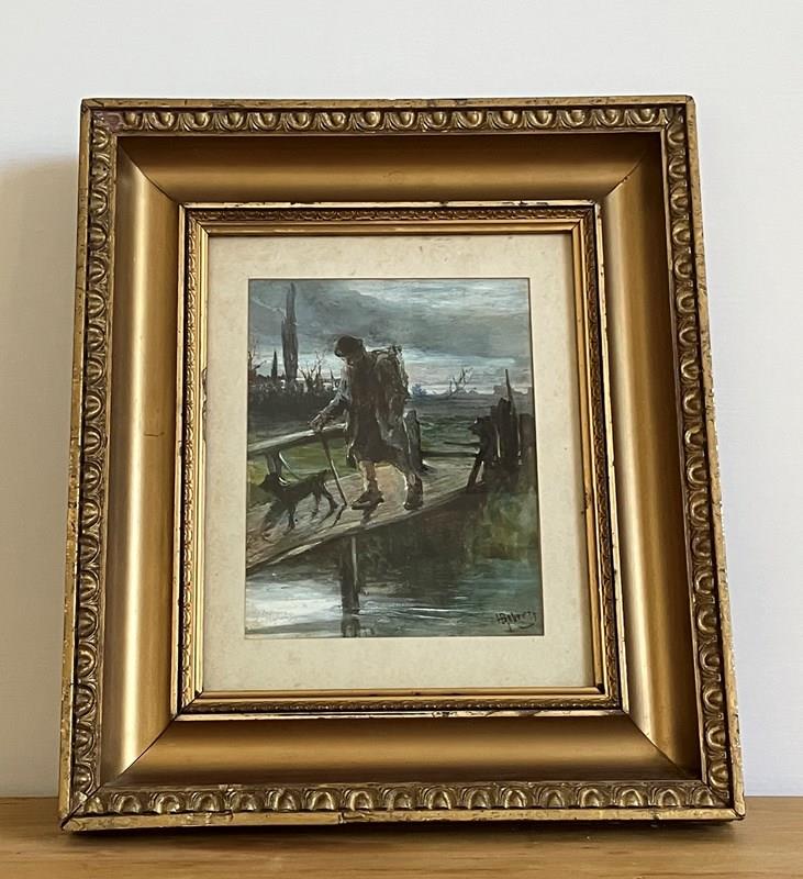 ‘The Search’ by Henry Benjamin Roberts (1831-1915). A very charming, evocative mixed media painting of a man and his little black dog crossing a wooden footbridge over a river. In original gilt frame with a few small dents, but overall in very good condition for its age.