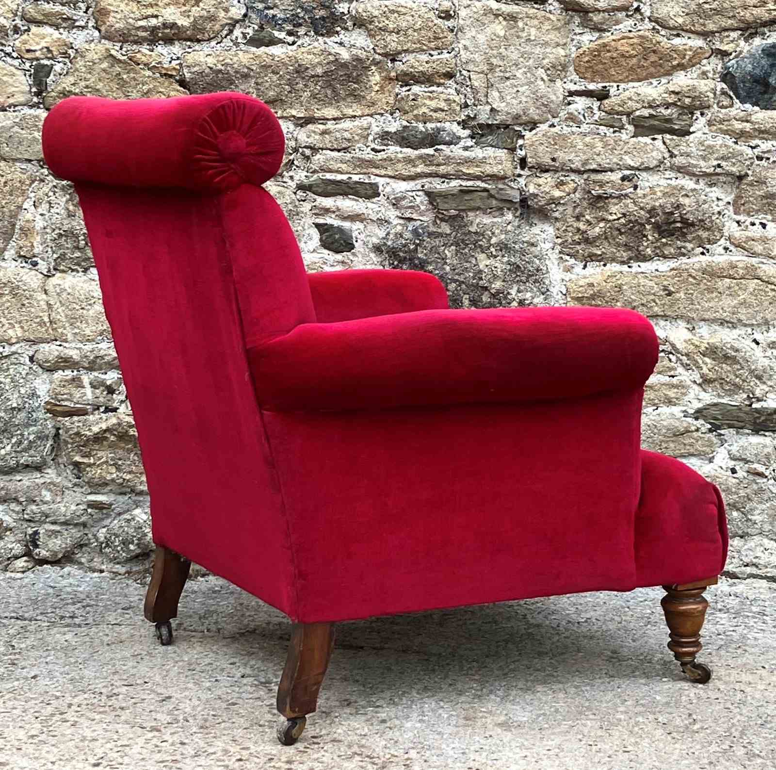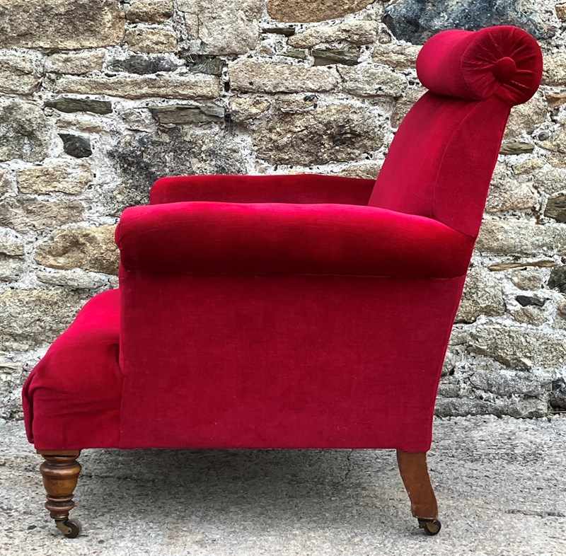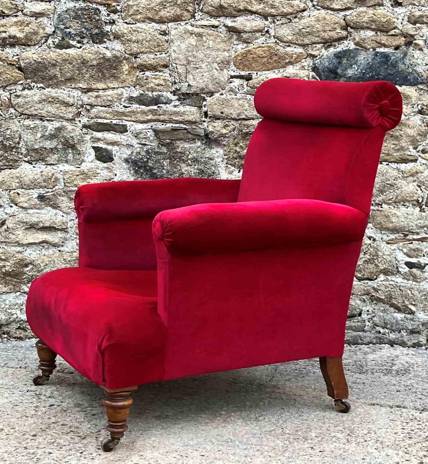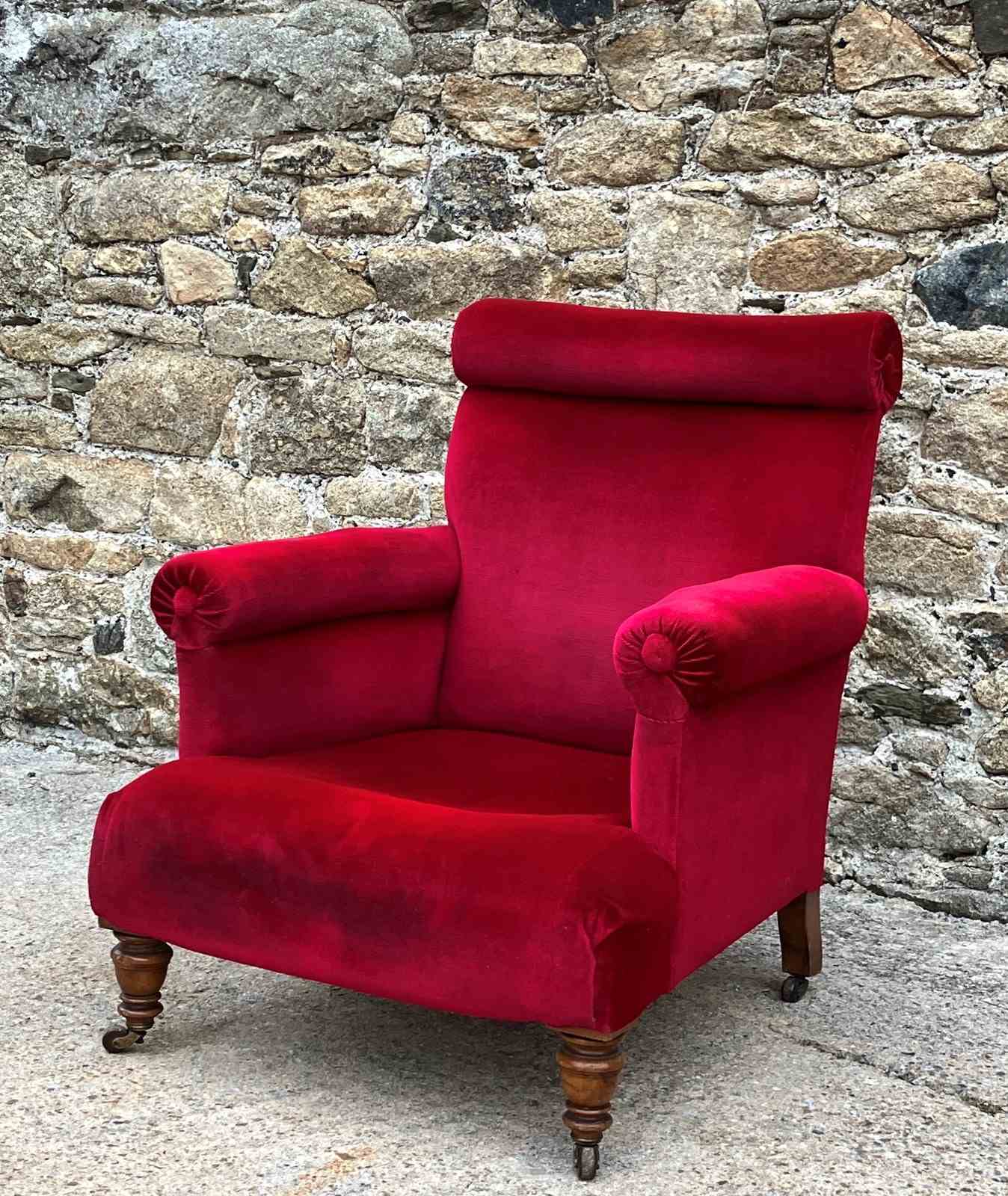 Great example of a Victorian roll top armchair with bolster arms, turned front legs, ceramic castors and button detail to the back and arms. This chair has a generous deep seat in typical 19th century English country house style. It’s rare to find one of these roll top chairs in such sturdy condition, and this will look stunning after reupholstery.