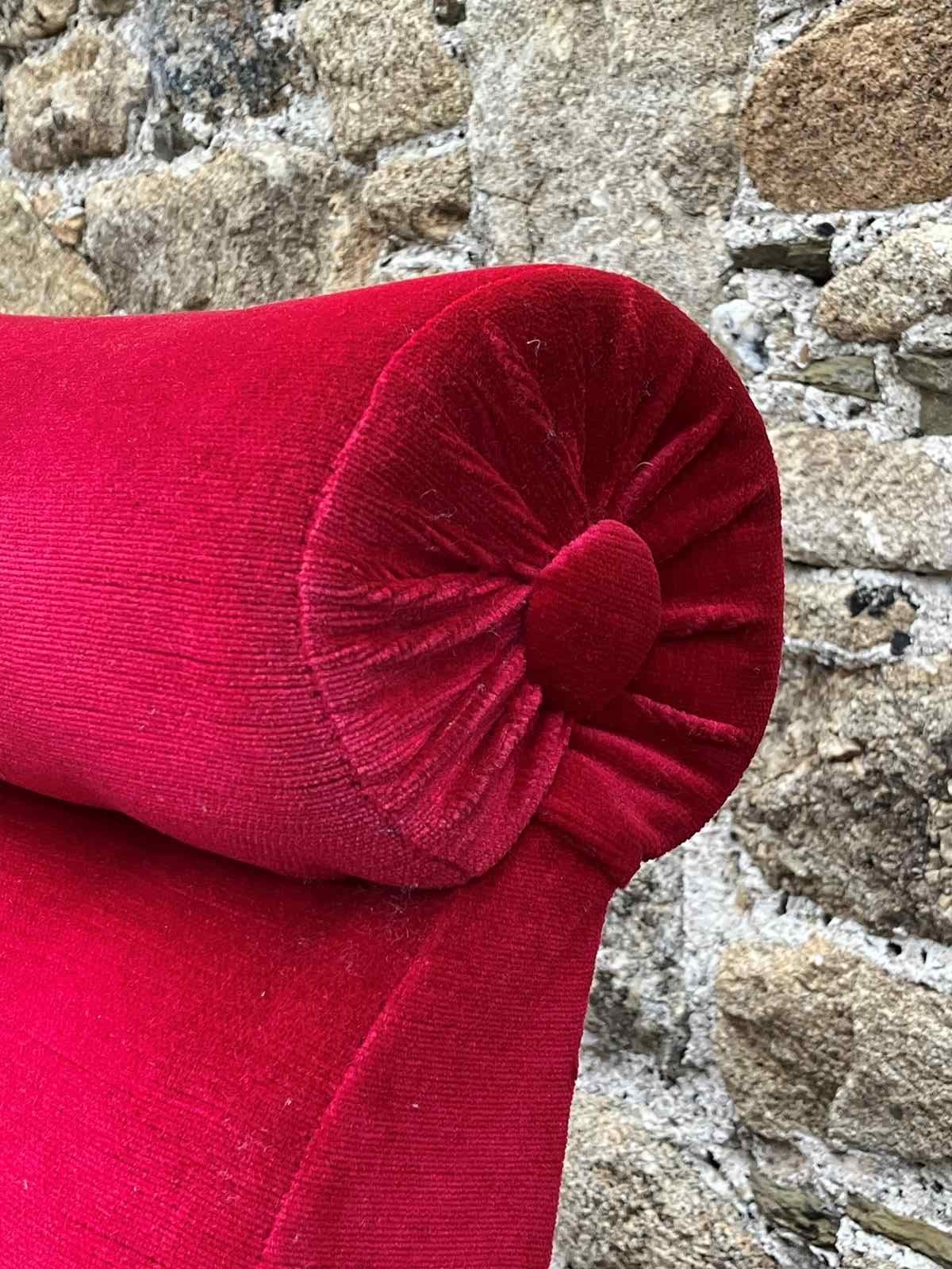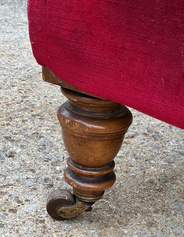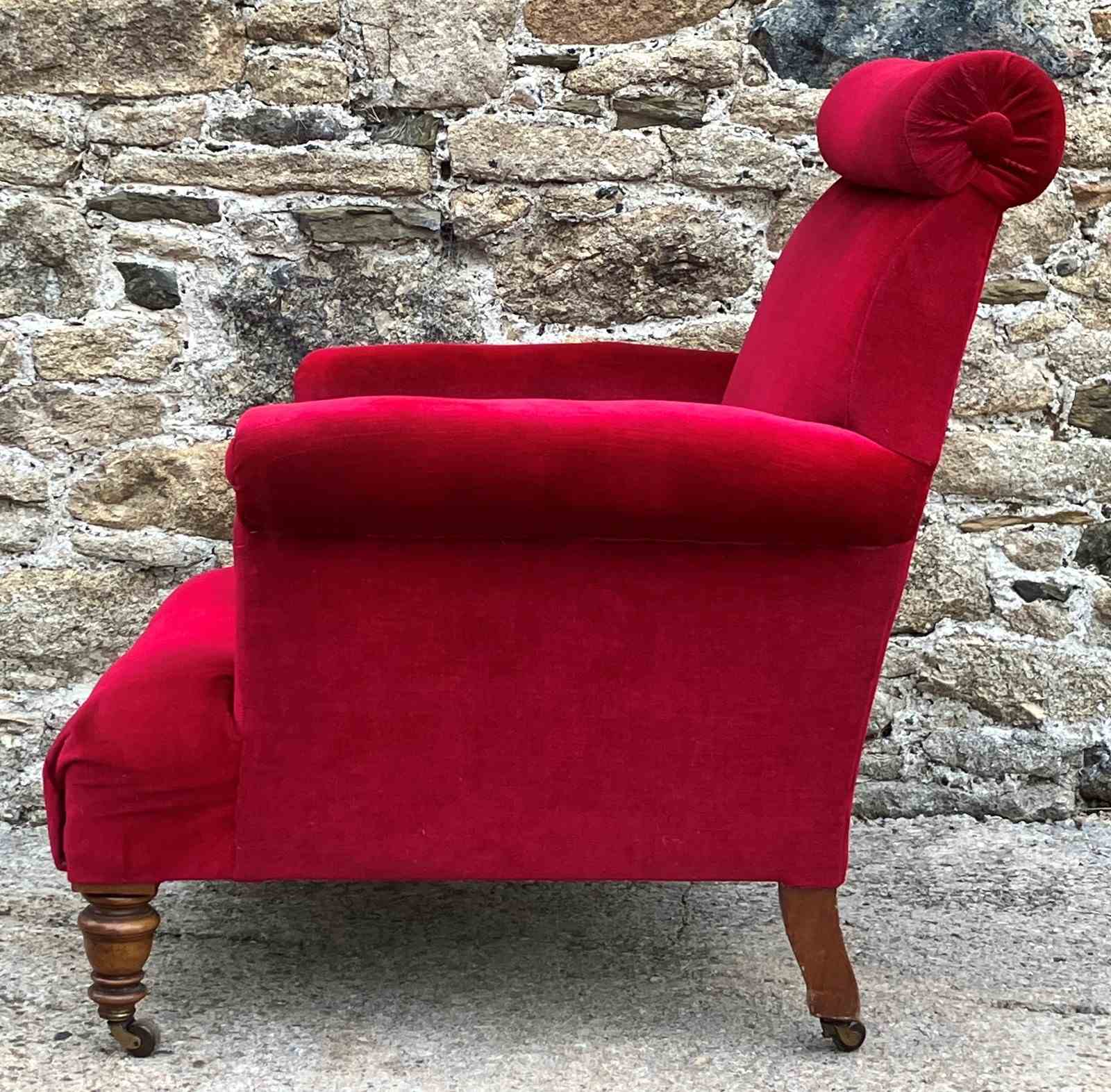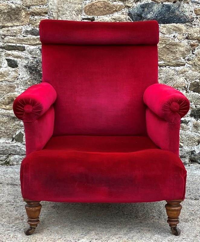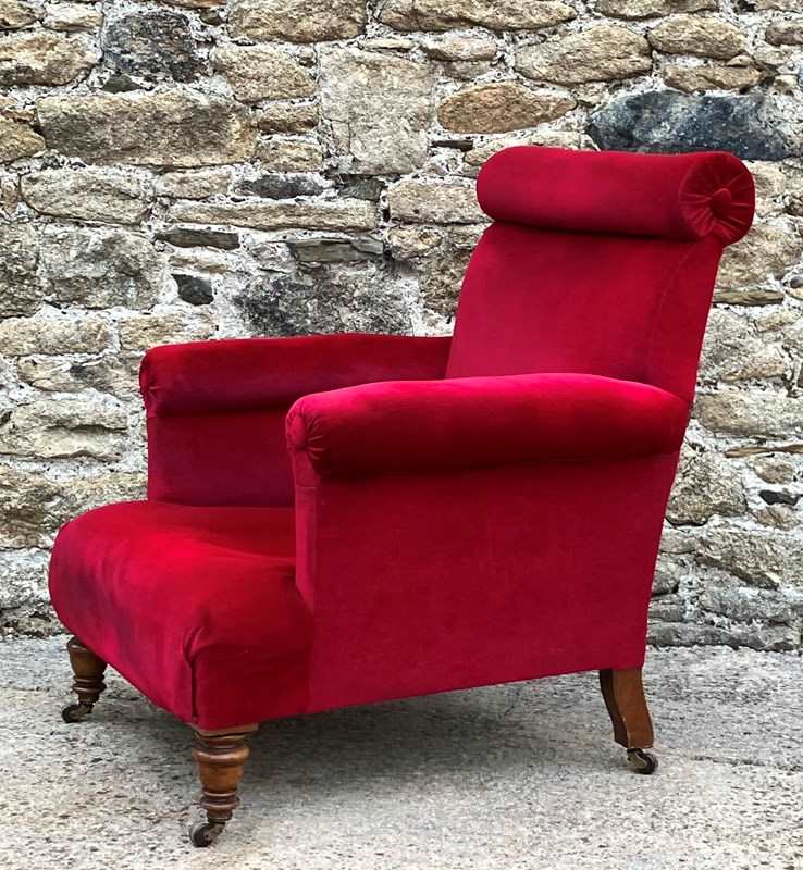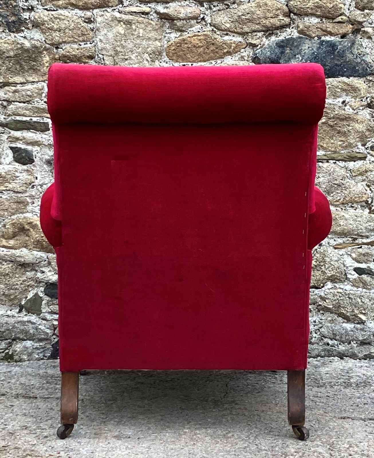 Great example of a Victorian roll top armchair with bolster arms, turned front legs, ceramic castors and button detail to the back and arms. This chair has a generous deep seat in typical 19th century English country house style. It’s rare to find one of these roll top chairs in such sturdy condition, and this will look stunning after reupholstery.