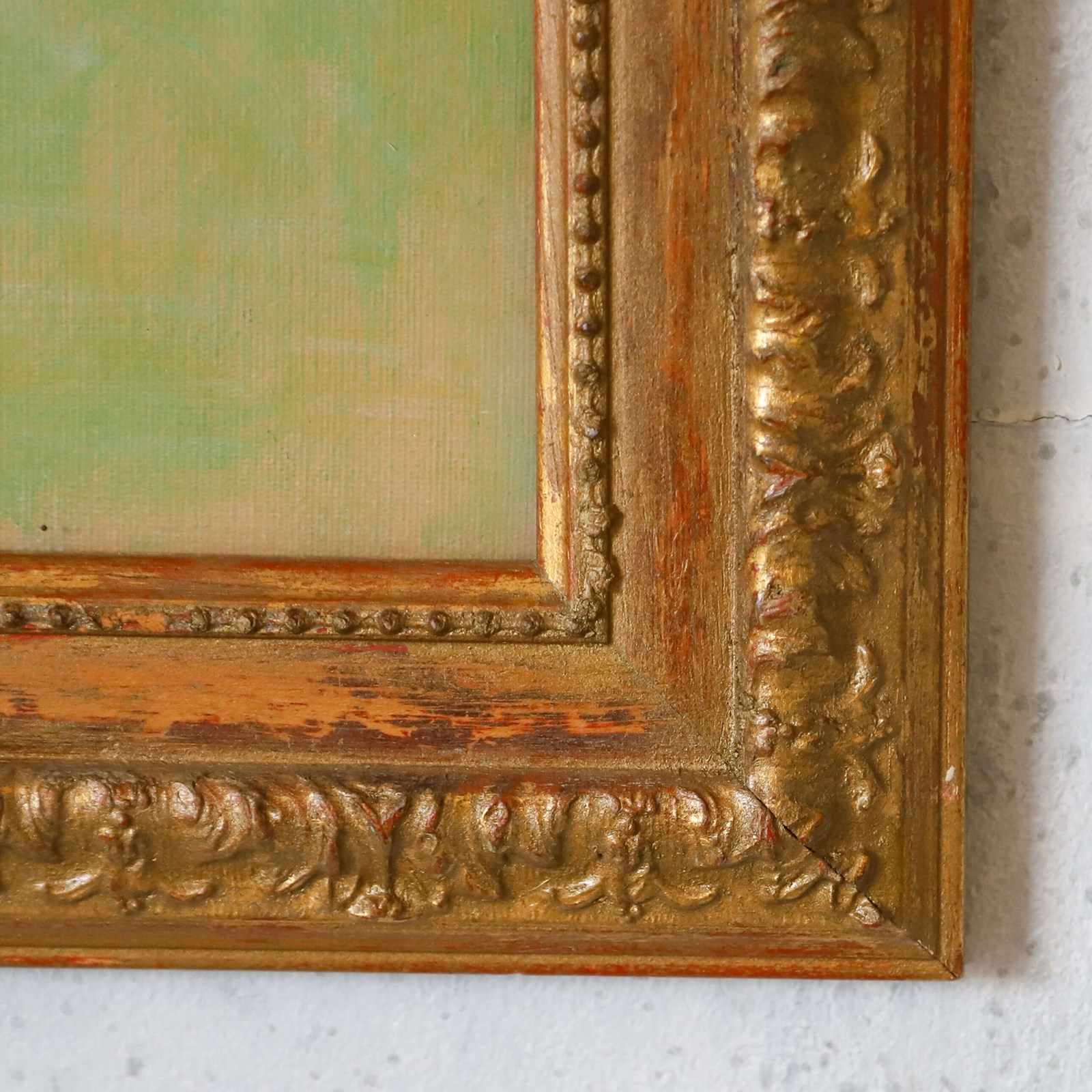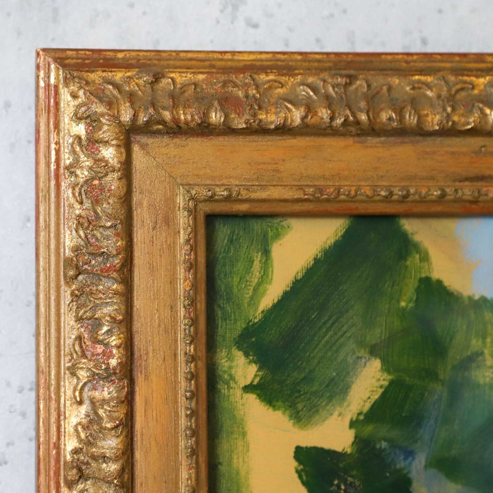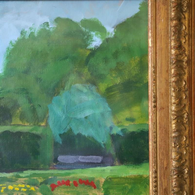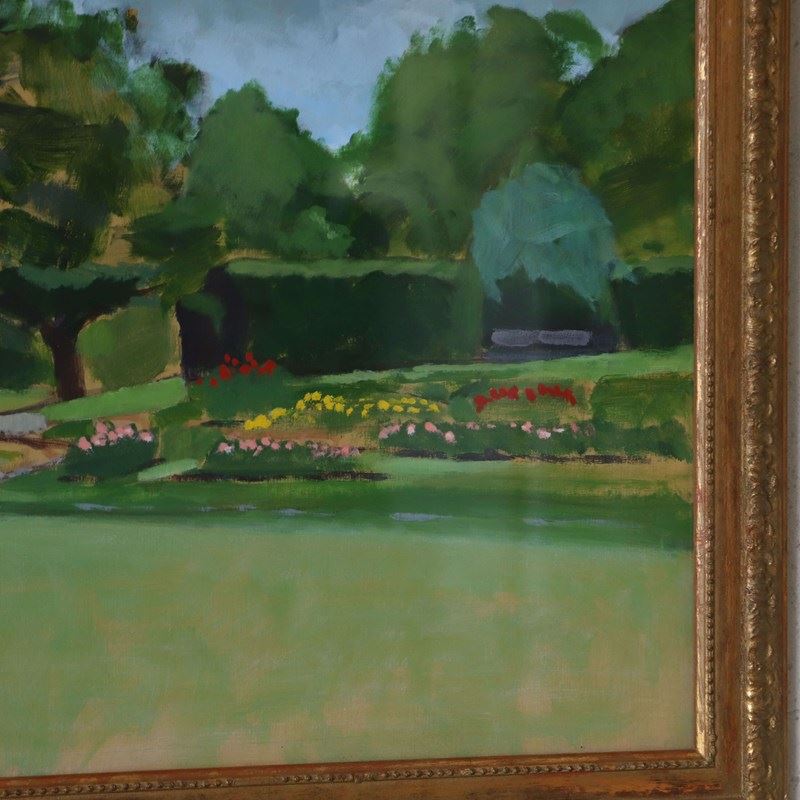 Painted in 2017 in acrylic by Scottish painter Michael Strain, a graduate of Glasgow School of Art, it depicts a colourful corner of the garden at Pembroke Lodge. It has been framed in a decorative gilt frame and glazed.