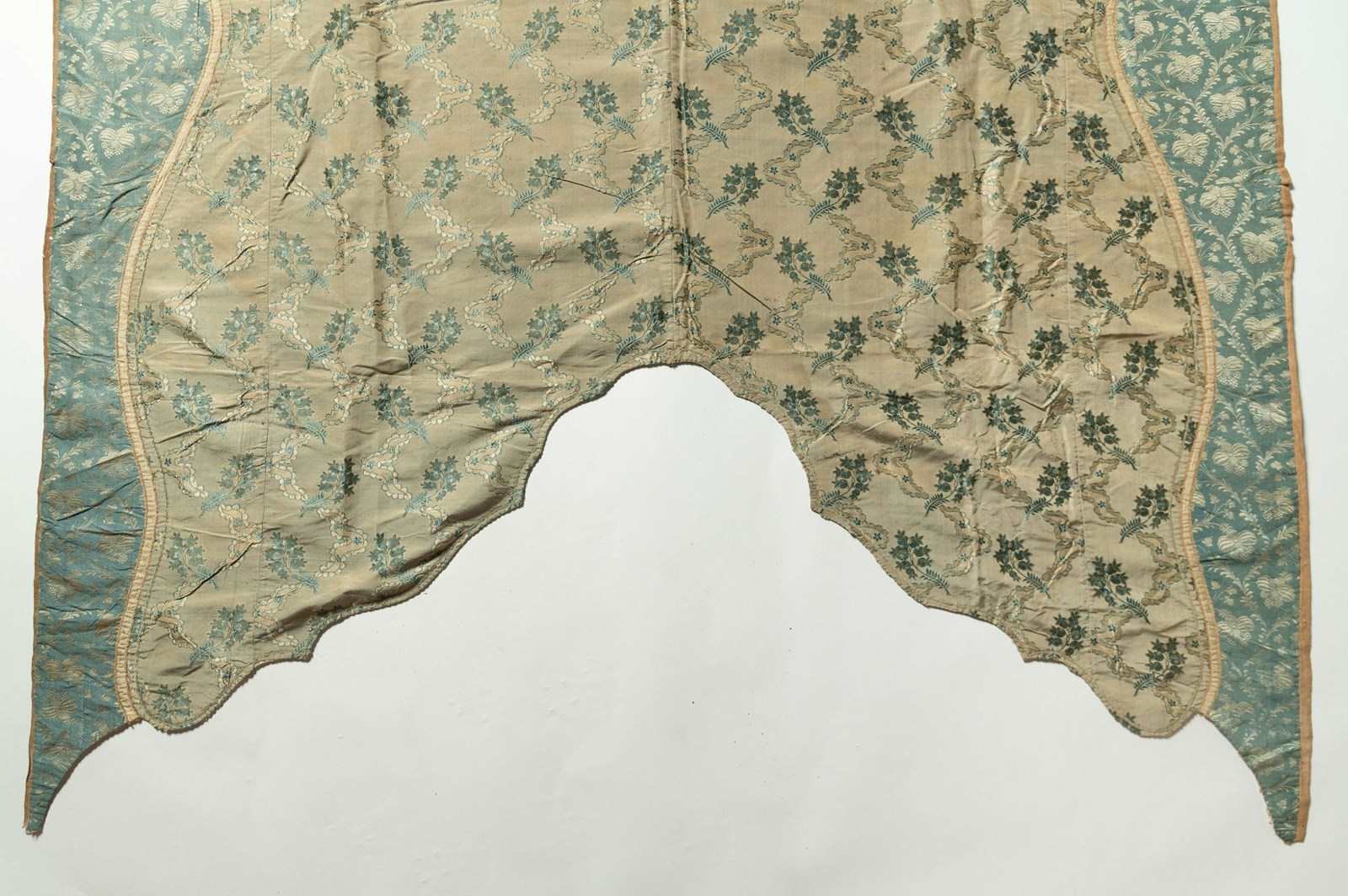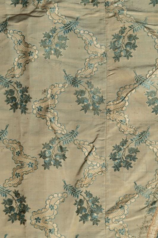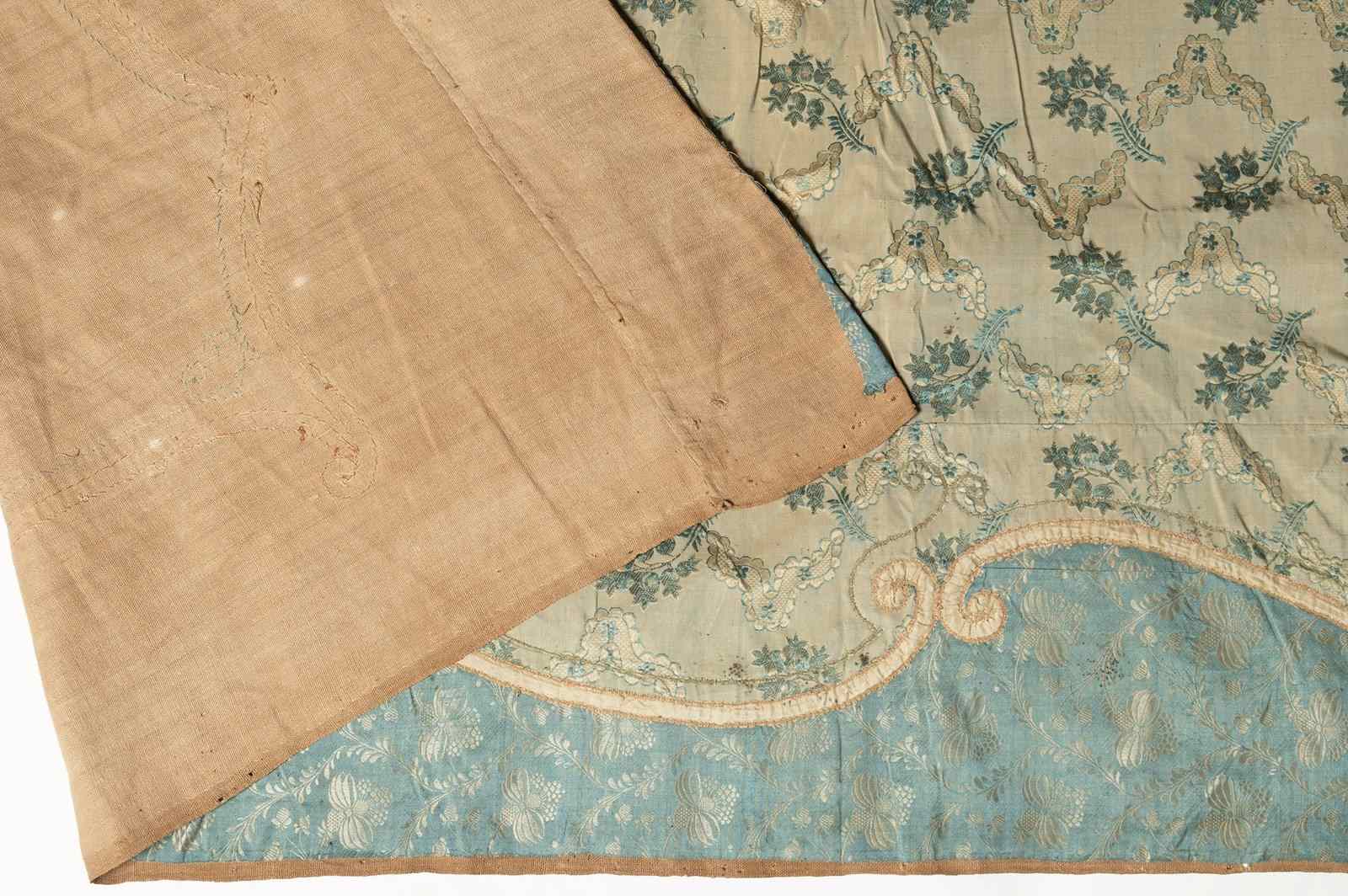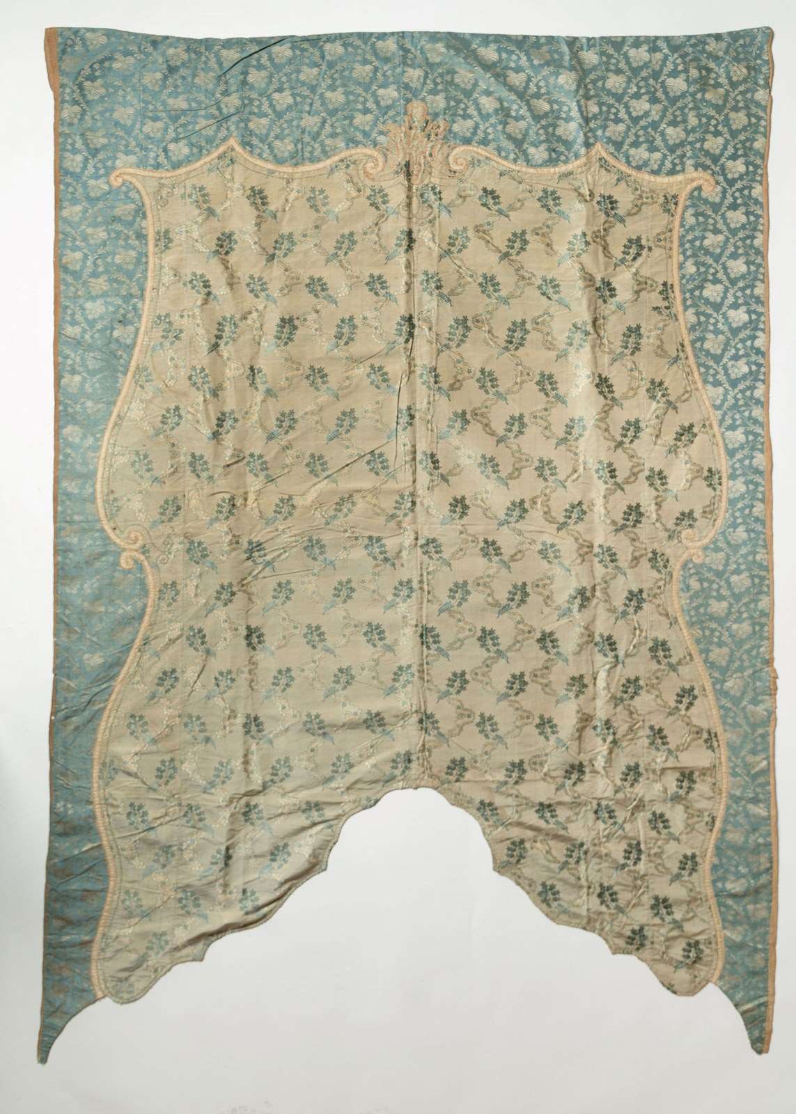 Antique French 18th Century wall hanging. It could easily be attached to the wall with double sided velcro. Silk to the centre. It would of most likely been hung behind a bed originally. A lovely period wall hanging that would make a feature in any room as it is or with a painting – mirror hung in front of it from string / fishing wire above the panel.