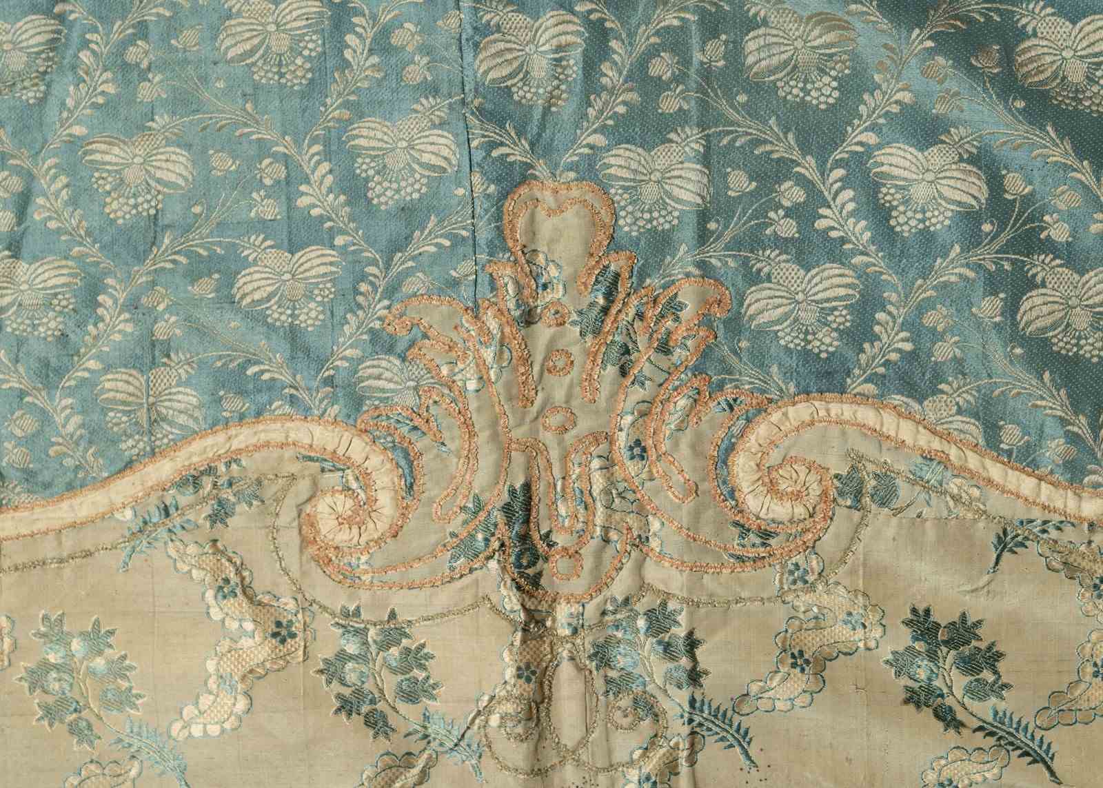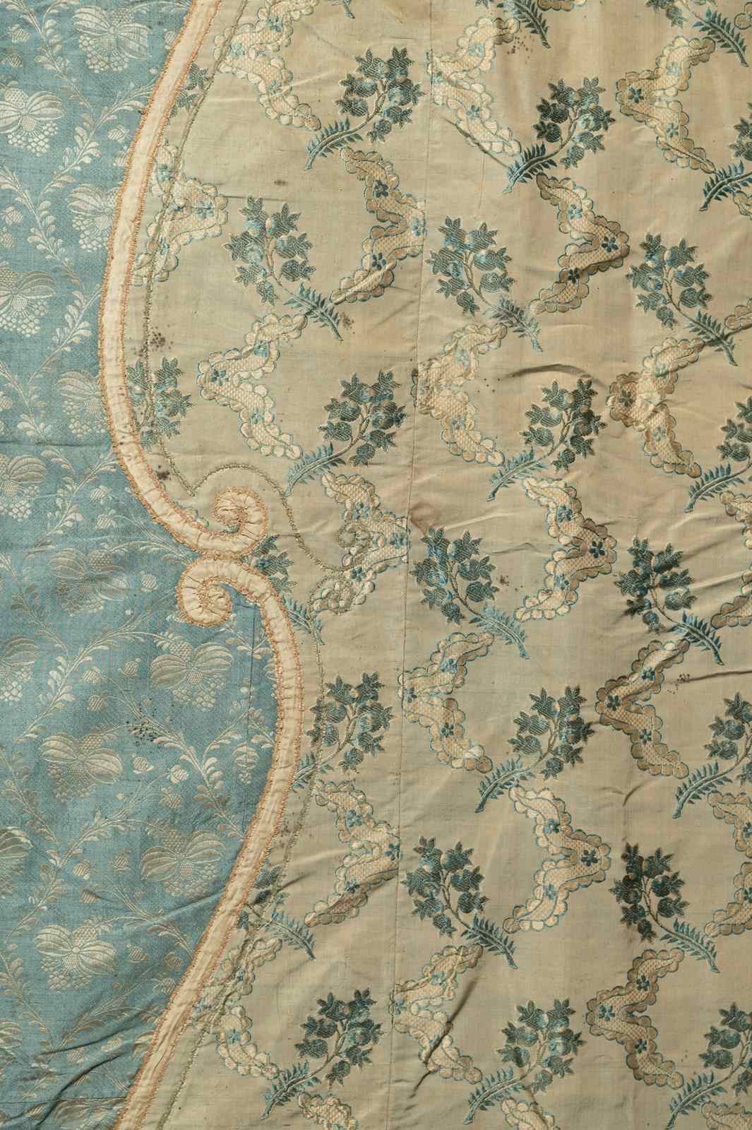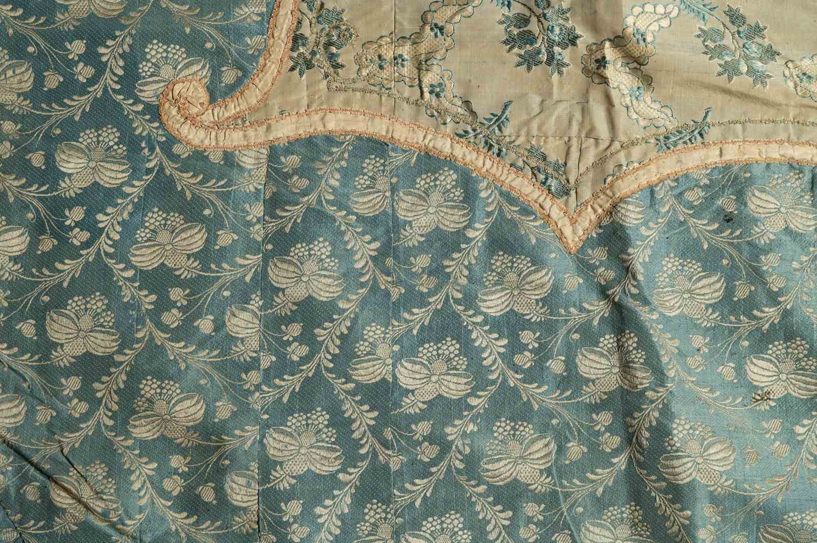 Antique French 18th Century wall hanging. It could easily be attached to the wall with double sided velcro. Silk to the centre. It would of most likely been hung behind a bed originally. A lovely period wall hanging that would make a feature in any room as it is or with a painting – mirror hung in front of it from string / fishing wire above the panel.