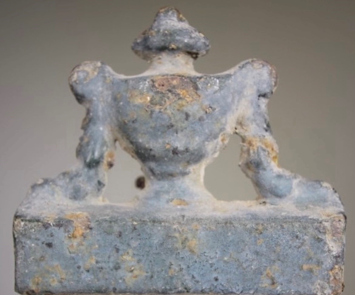 Early 19th Century – 1815, cast iron Regency door knocker, English, it features an urn vessel to the top over an acanthus leaf corbel, large size, all complete with new threaded bolts to the back to easily attach to a door. Still in the lovely old pale blue paint. The below depth does not include the bolts.