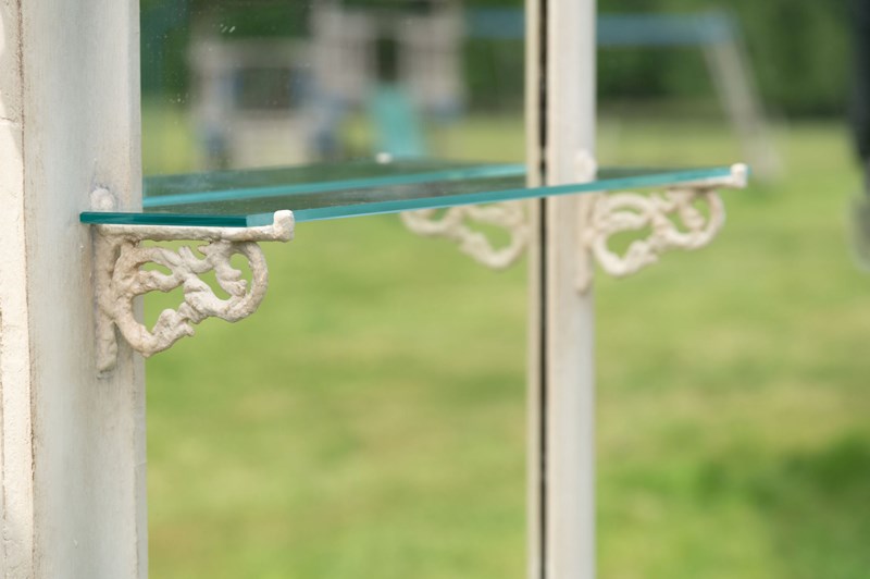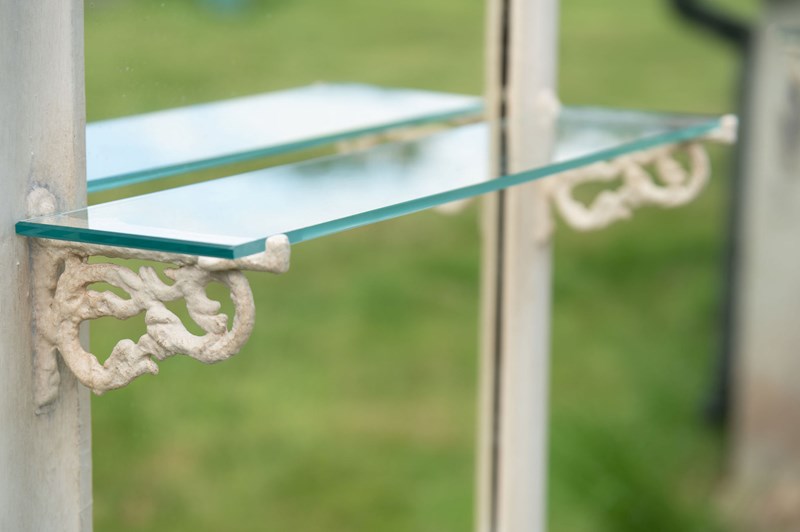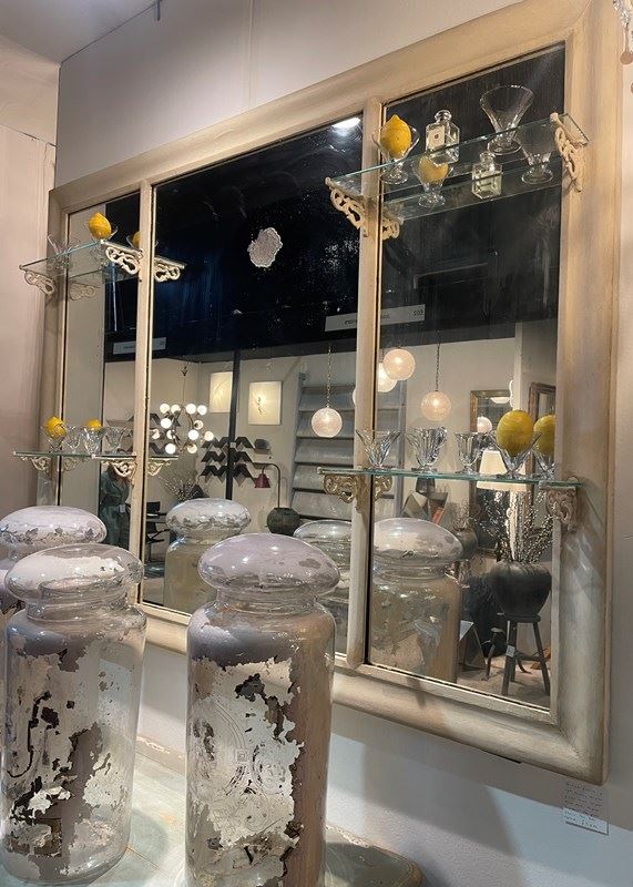 Original antique French bistro mirror, original mirror plate with light foxing in areas, 4 new removable glass shelves, I haven’t found one this lovely in years !