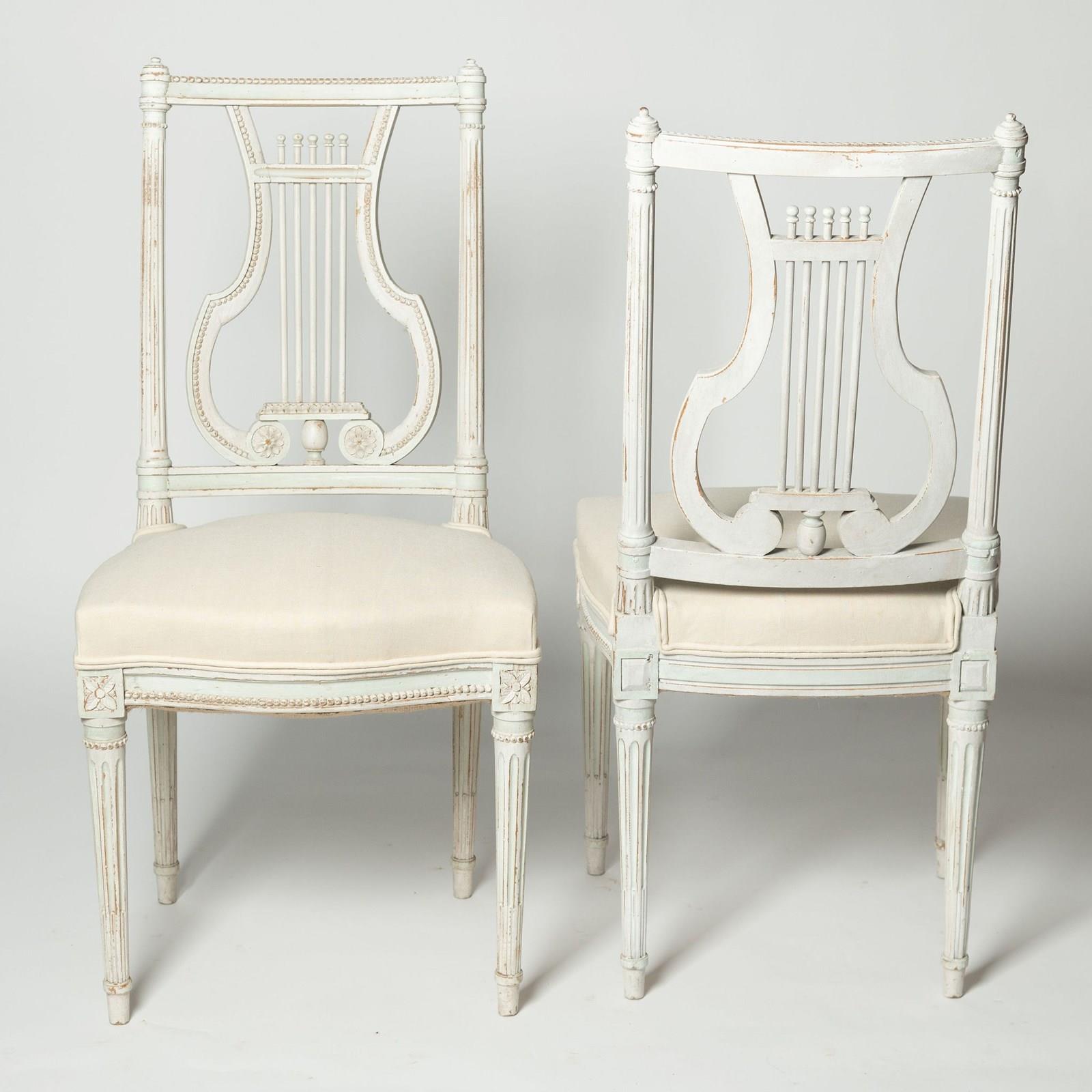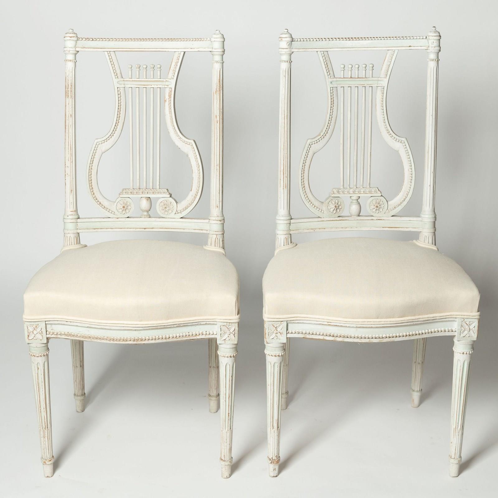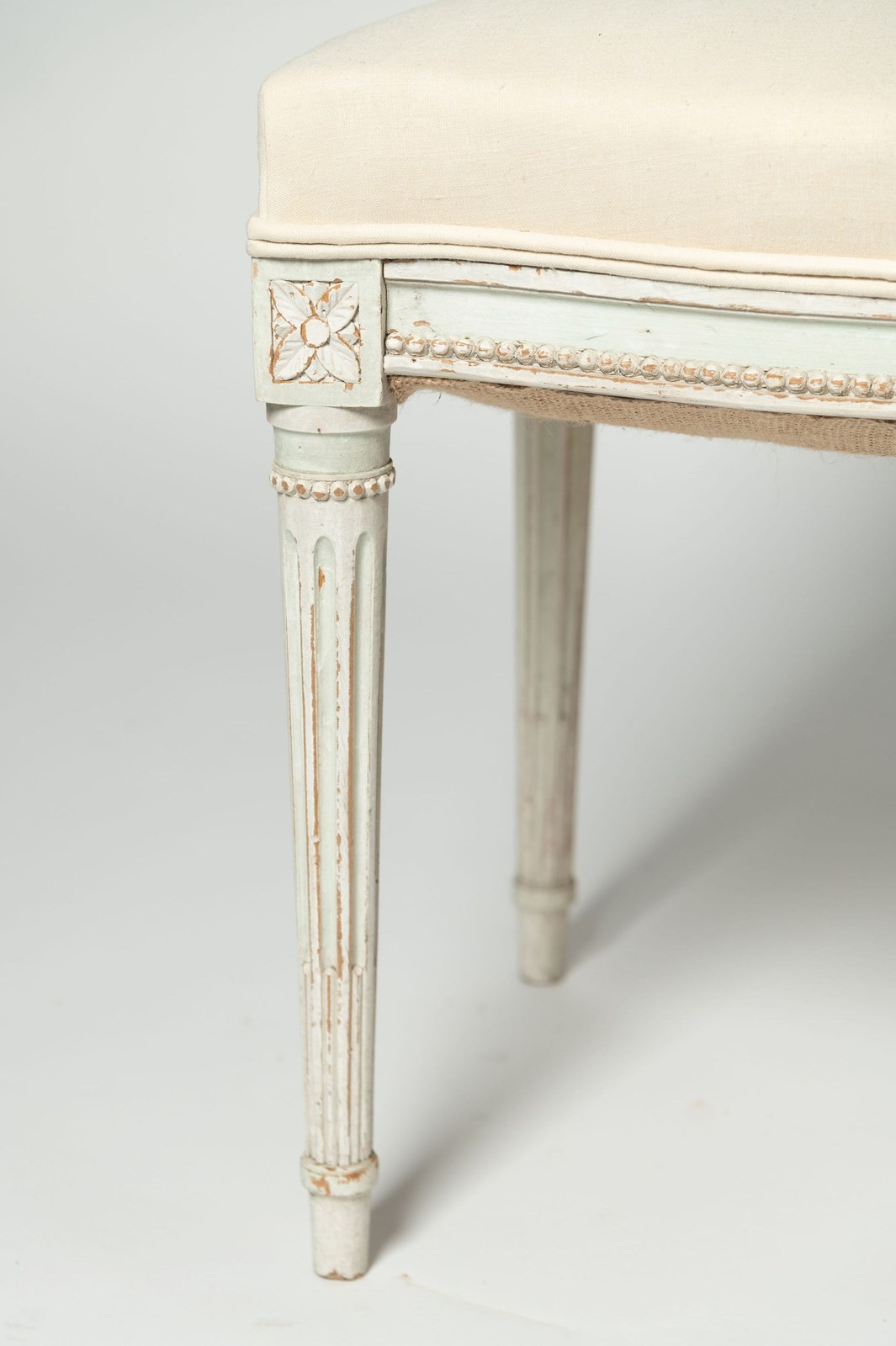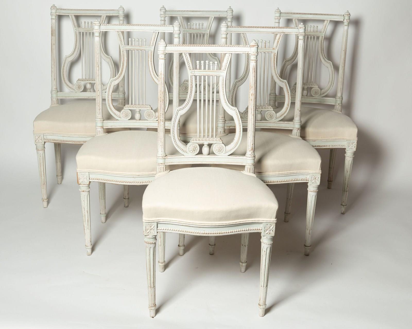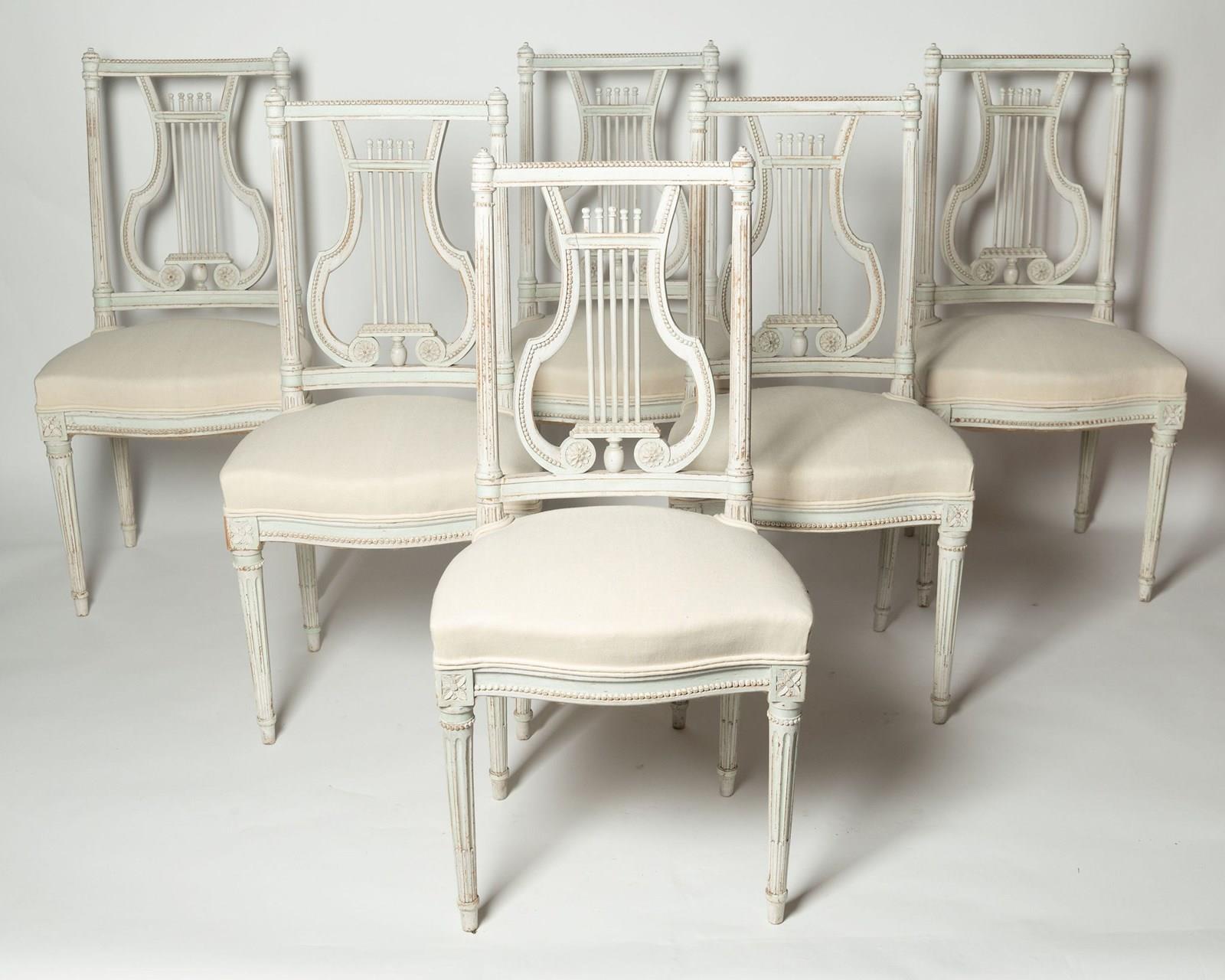 A pretty set of six antique French chairs, original paint, sold and priced in pairs @ £1,250 per pair. Recently upholstered in antique French linen. 3 pairs available. Seat depth 15 inches, floor to seat 17.5 inches.