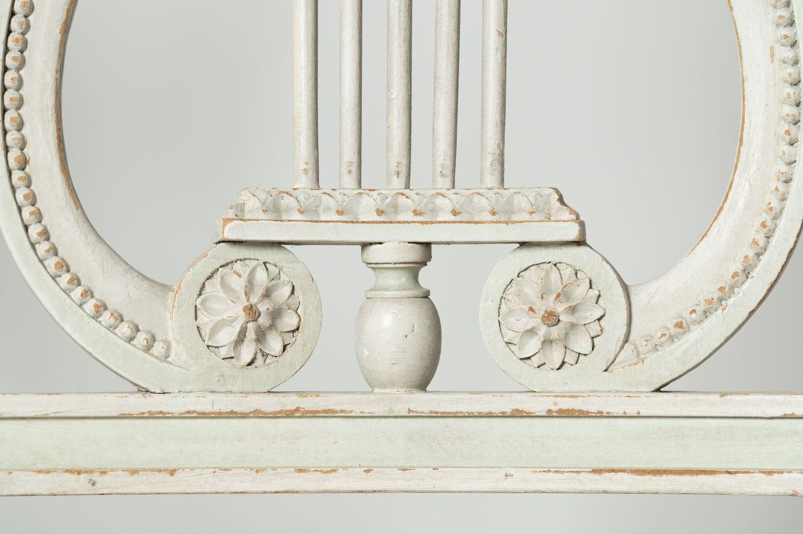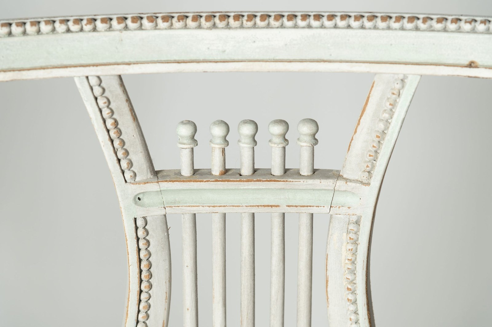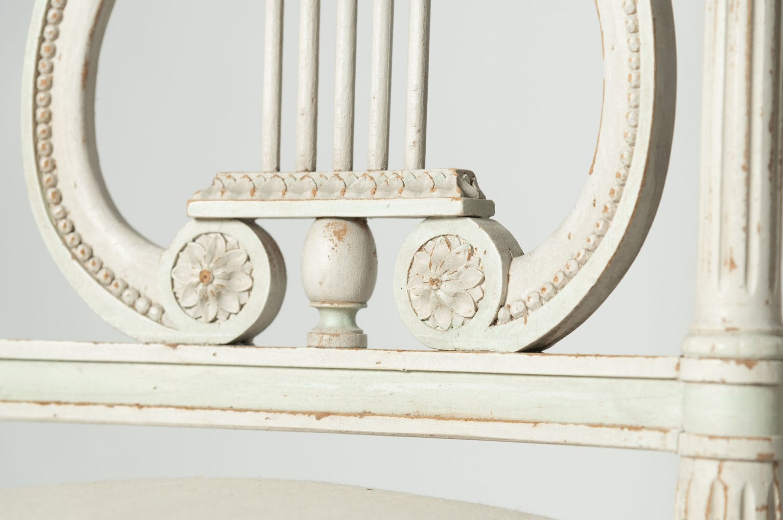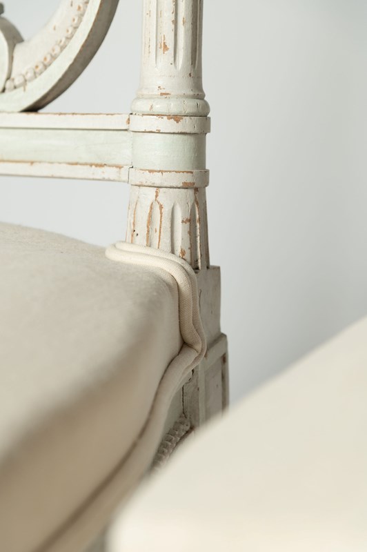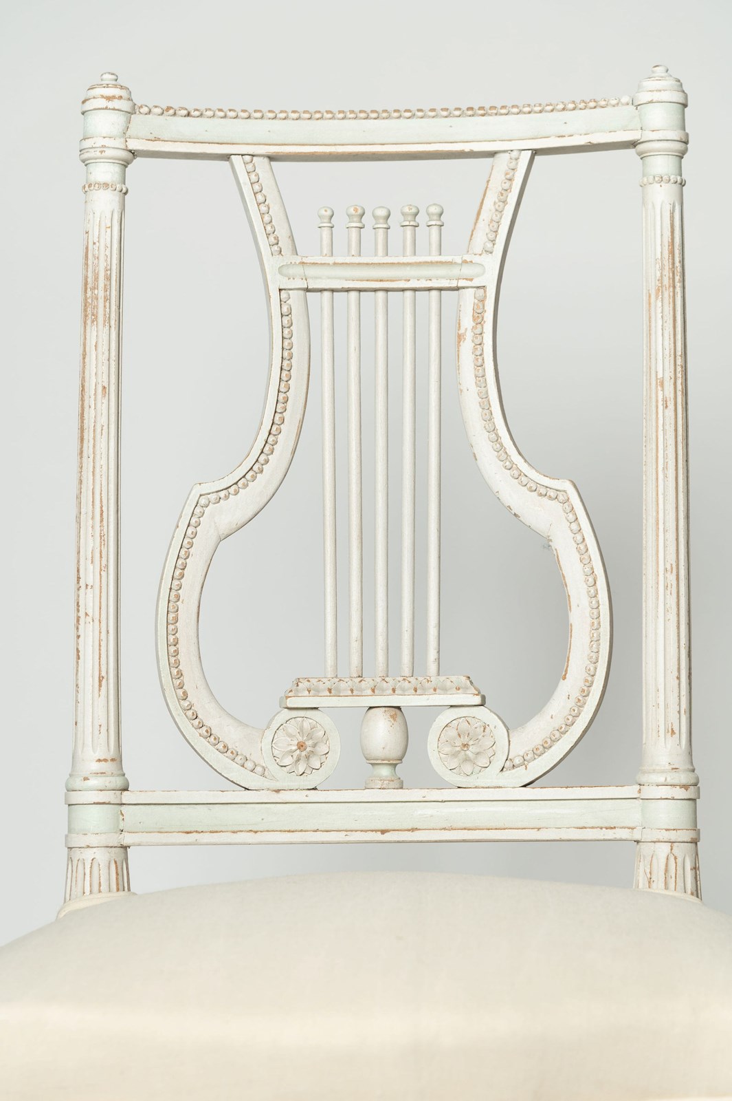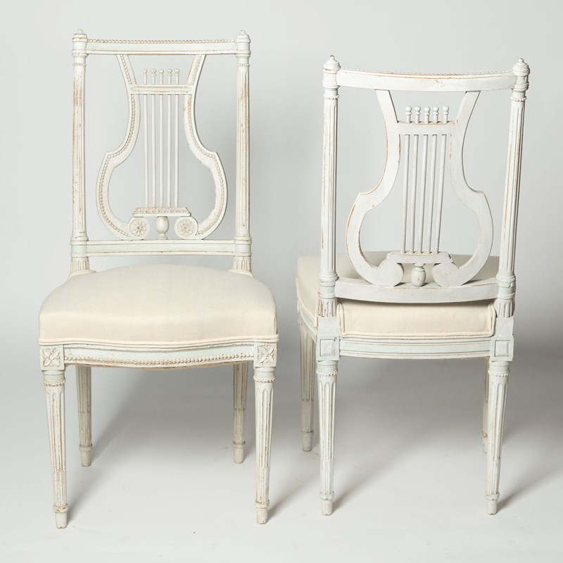 A pretty set of six antique French chairs, original paint, sold and priced in pairs @ £1,250 per pair. Recently upholstered in antique French linen. 3 pairs available. Seat depth 15 inches, floor to seat 17.5 inches.