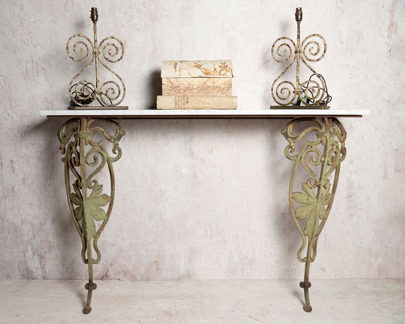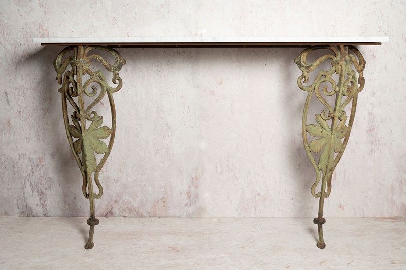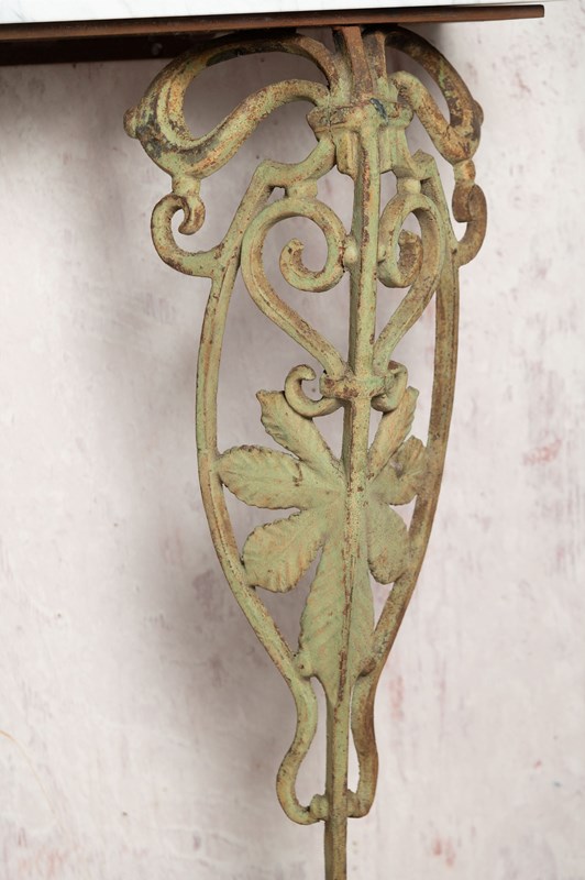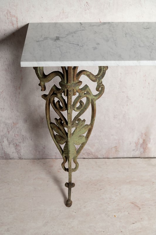 Original Art Nouveau cast iron balcony elements have been skilfully reused to create this console table. New Carrara marble top. Original patina and paint on the legs. It simply screws to the wall. The elements were sourced in Provence.