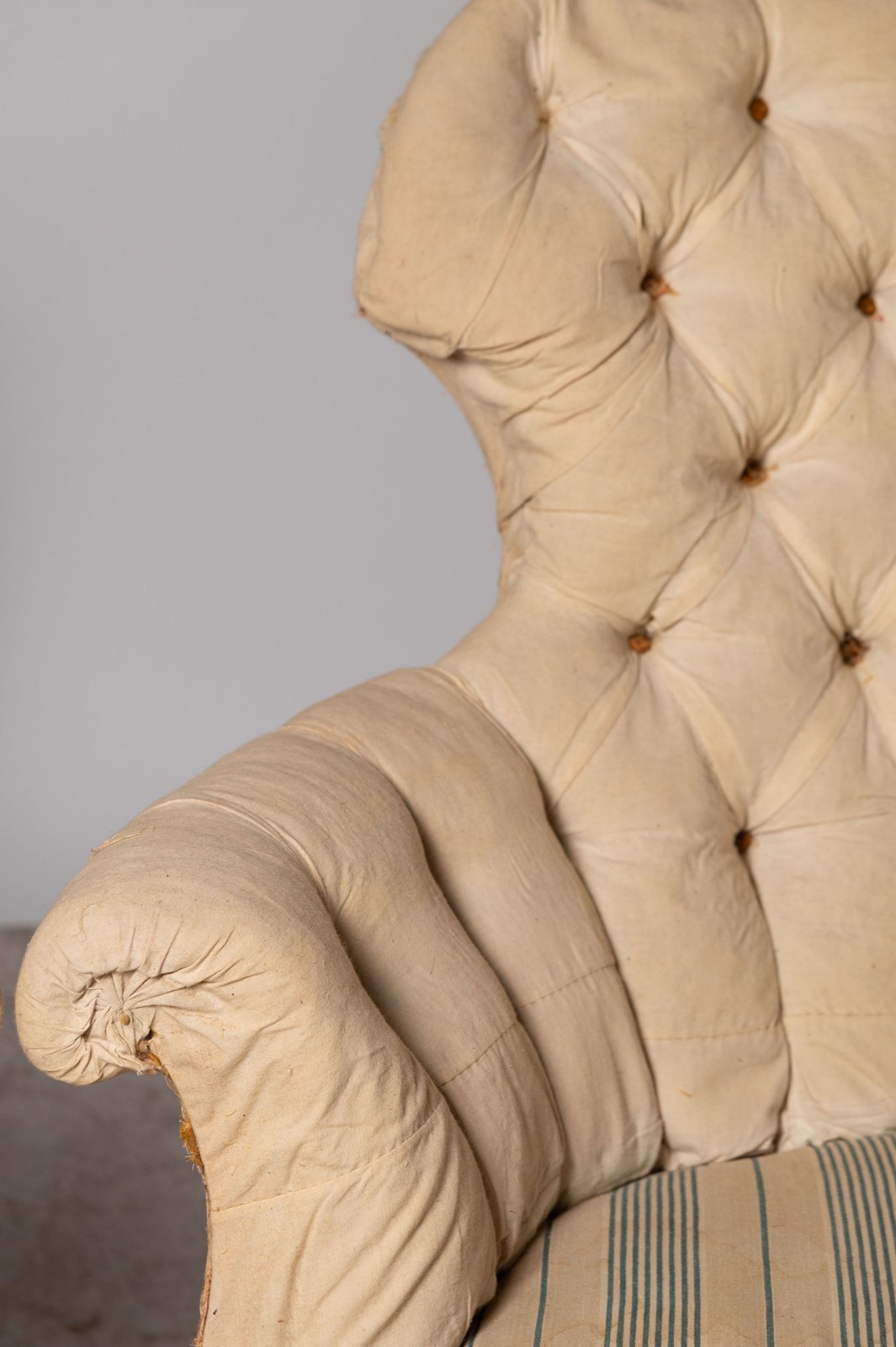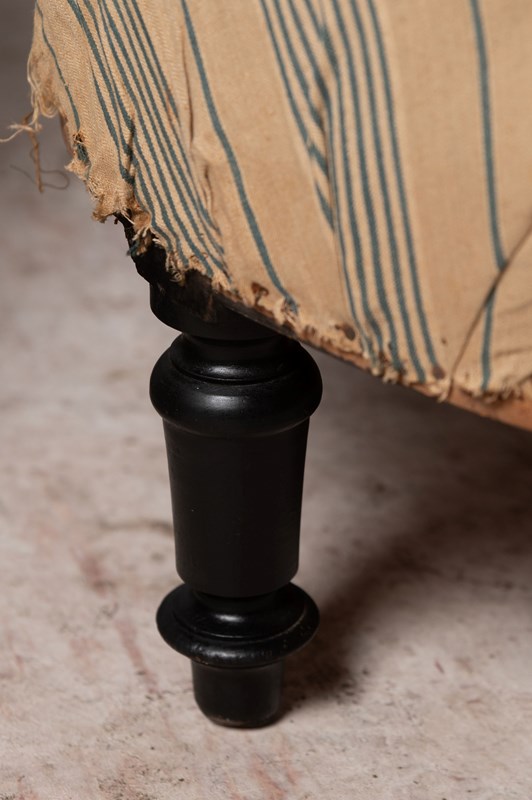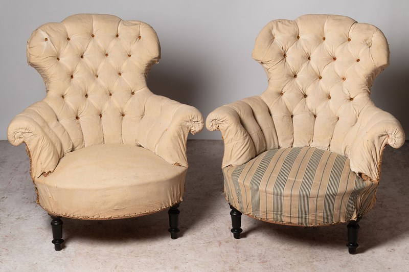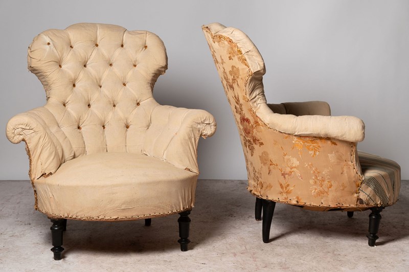 Unusual shape pair of 19th Century French chairs. They could be upholstered with a plain back (without buttons) if preferred. Seat depth 22 inches.