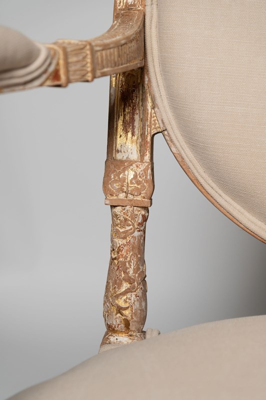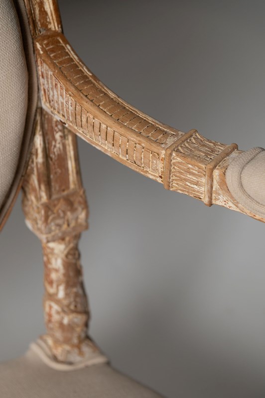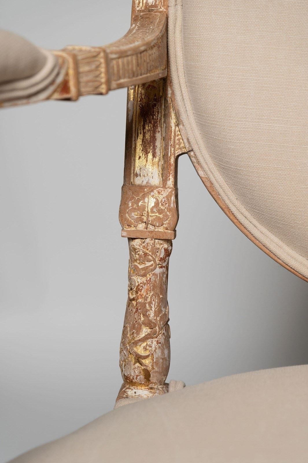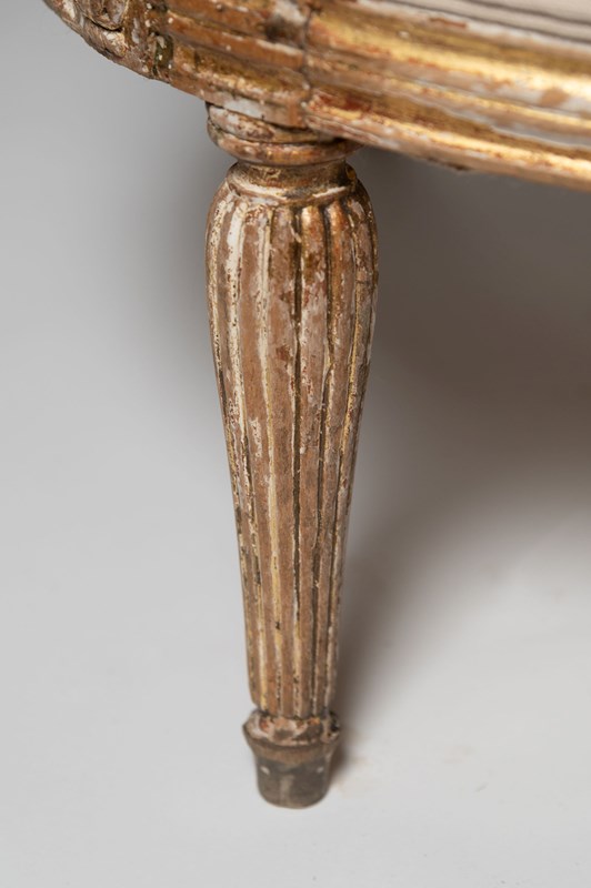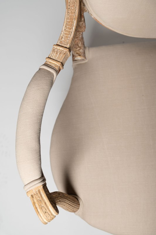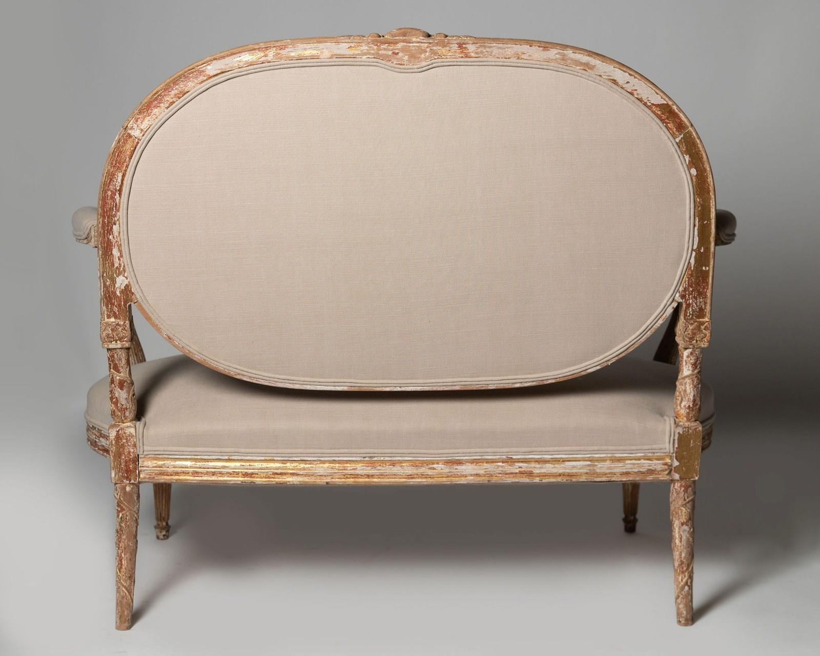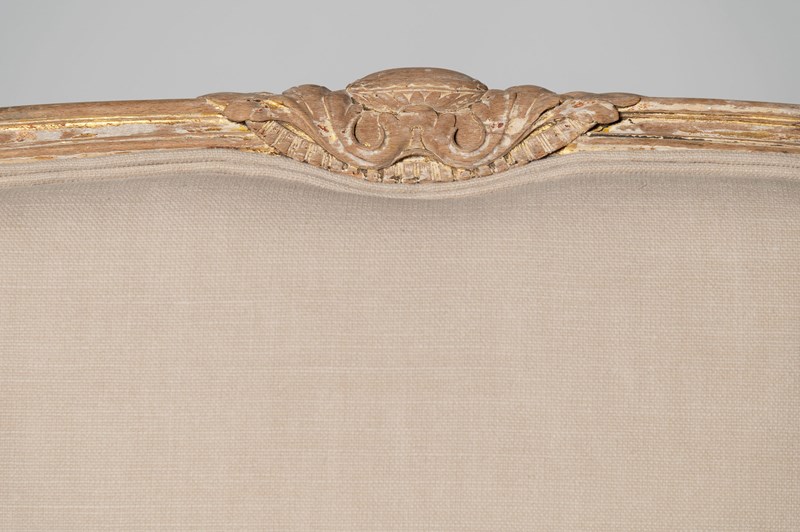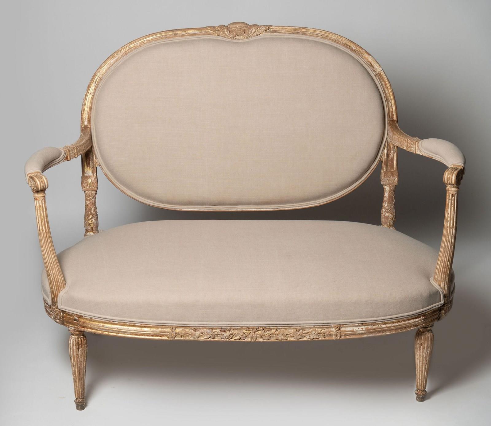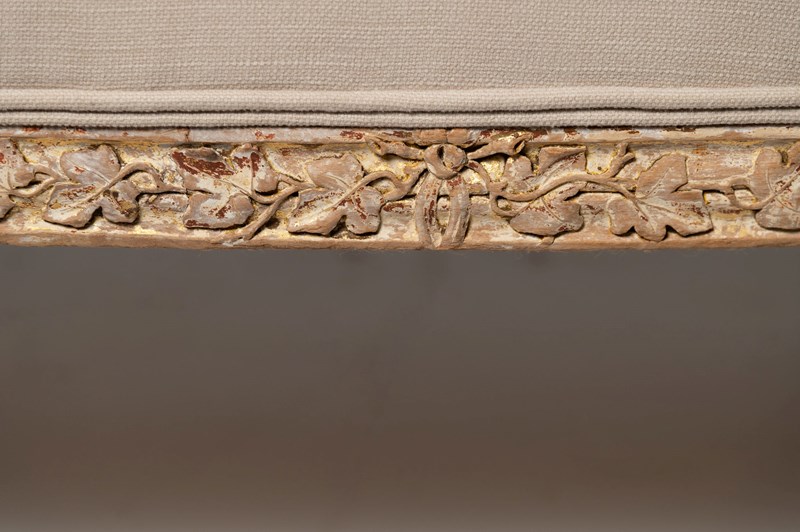 A lovely shape antique French sofa. Recently fully upholstered in a neutral fabric. Seat depth 22 inches. Unusual foliage carved detail.