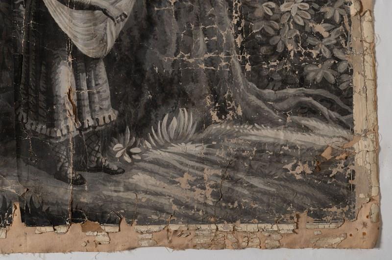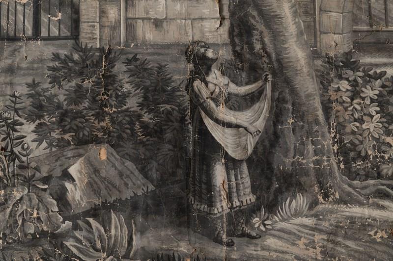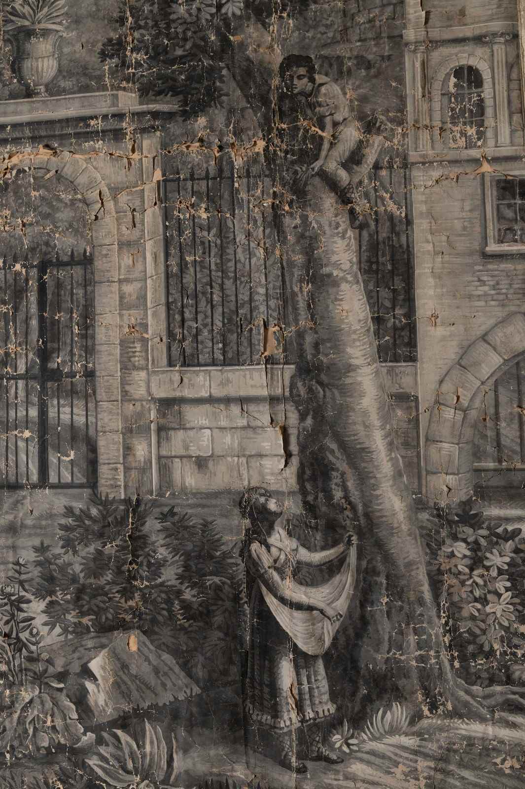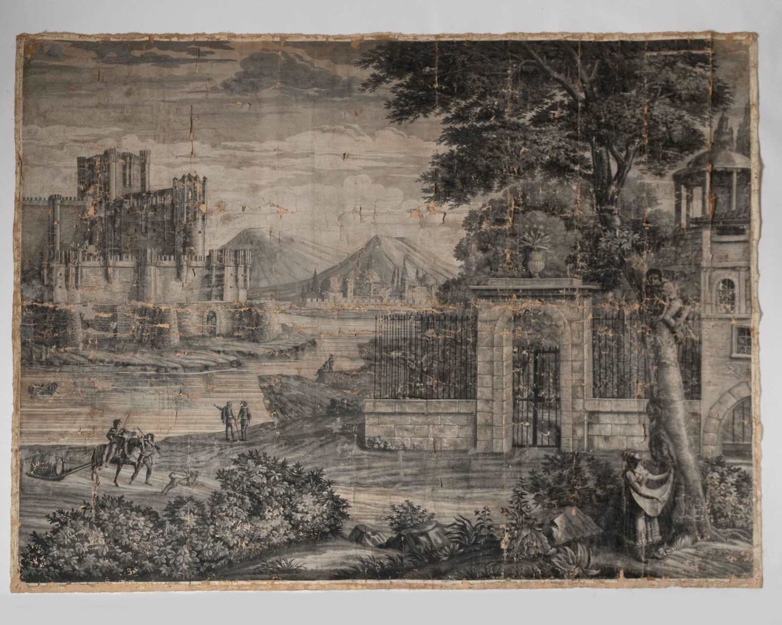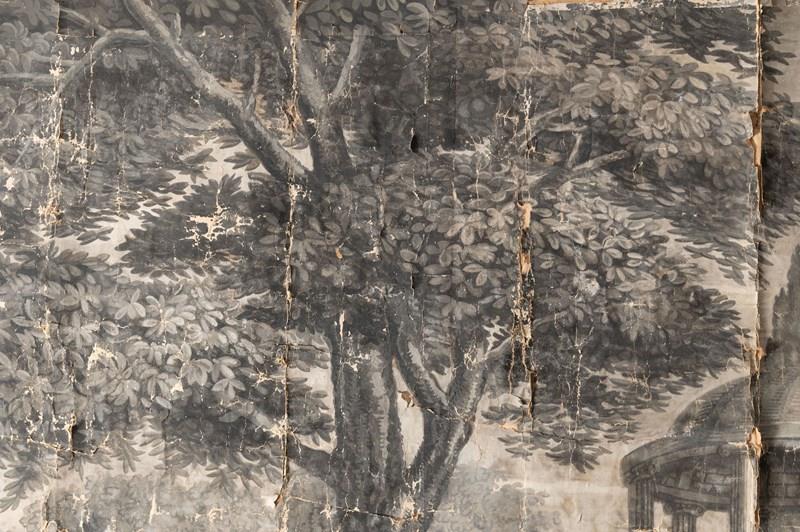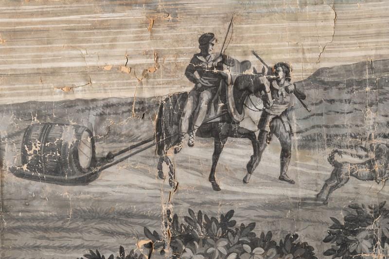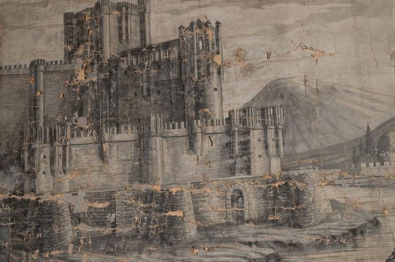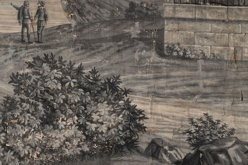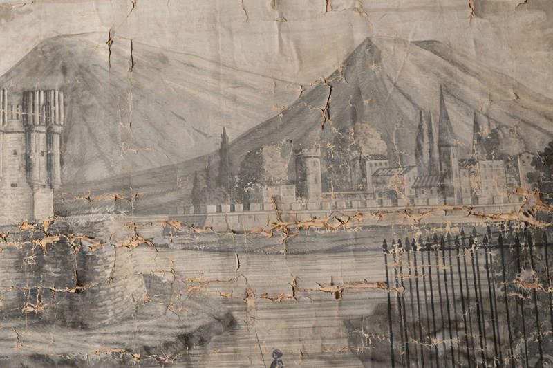 19th Century French wallpaper panel mounted on canvas. Believed to be, A panorama with the Castle of Coca, Spain. Large grisaille scene depicting a view of the Castle, Mountains, and River at Coca, in the province of Segovia, Spain. The Castle of Coca is a Spanish fortress located in Coca, in the province of Segovia. It was built in the 15th century and is considered a major work of Spanish Mudéjar Gothic. Situated near the town, close to the Voltoya River, it is one of the few Spanish fortresses not located on a hillside, but on a fairly steep slope. A wide, deep moat surrounds the building. Its construction, attributed to Sevillian master builders, was carried out in the 15th century primarily in brick, used not only as a building material but also as a decorative element. Limestone appears in the arrow slits, the columns of the parade ground, and other decorative elements. Wallpaper in several strips mounted on linen canvas. Parisian manufacture, dated 1818 according to the Louvre Museum. A contemporary example is held at the Louvre Museum in Paris. Dimensions: 185 x 234 cm. The paper has age related wear as to be expected, it is perfect not being perfect !.
