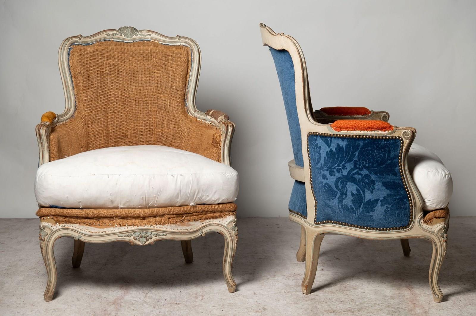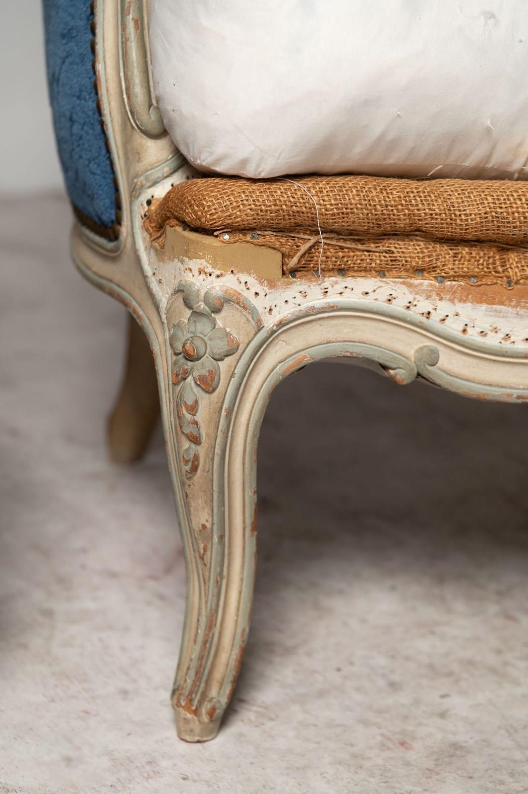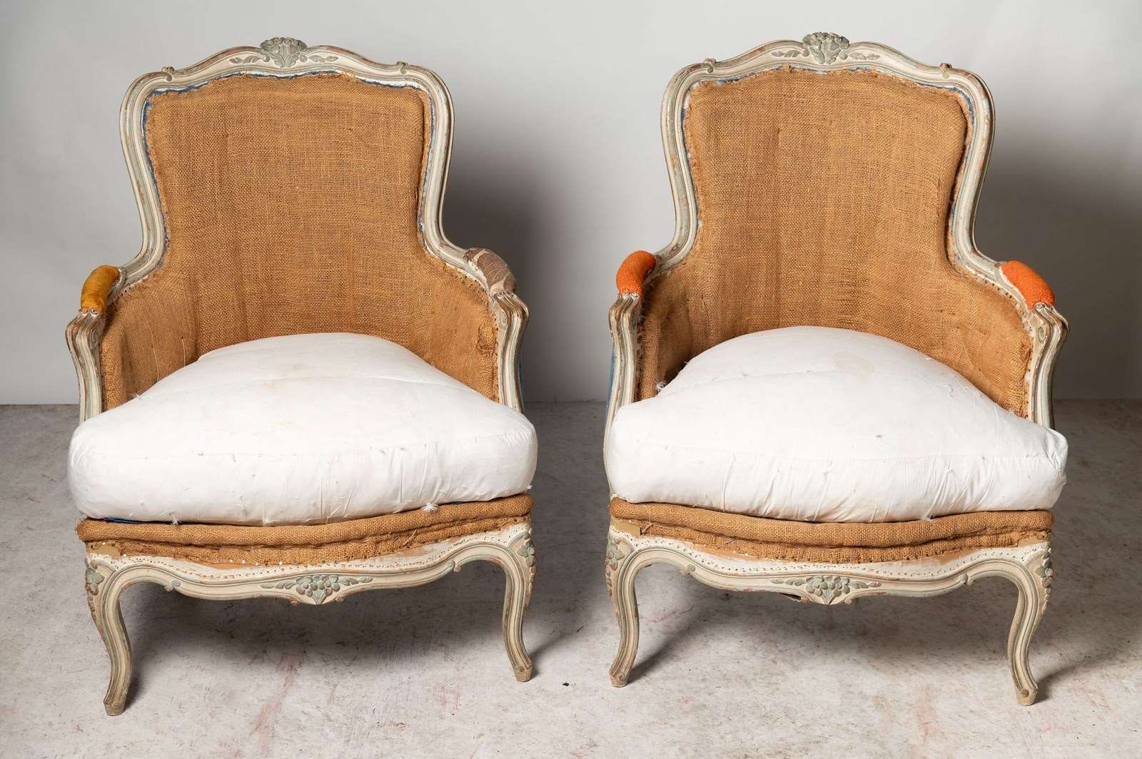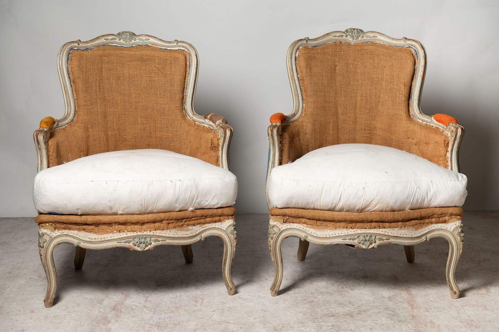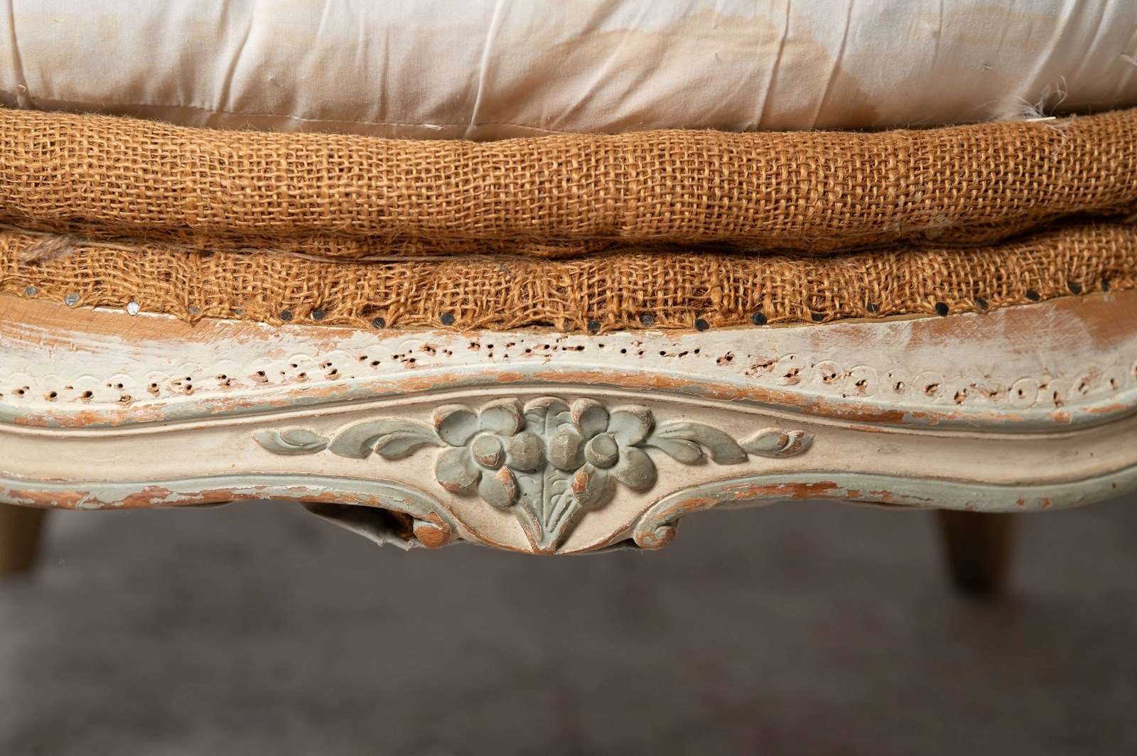 Pretty shape pair of antique French chairs, original paint. Seat depth 21 inches. Floor to seat 18 inches.