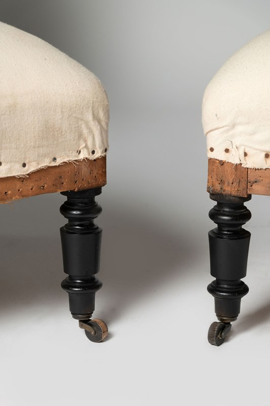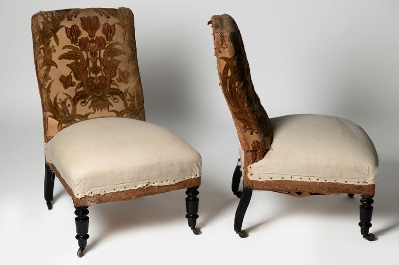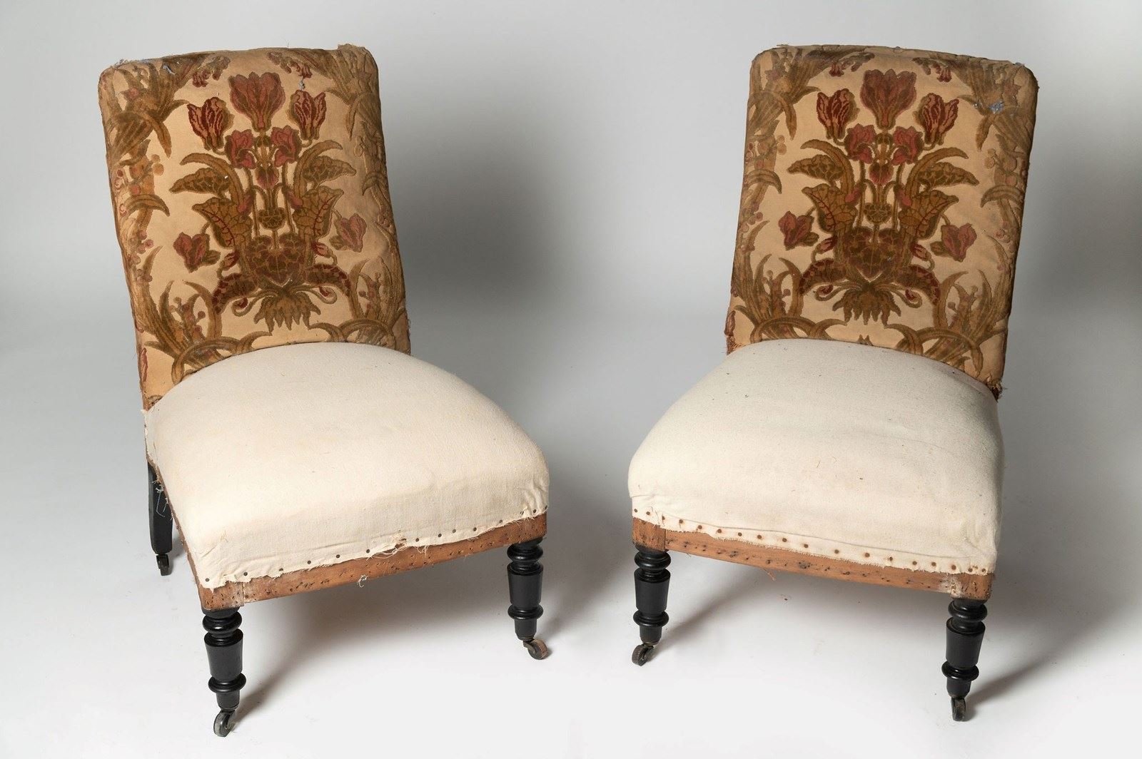 Antique French pair of slipper chairs, ideal fireside, bedroom or occasional chairs. The straps underneath will need attention, standard work for your upholsterer and priced accordingly. Seat depth 17 inches, floor to seat 14 inches.