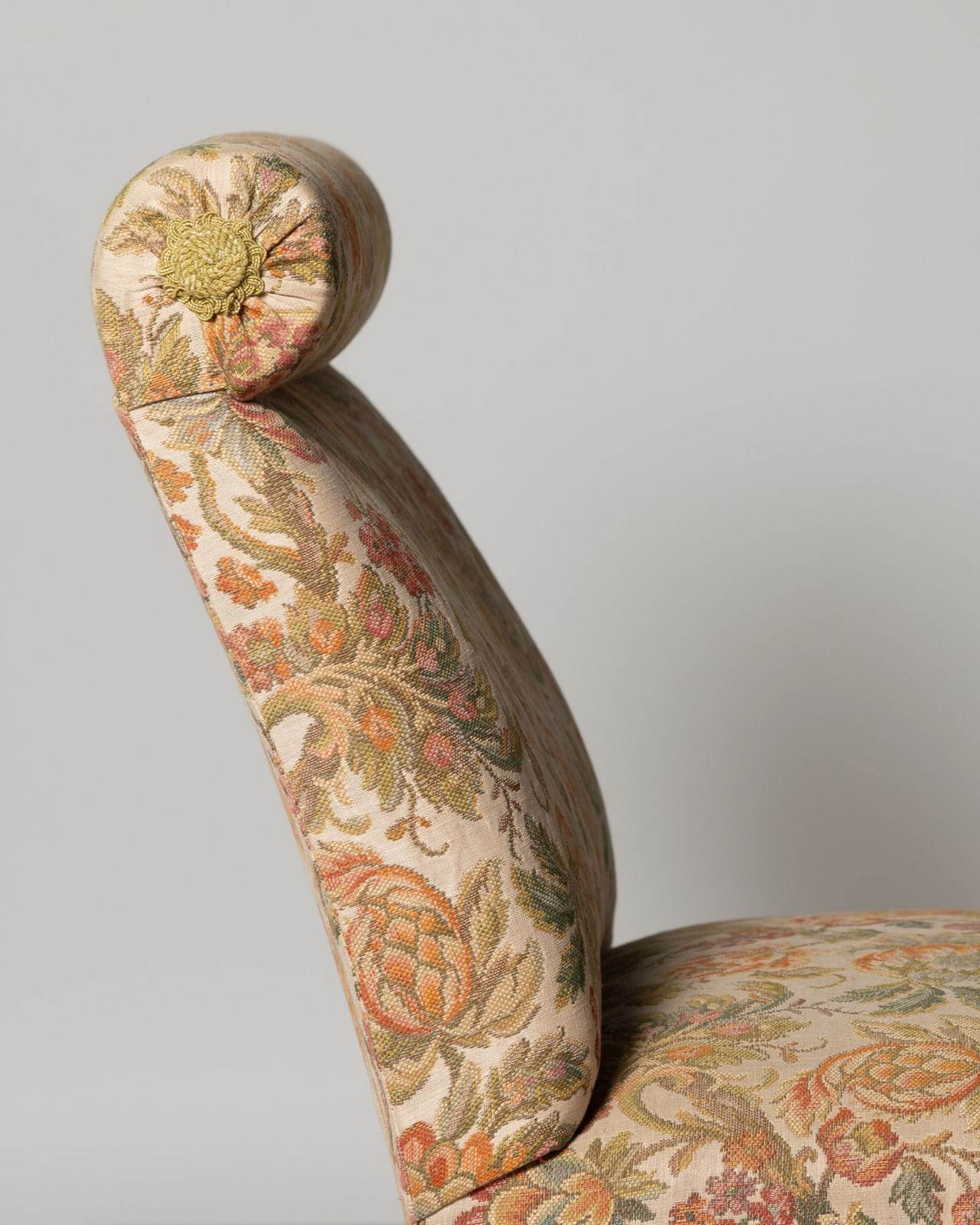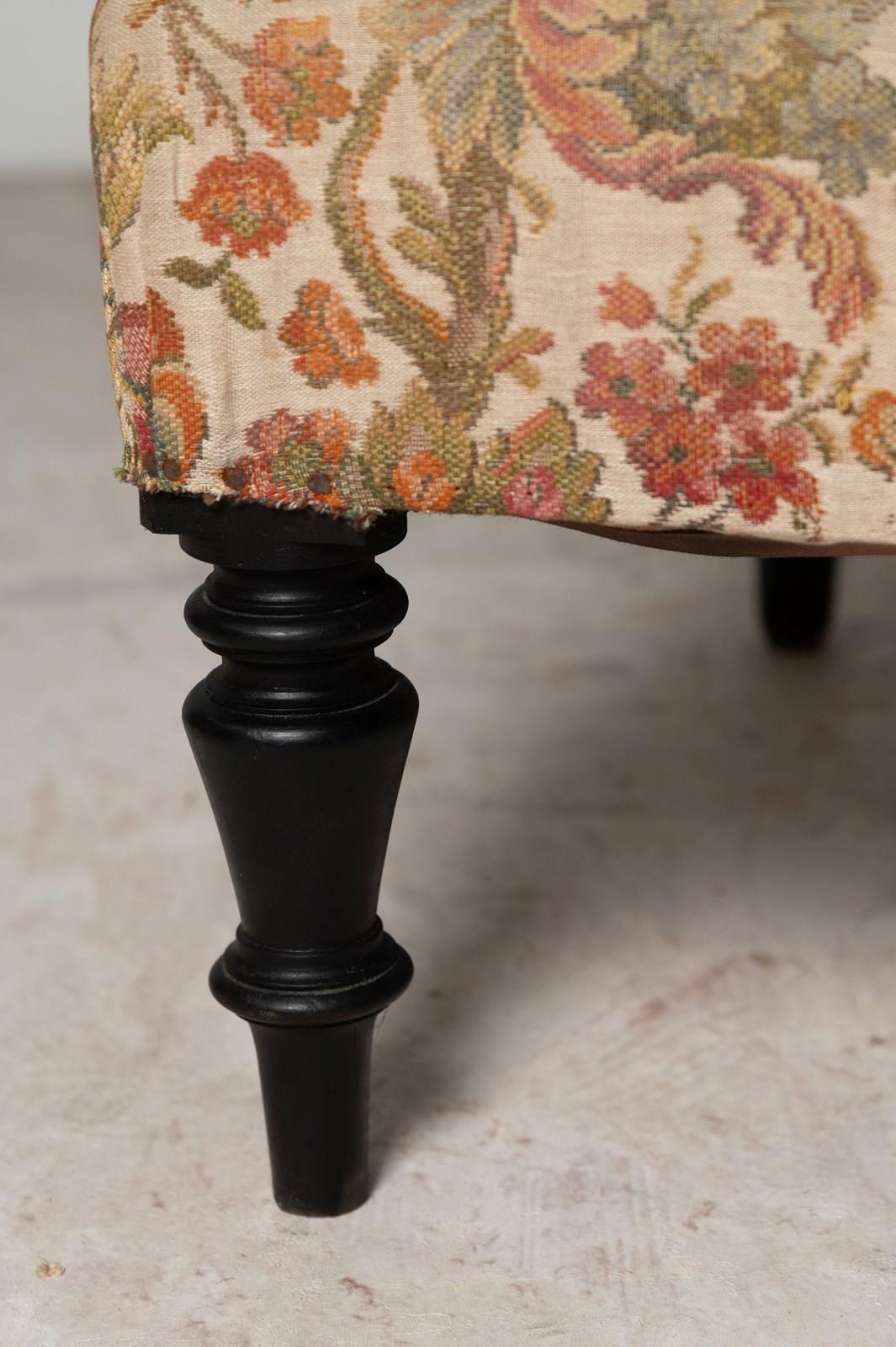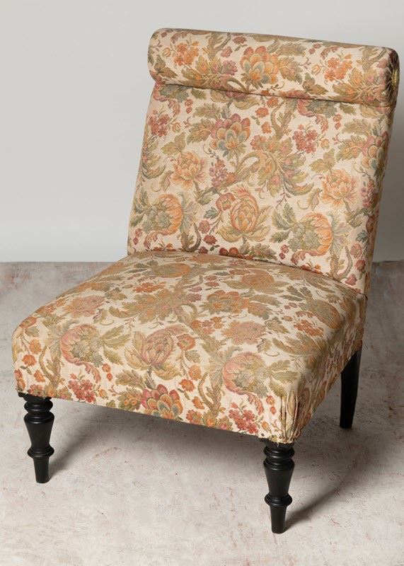 Unusual antique French slipper chair with a bolster cushion, ideal fireside, bedroom or occasional chair. Seat depth 18 inches.