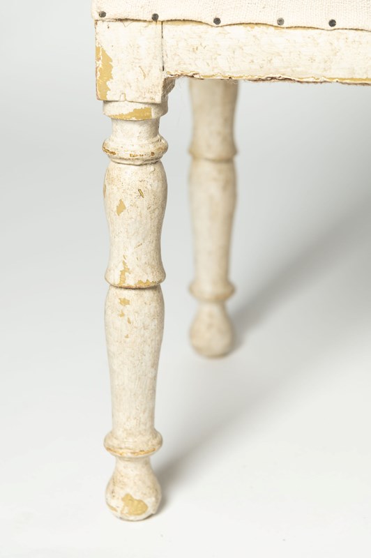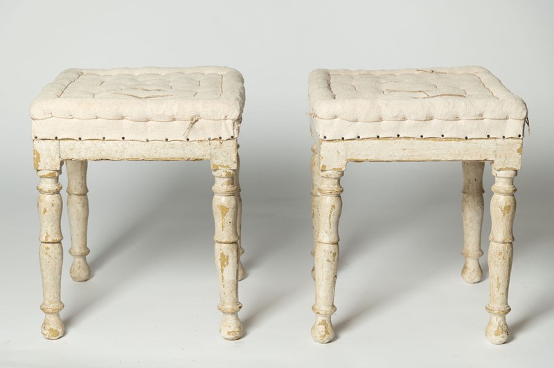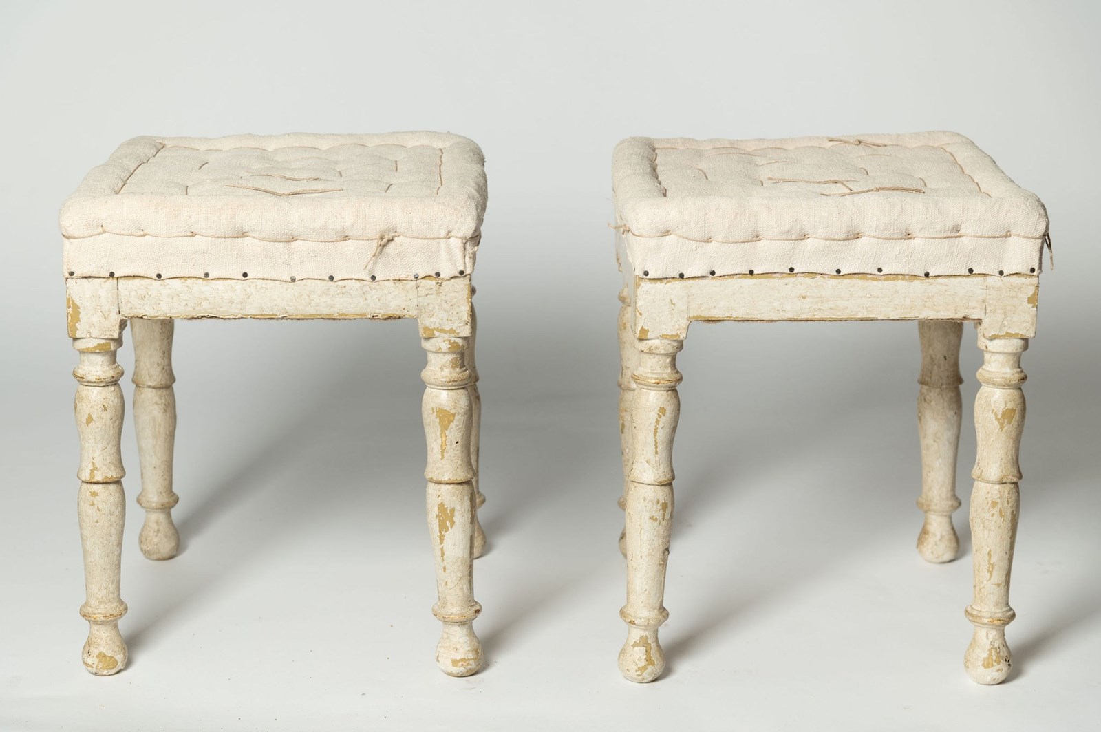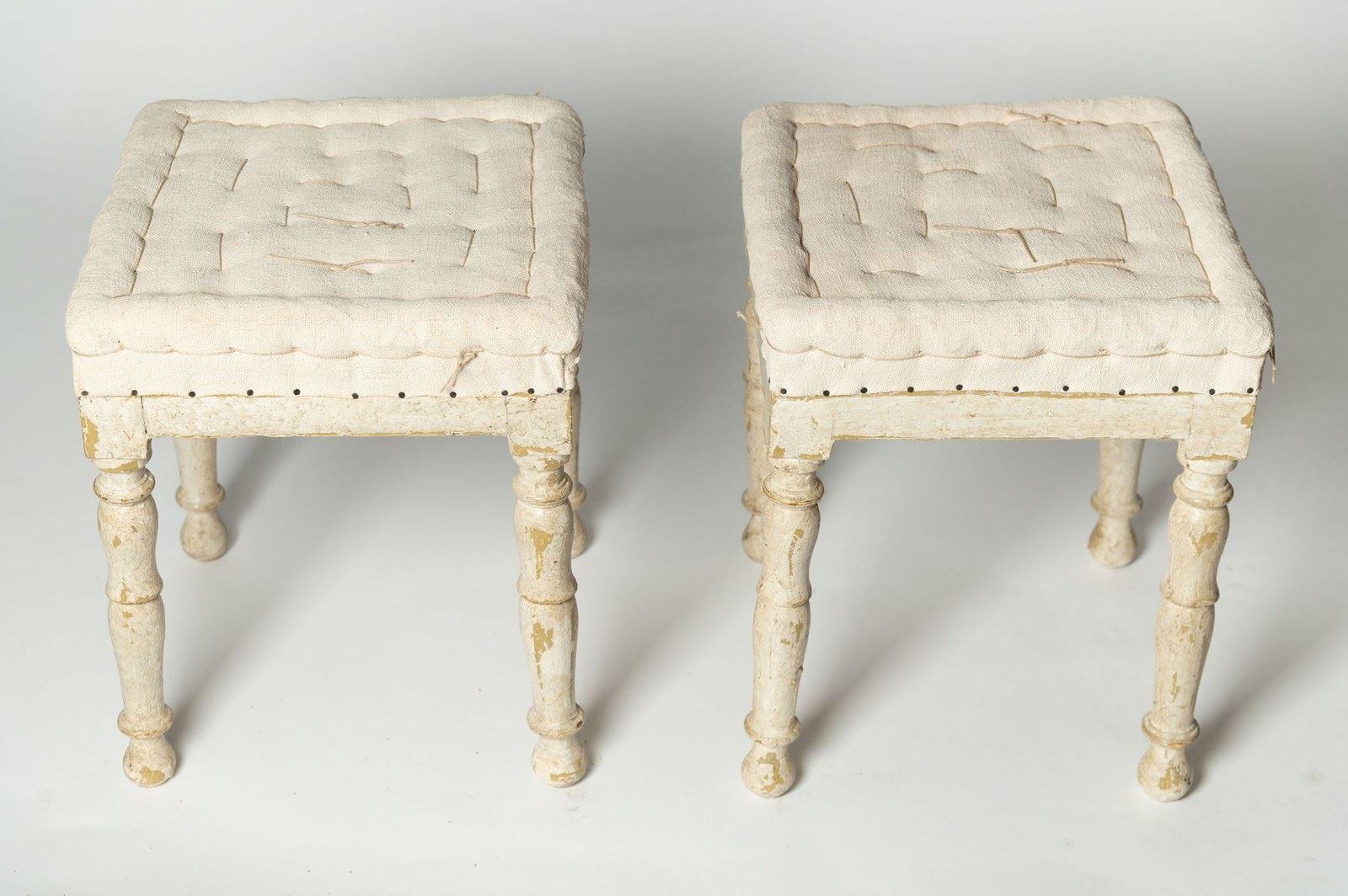 Pair of antique Swedish stools, recently upholstered in a traditional style.