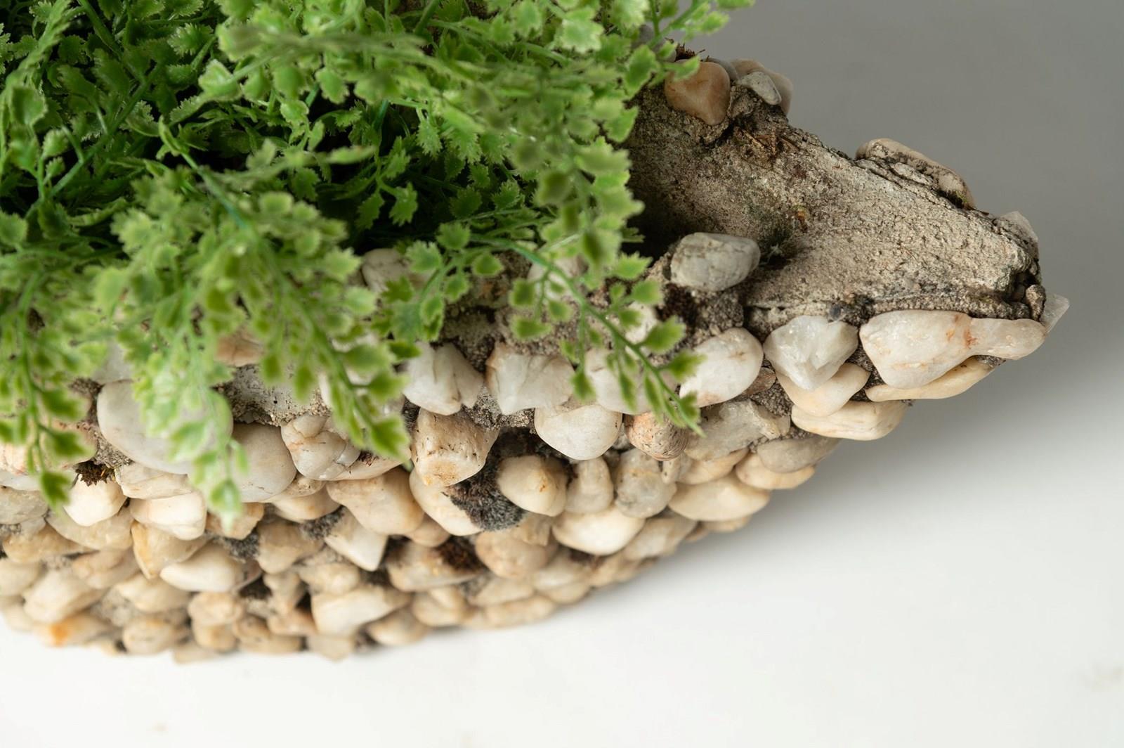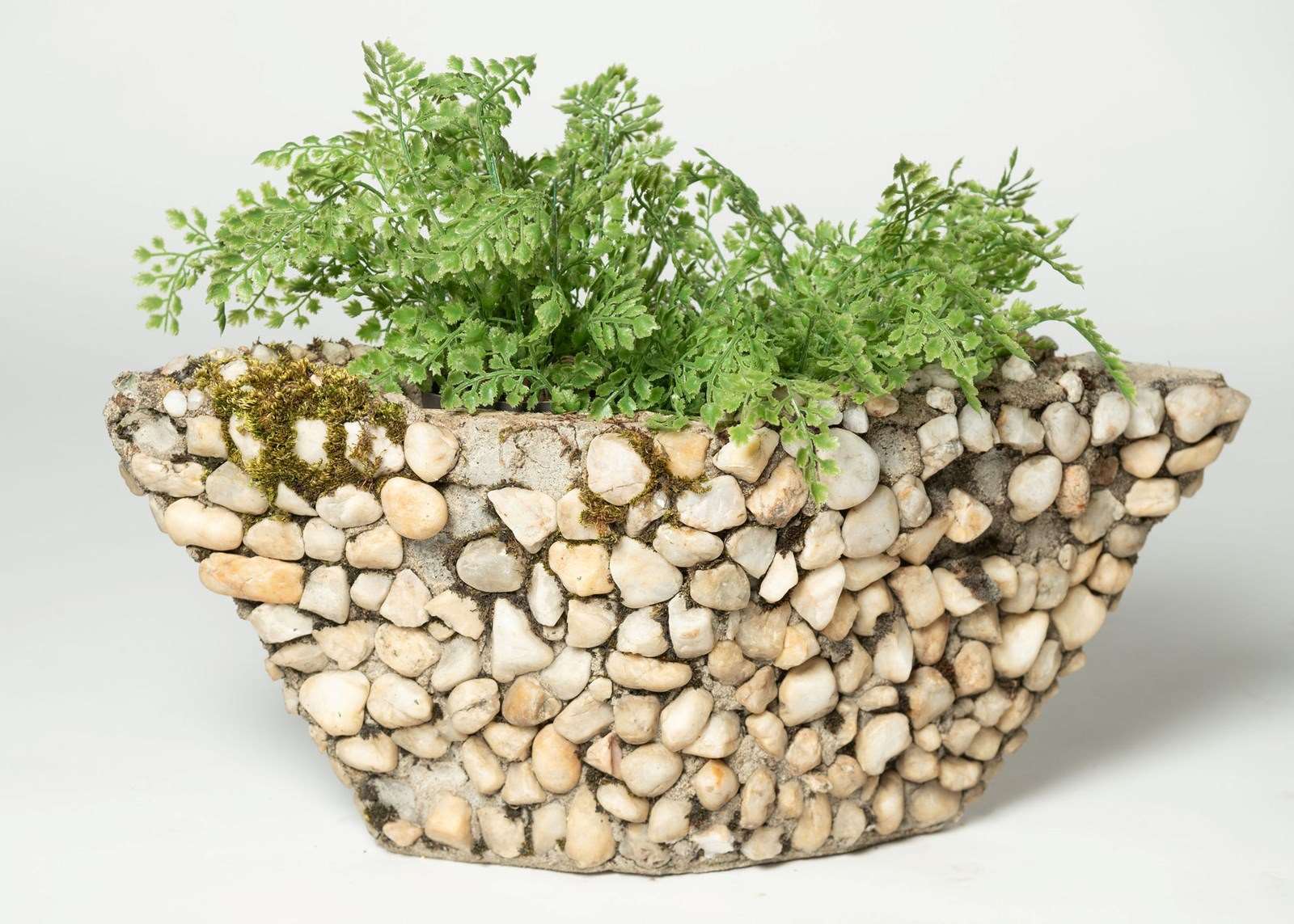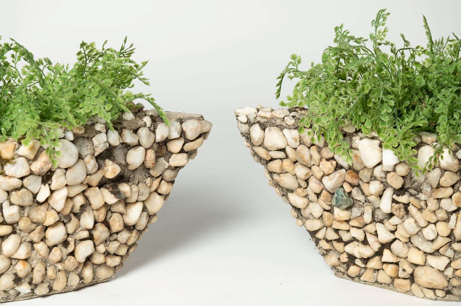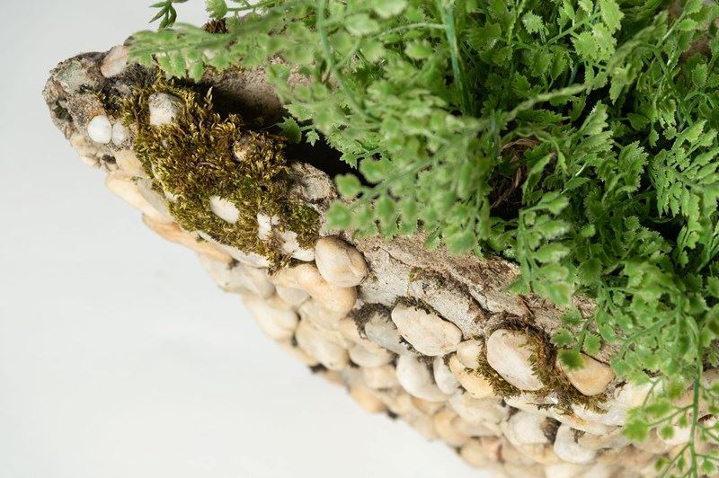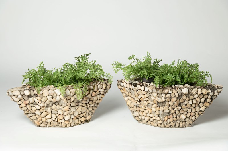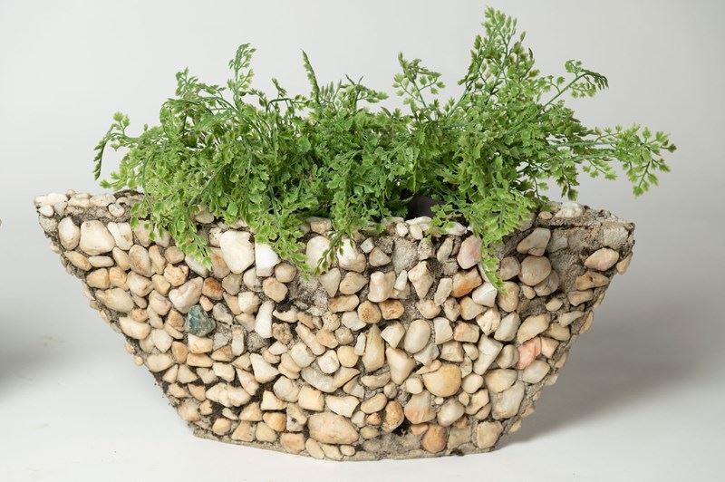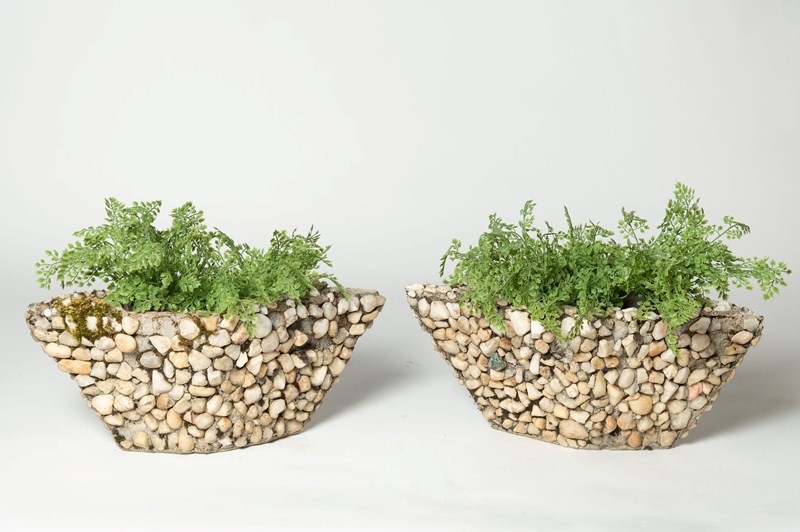 A fun pair of boat shape planters covered in pebbles. Purchased in Provence. A few pebbles are missing, nothing that detracts.
