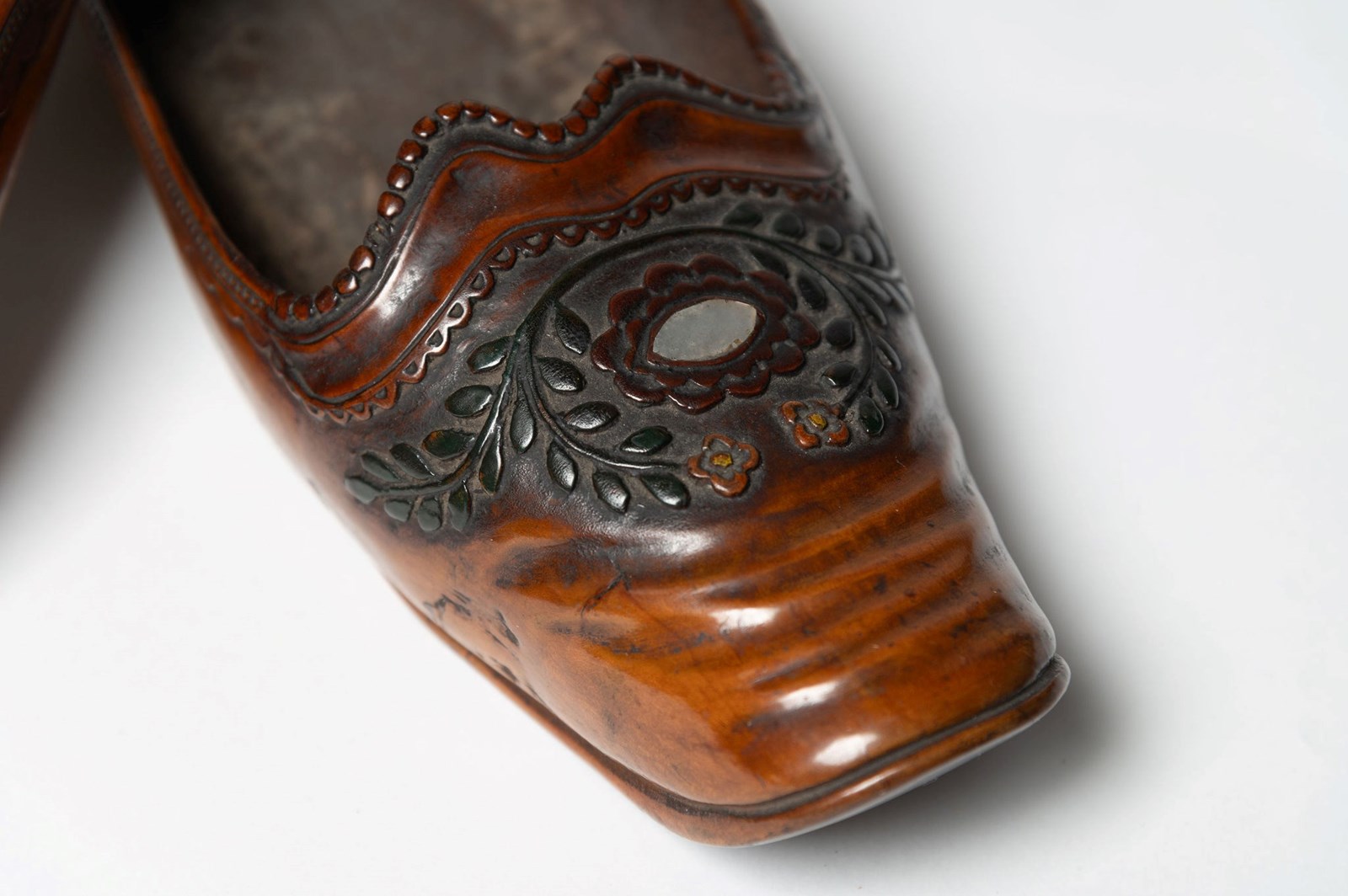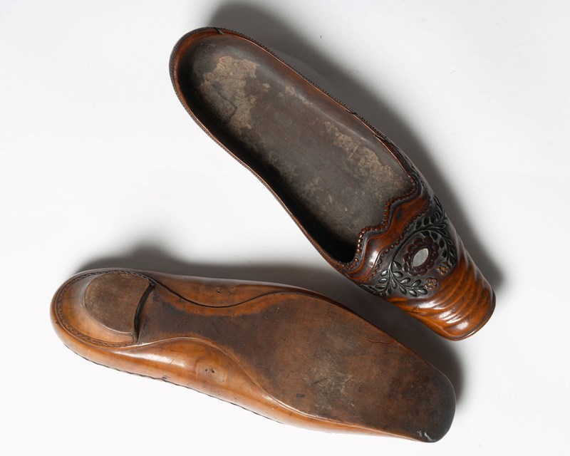 A rare pair of gentleman’s antique wooden shoes, exceptional quality, continental, mother of pearl inlay, I feel they would of had a liner and been worn maybe as a ceremonial shoe, could they be aristocracy ?. I have not seen anything like it before, they are wonderful.