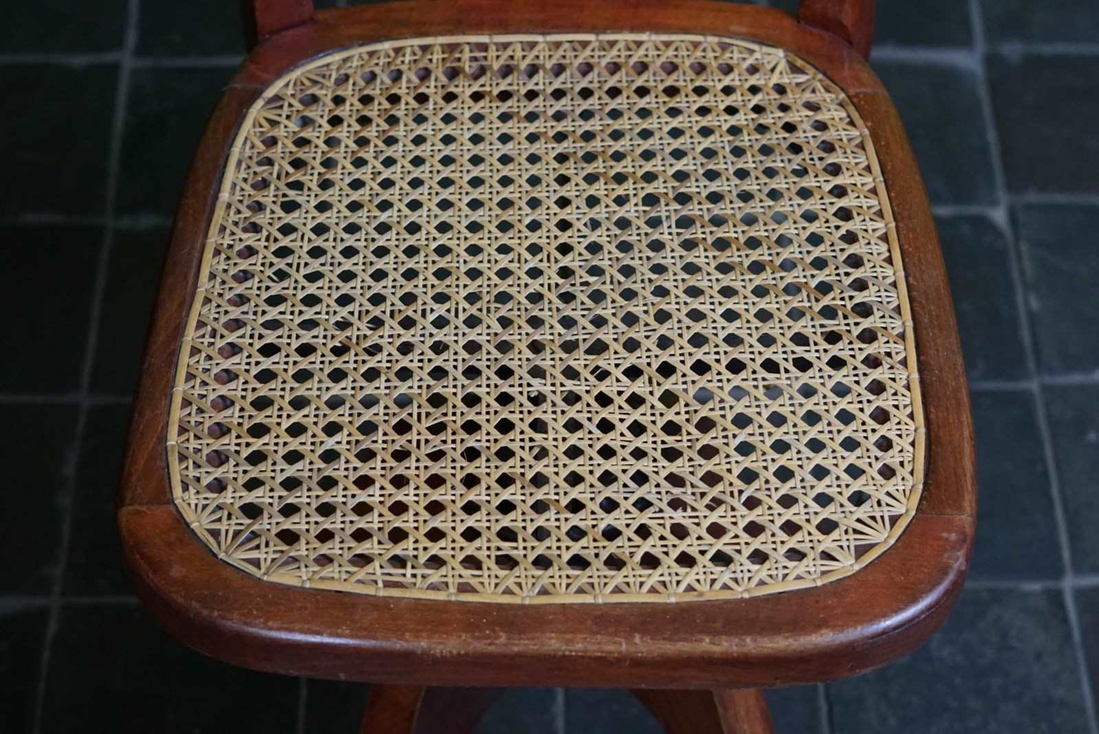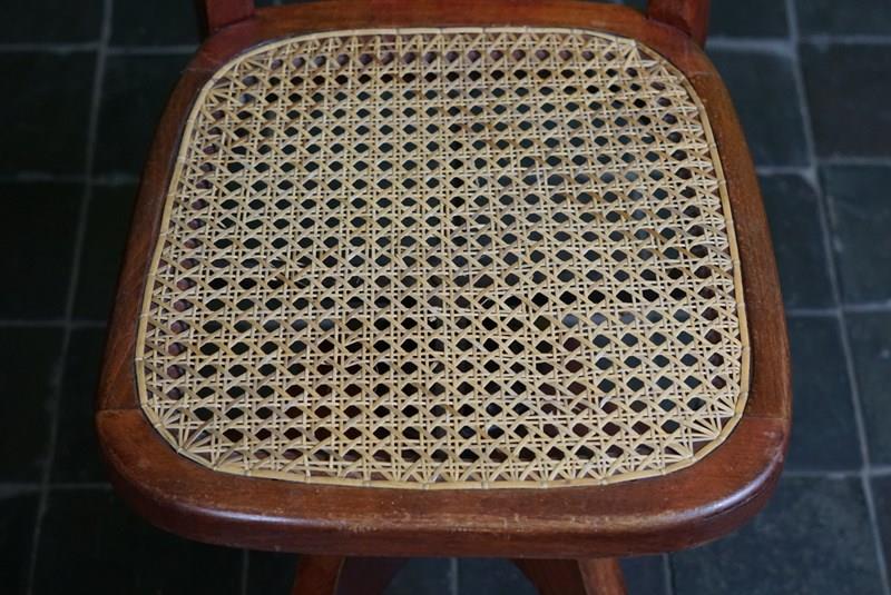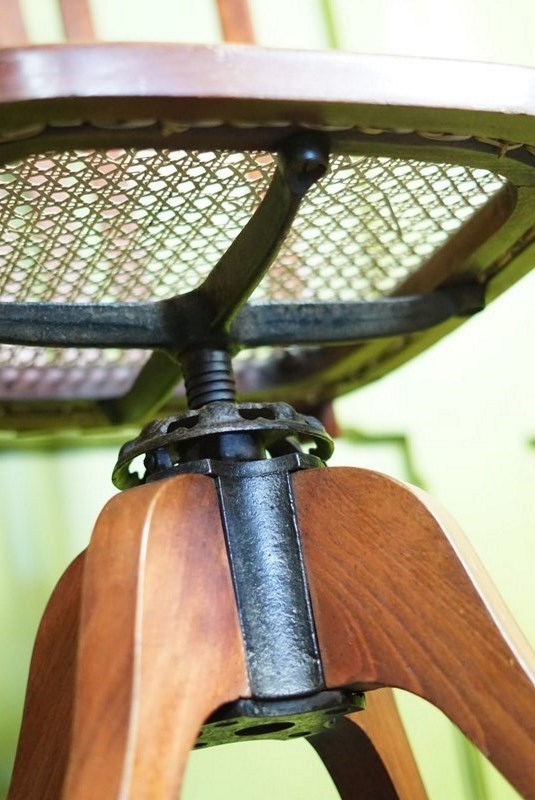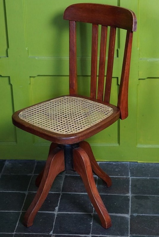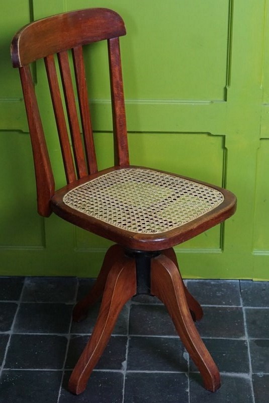 Sourced in Belgium recently, a 1940s wooden swivel office chair with a caned seat and adjustable cast iron height mechanism.