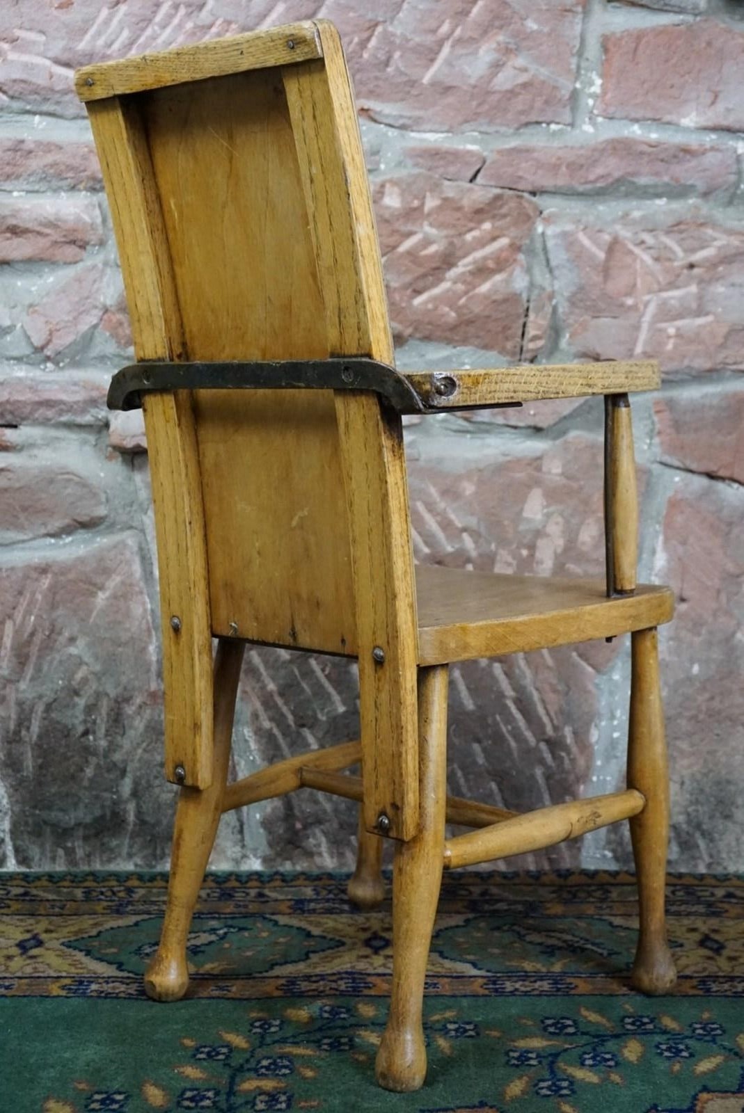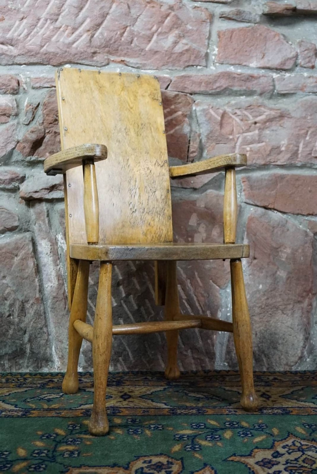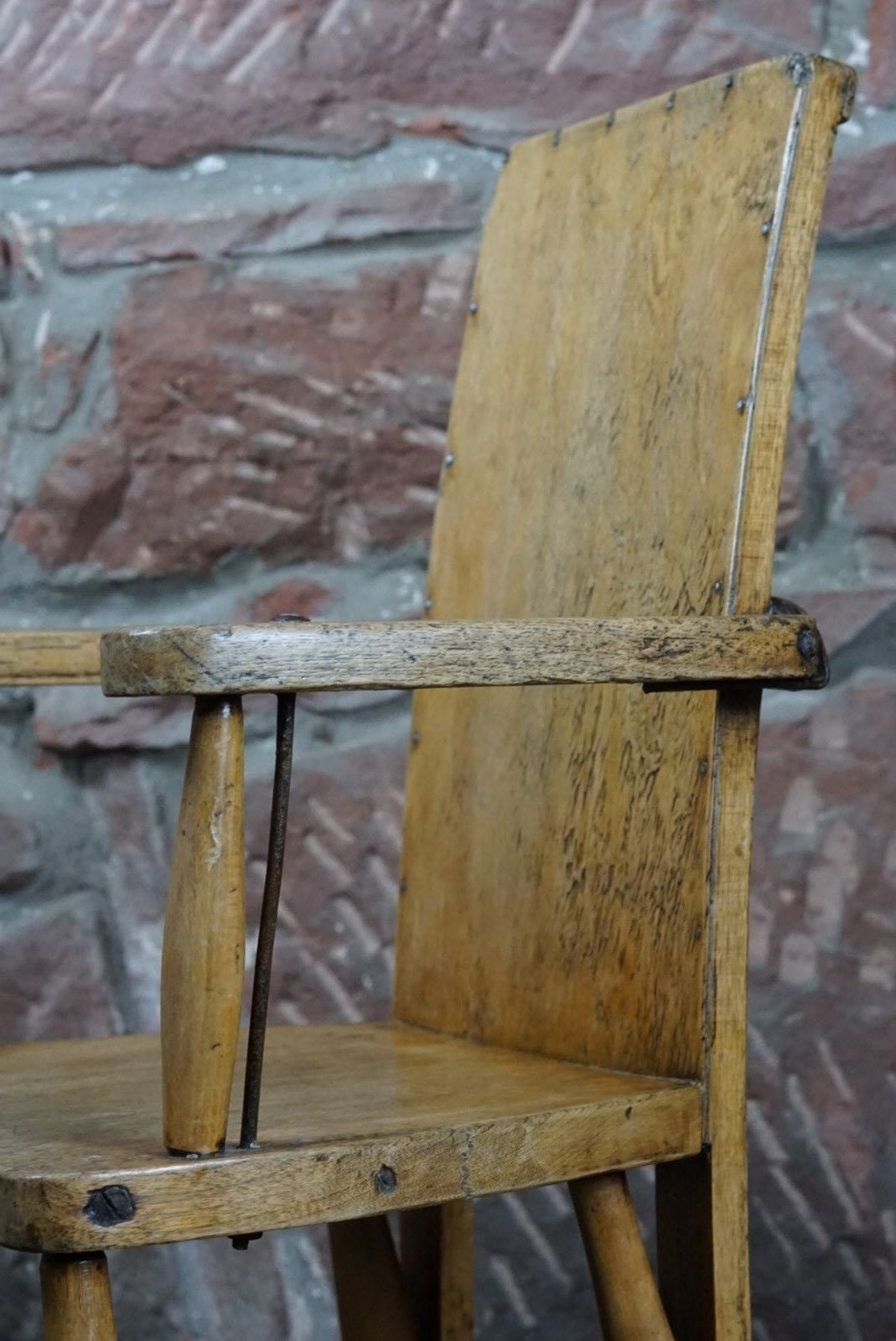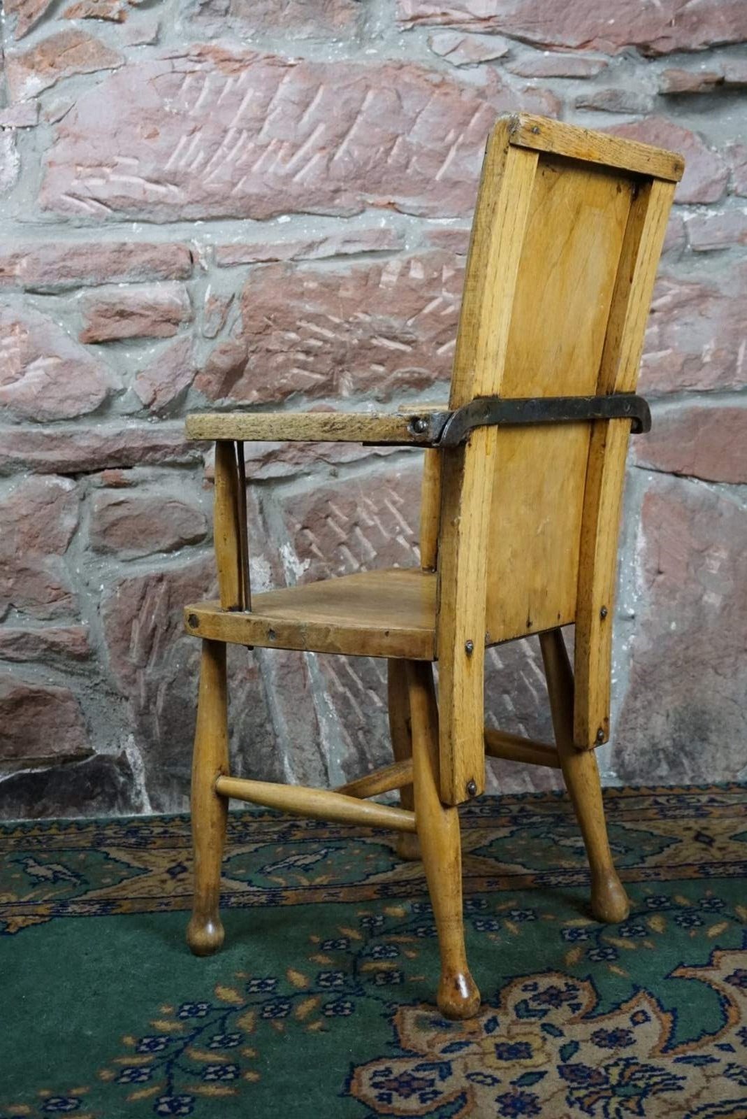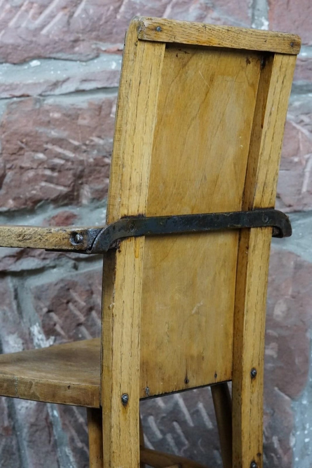A Child's Wooden Chair With Metal Reinforcement