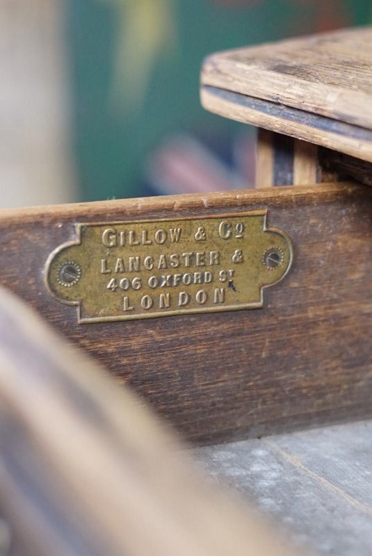The drawer interior bears the brass makers plate for 'Gillow & Co, 406 Oxford Street, London' with the design catalogue number stamped to the rear of the drawer.