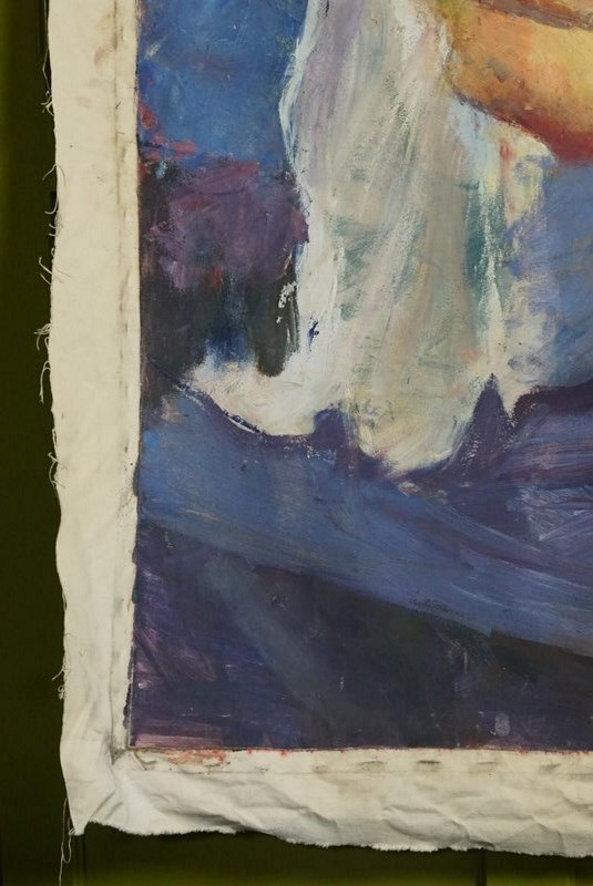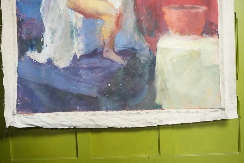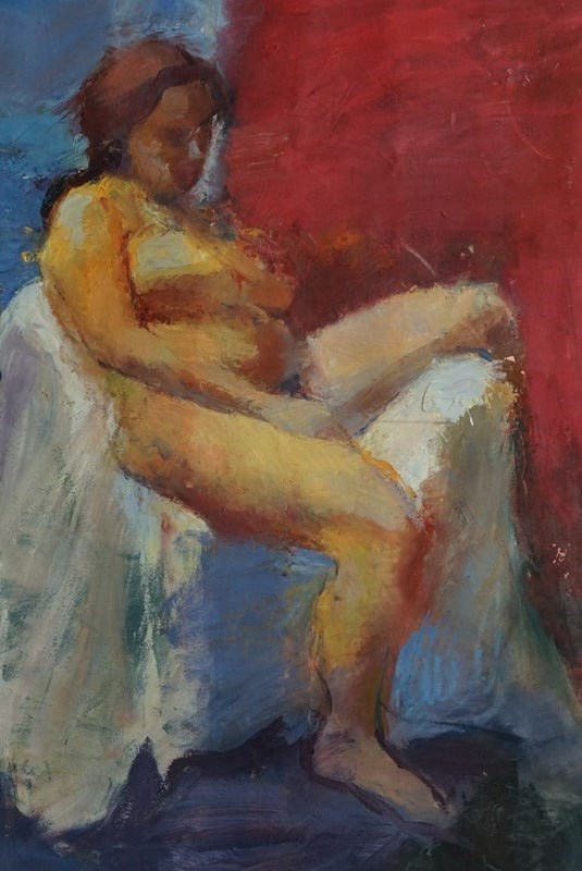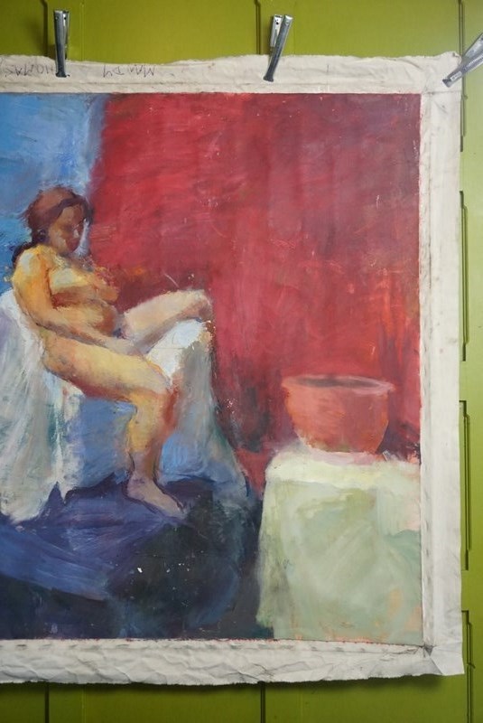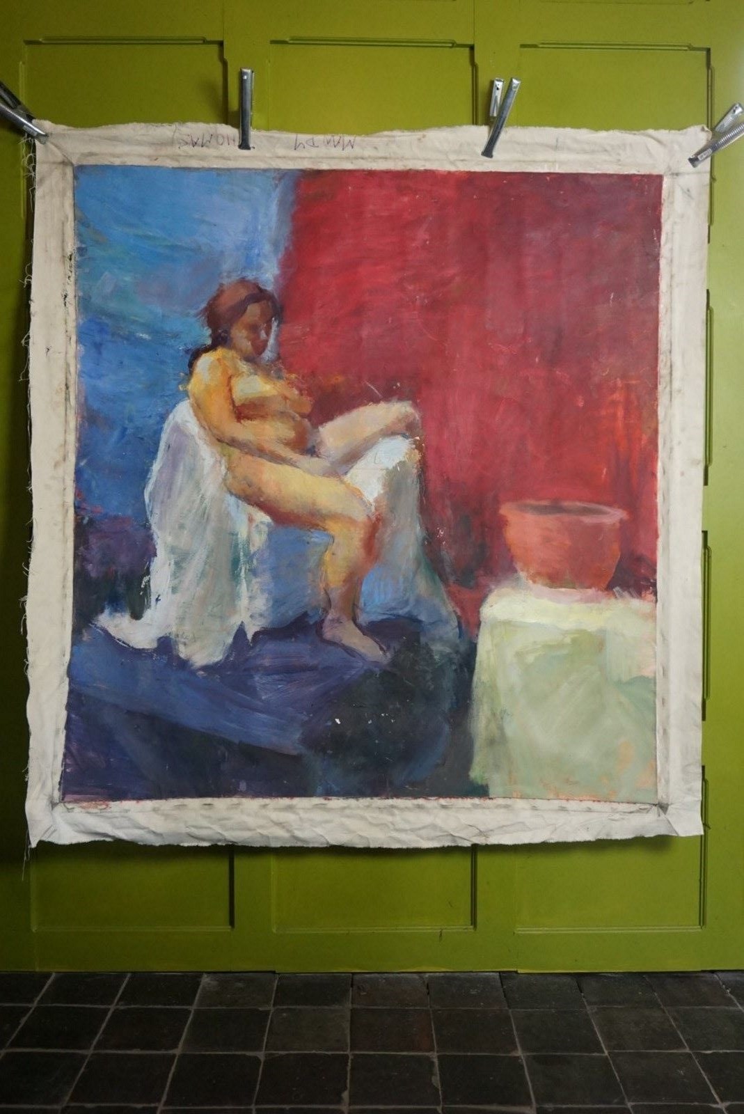 A large scale oil on unstretched canvas of a seated female nude, by Mandy Thomas.