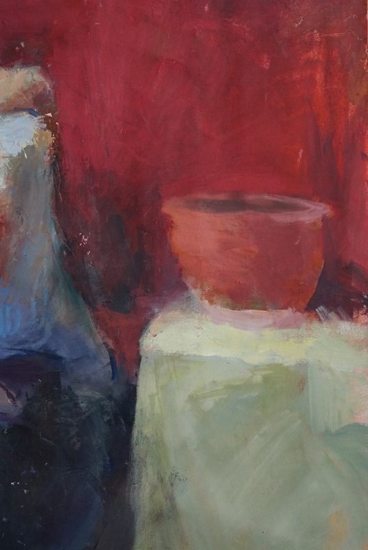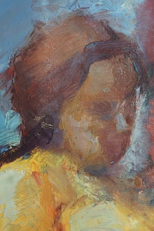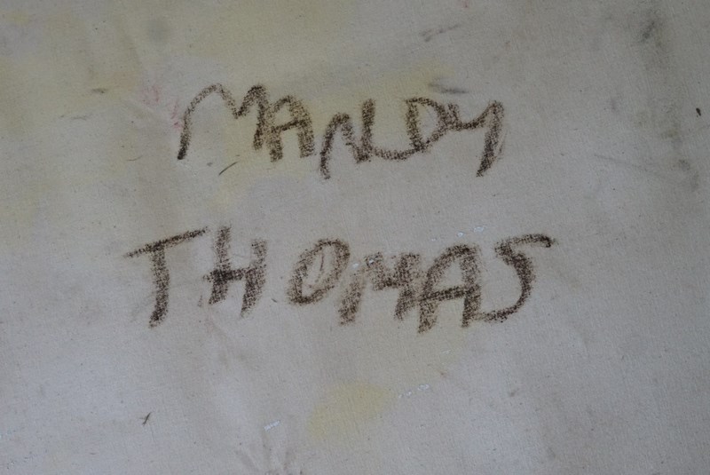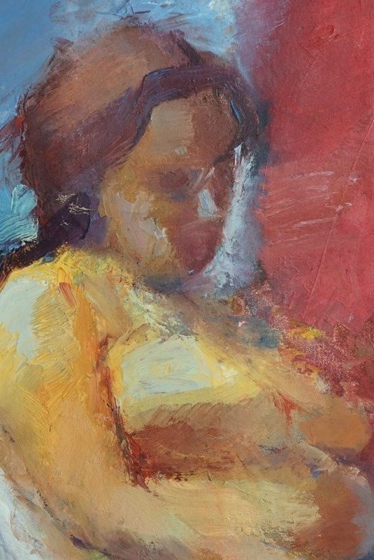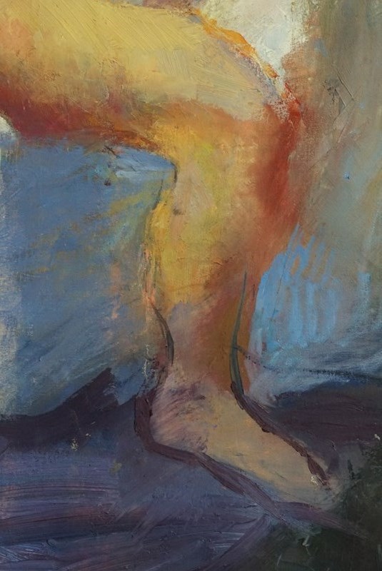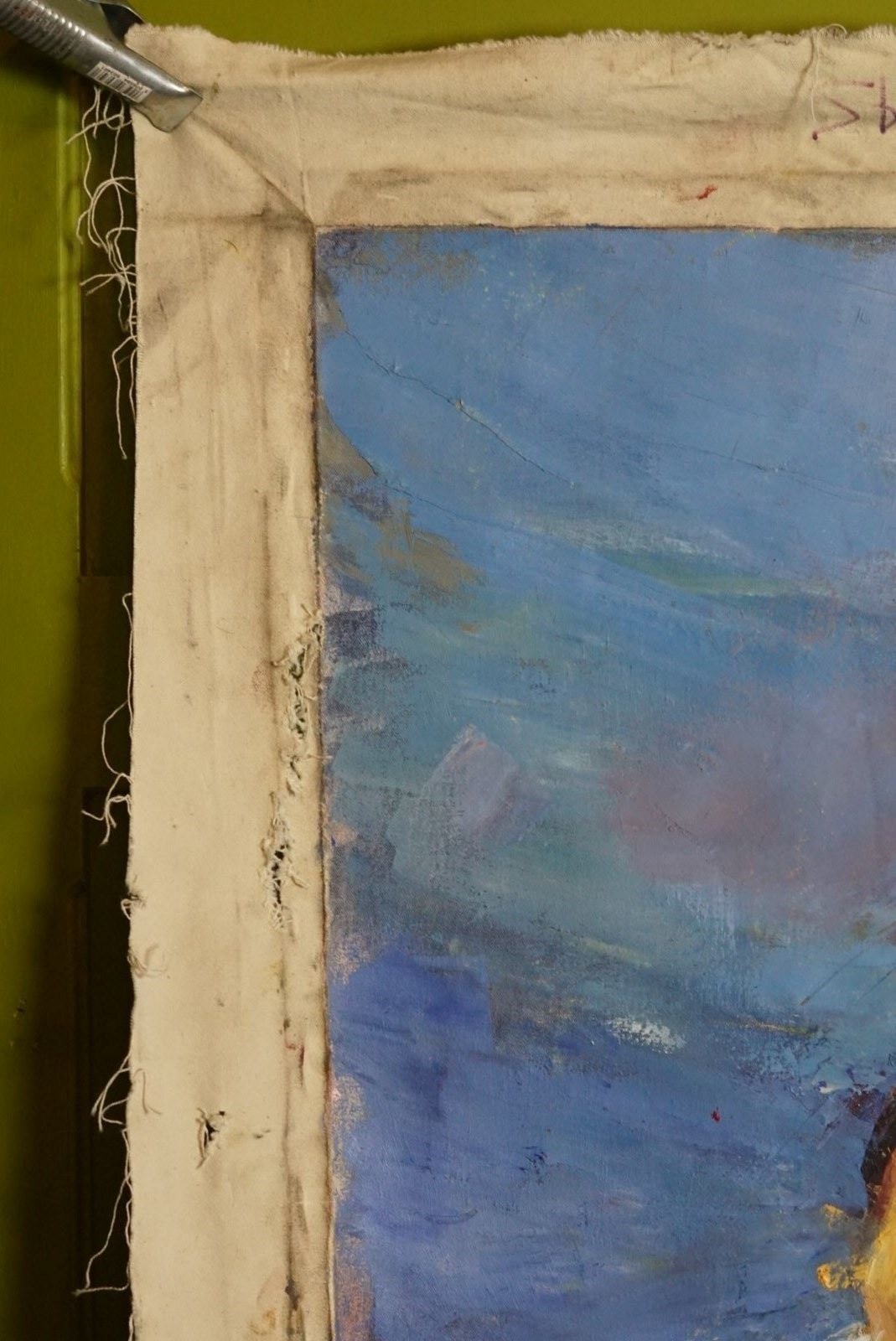 A large scale oil on unstretched canvas of a seated female nude, by Mandy Thomas.