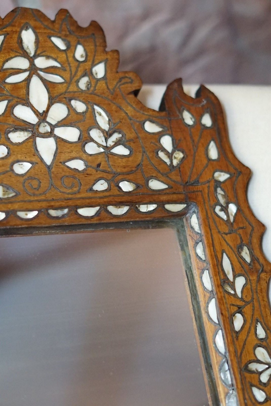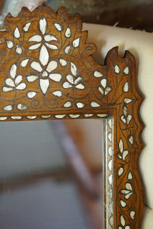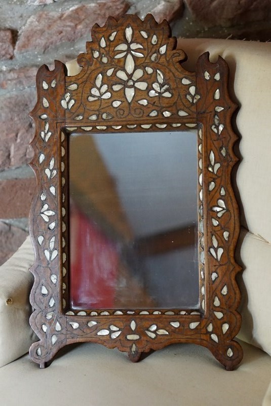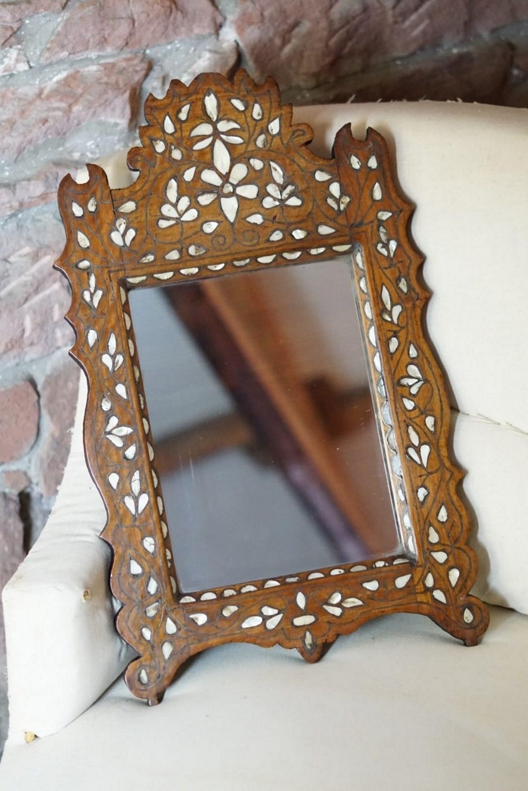 A late 19th century Syrian mirror, profusely inlaid with mother of pearl and silver wirework.