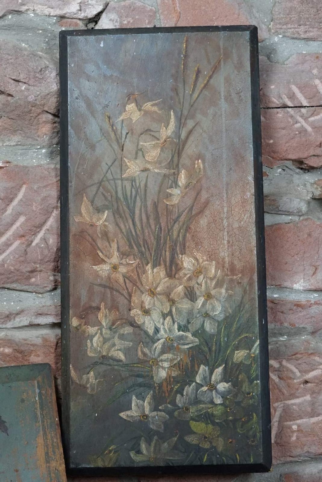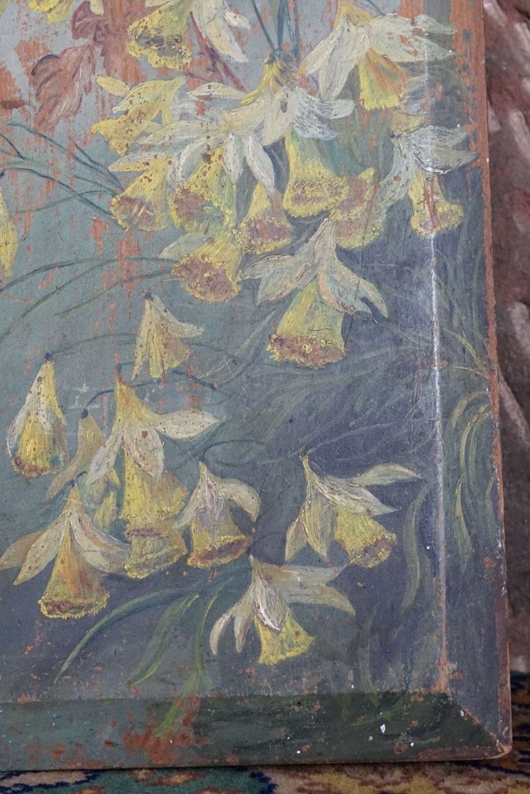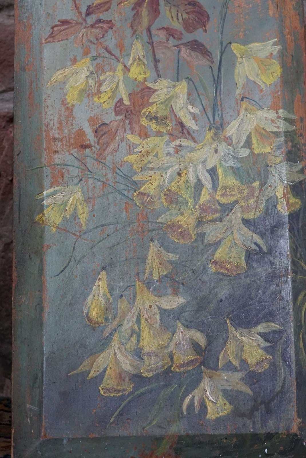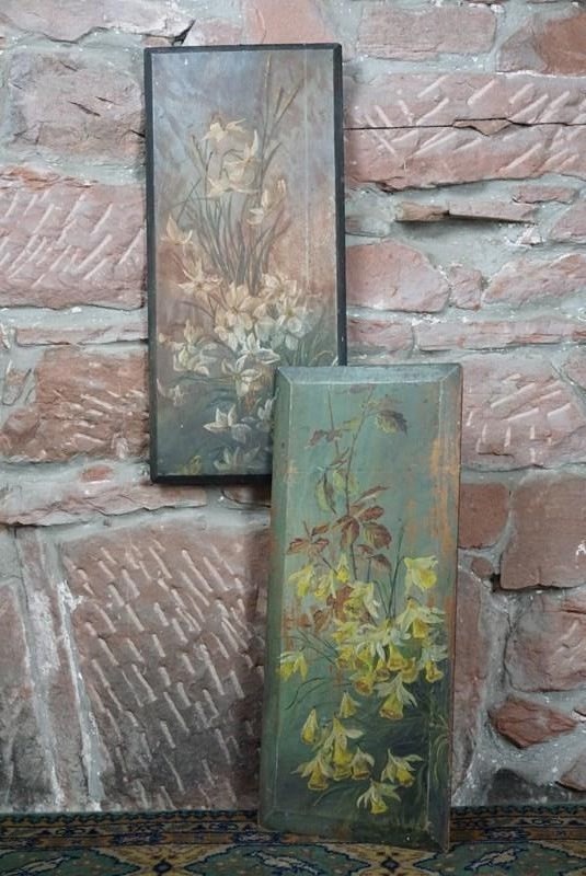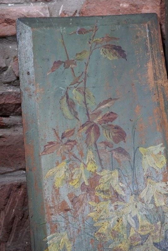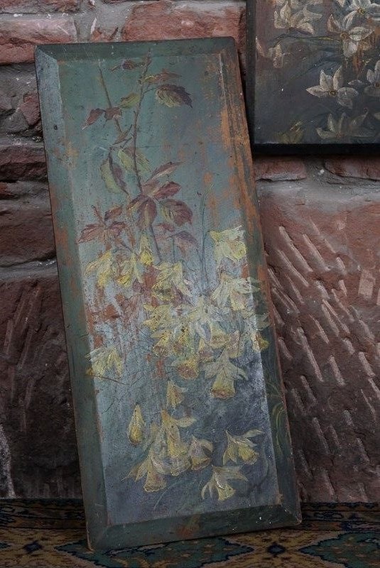 A pair of French wooden panels, possibly originally from a piece of furniture, hand painted with floral designs.