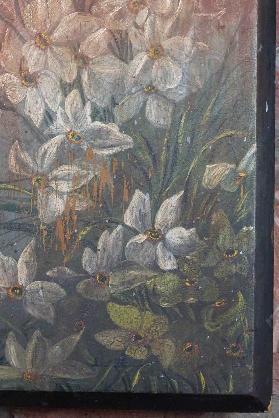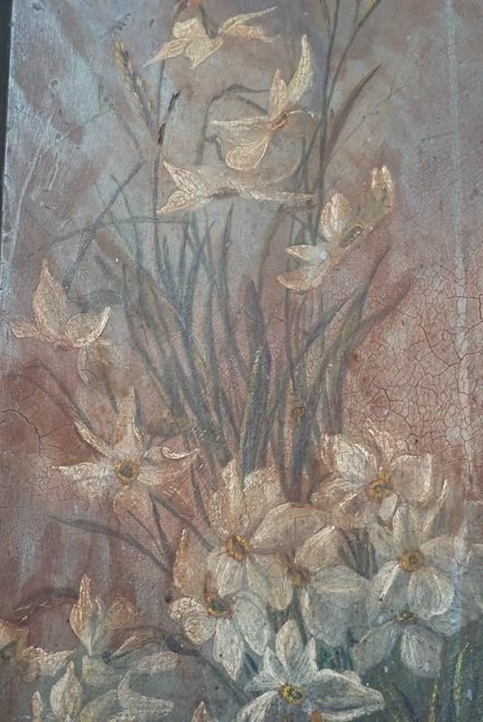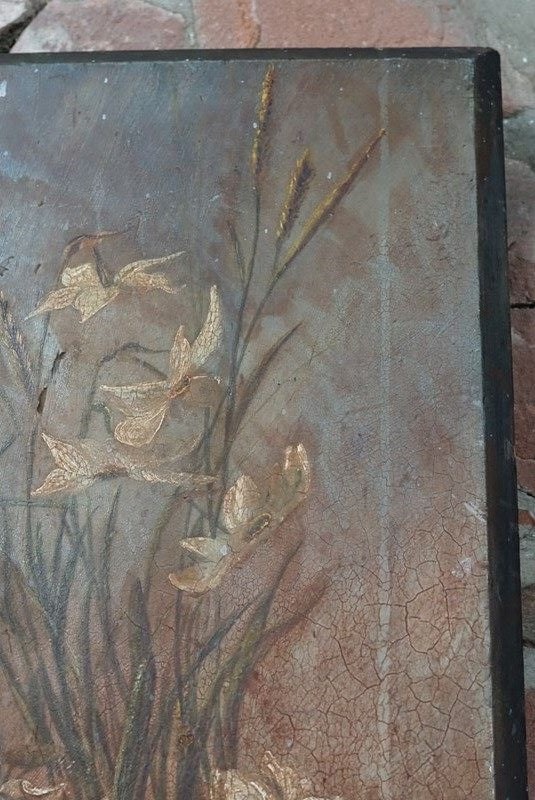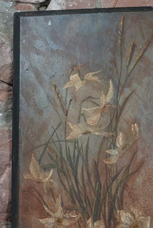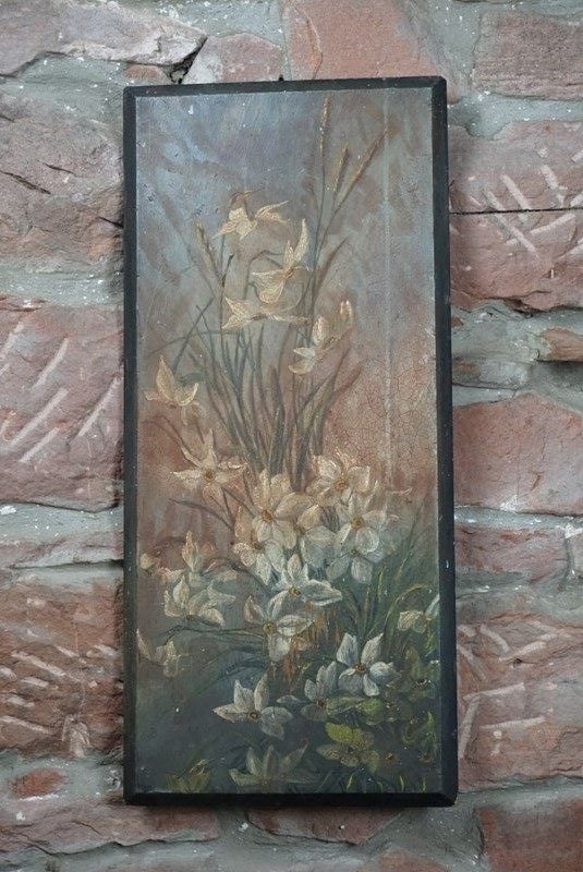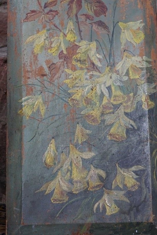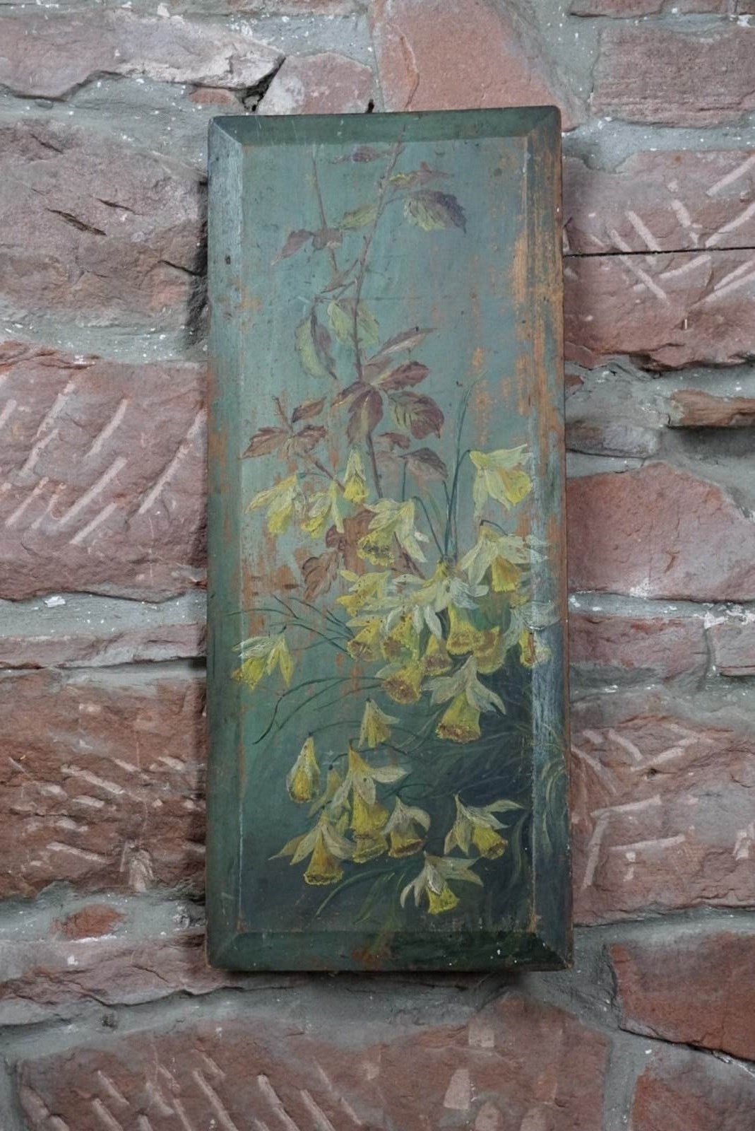 A pair of French wooden panels, possibly originally from a piece of furniture, hand painted with floral designs.
