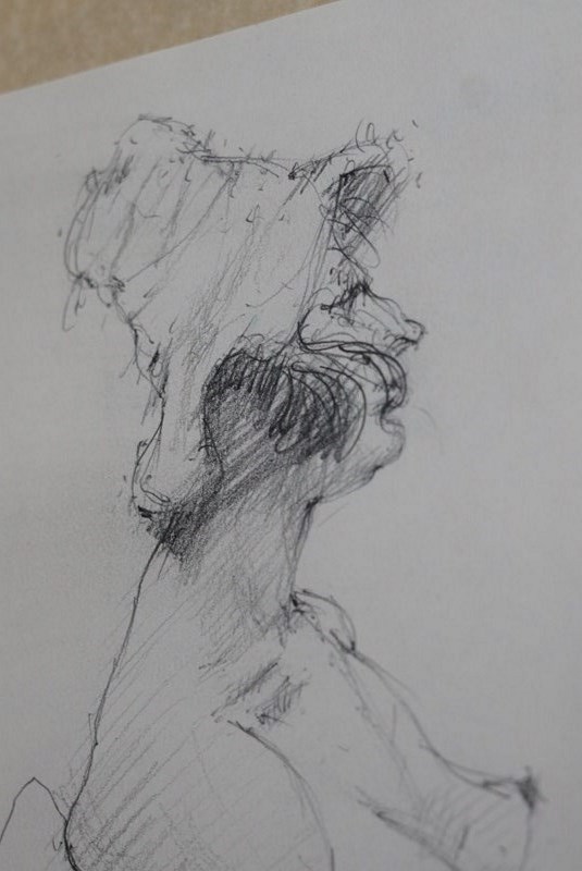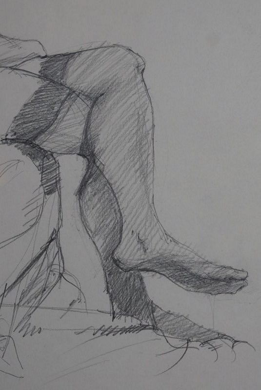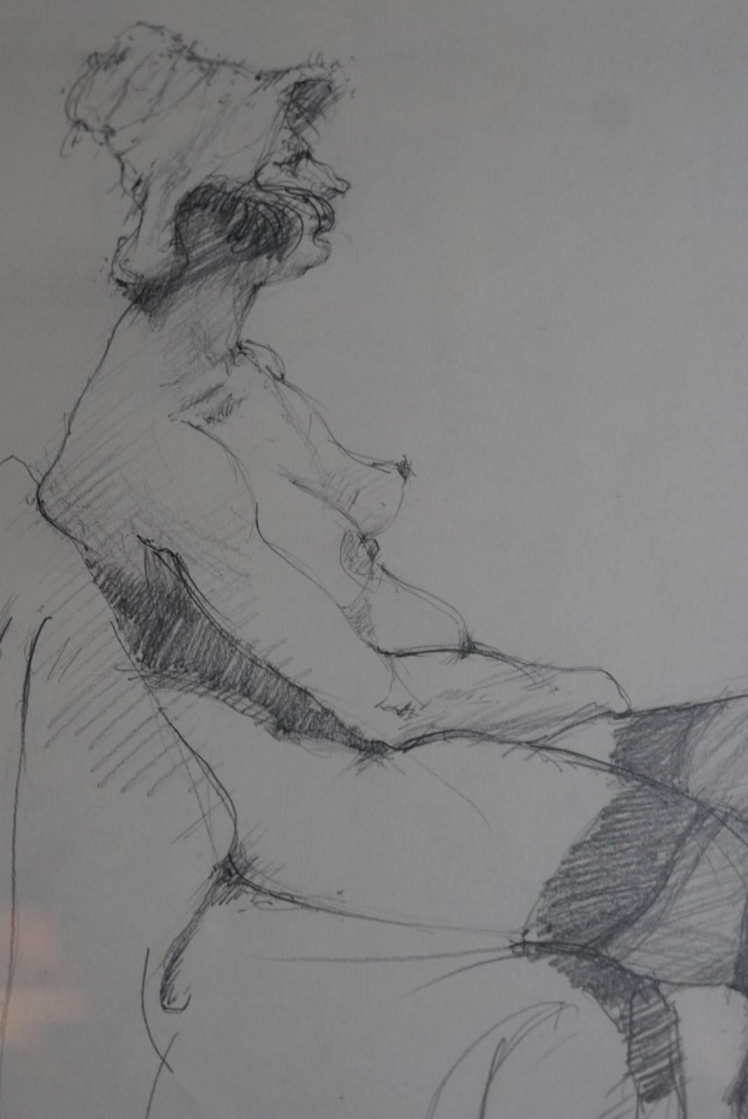 A pencil sketch of a female nude, casually sat in her stockings and 'bonnet'.