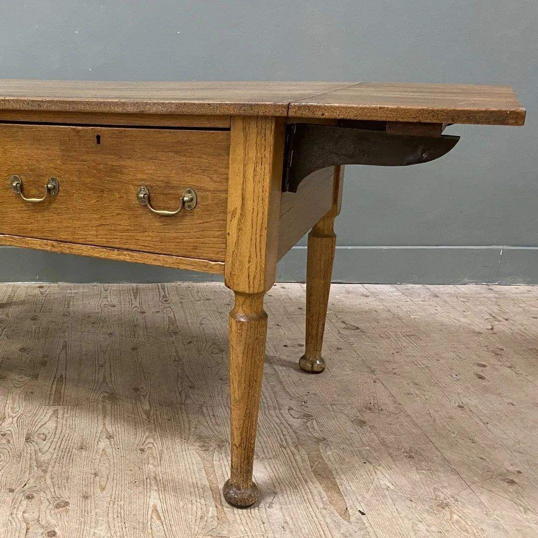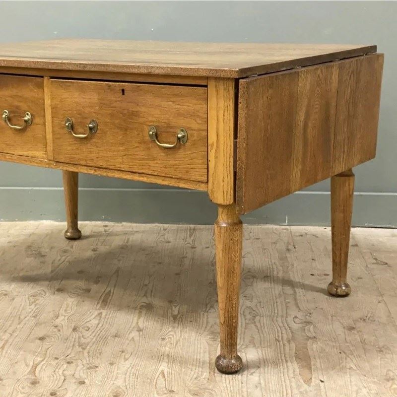 It has drop leaves extending the top, which are held in place by brass brackets and two deep drawers to the front with brass handles.