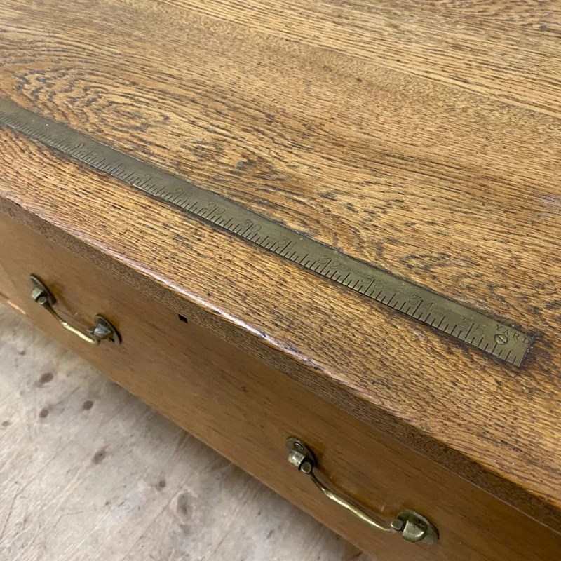 The table has a planked top with the original inset brass rule for measuring the draper's cloth.
