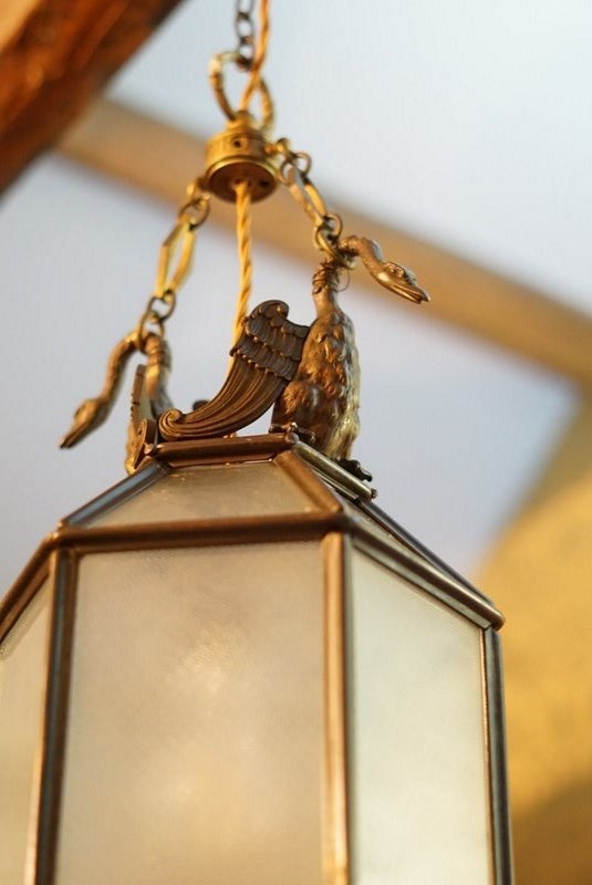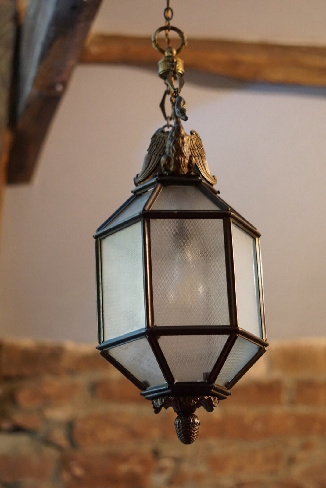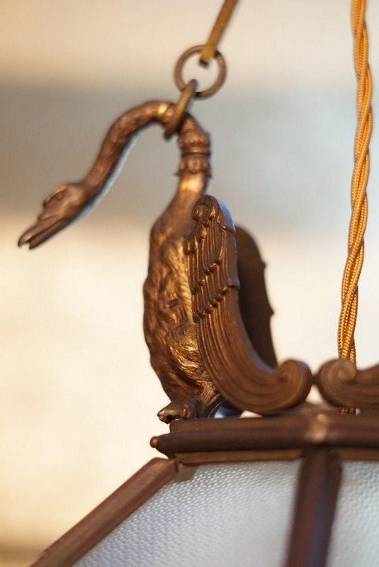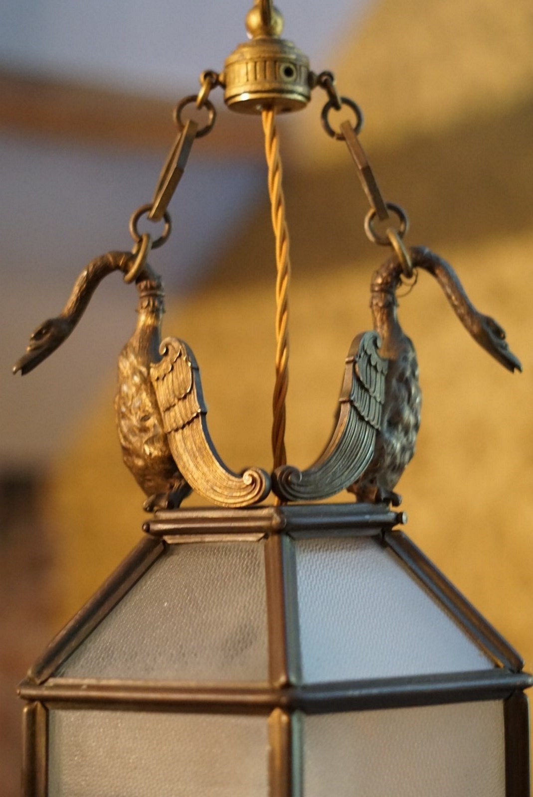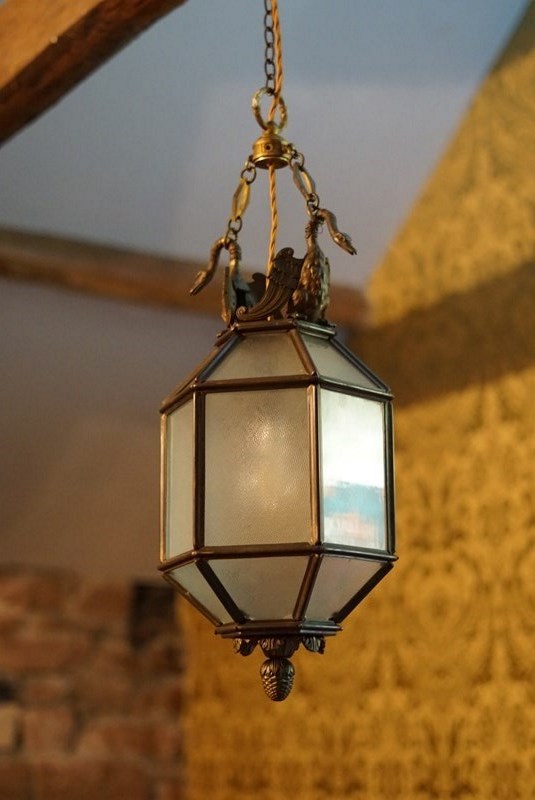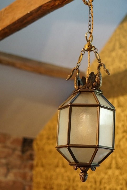 A beautiful French glazed lantern with double swan collar and acorn finial at the base, wired with gold twist fabric cable.