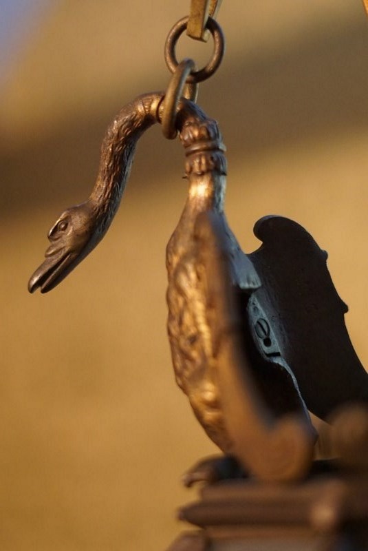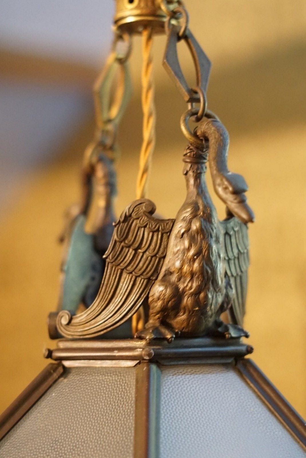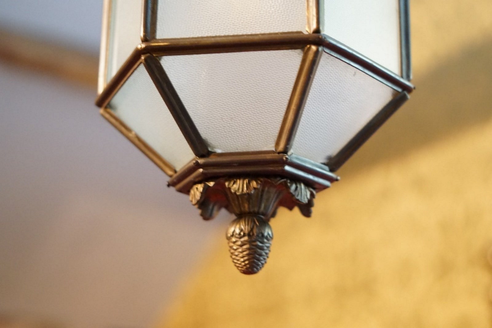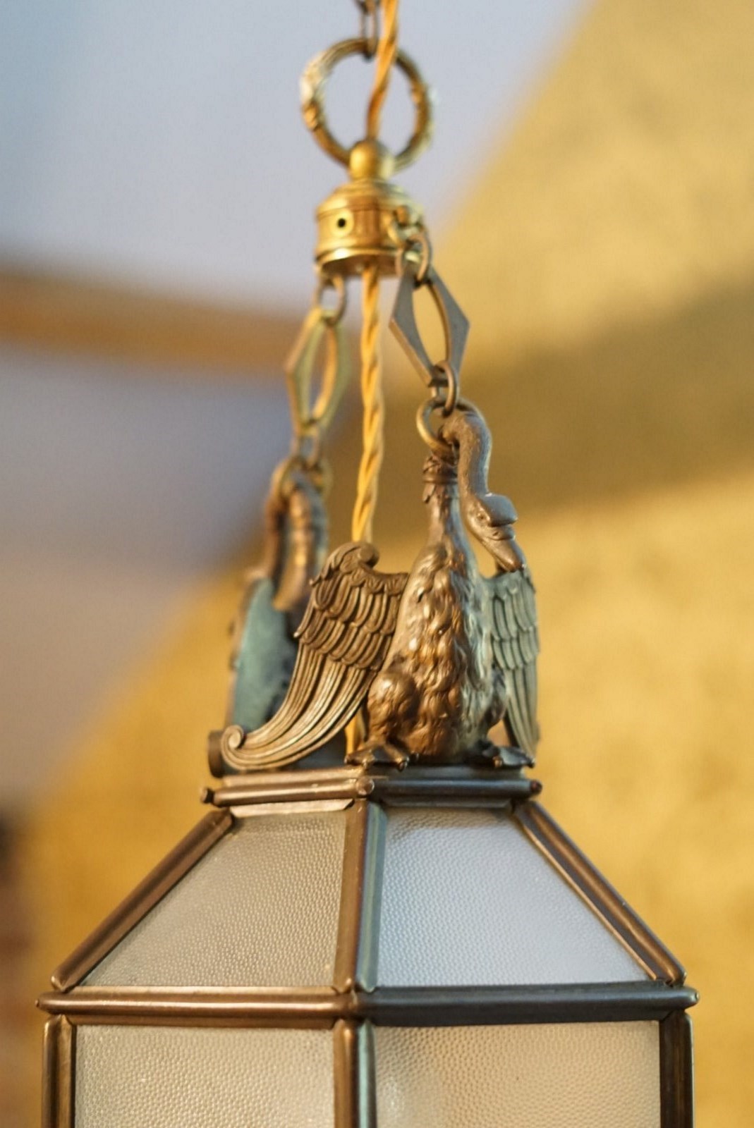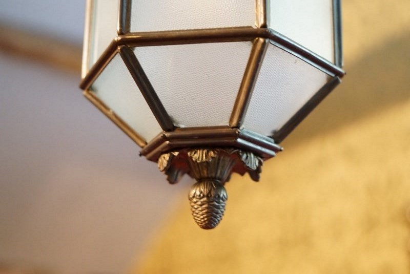 A beautiful French glazed lantern with double swan collar and acorn finial at the base, wired with gold twist fabric cable.