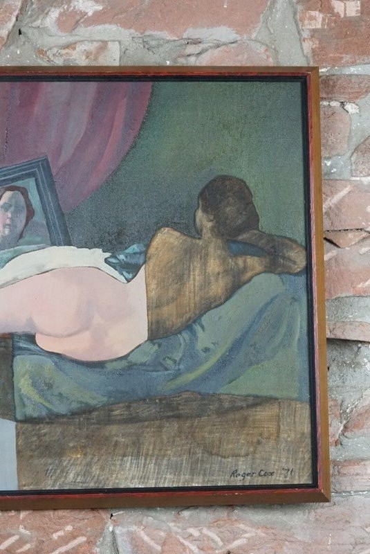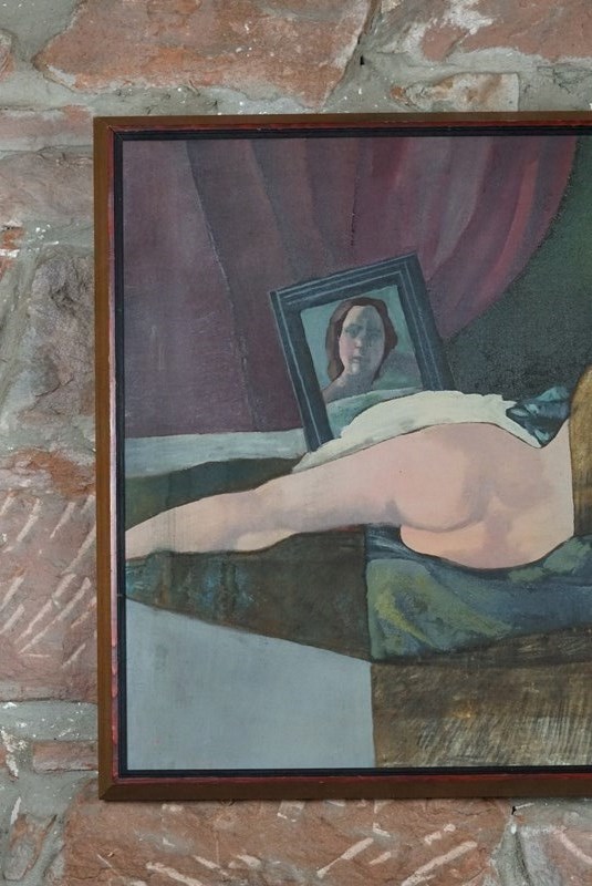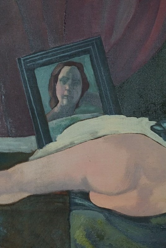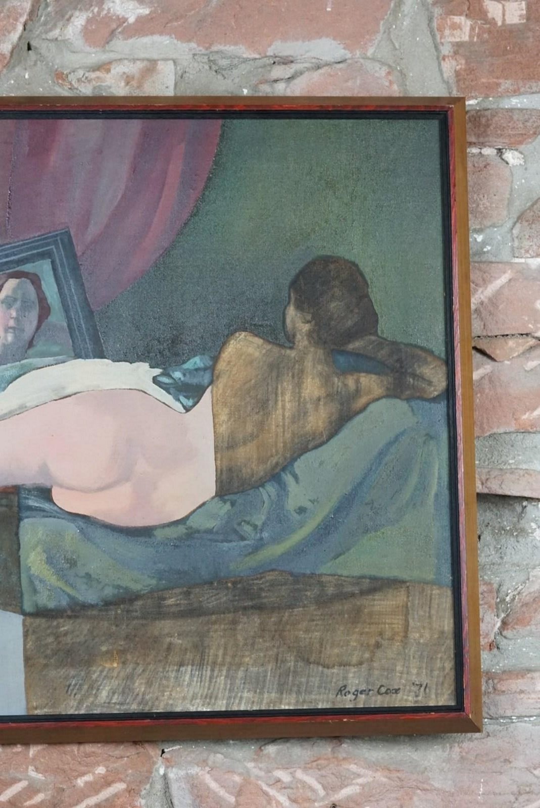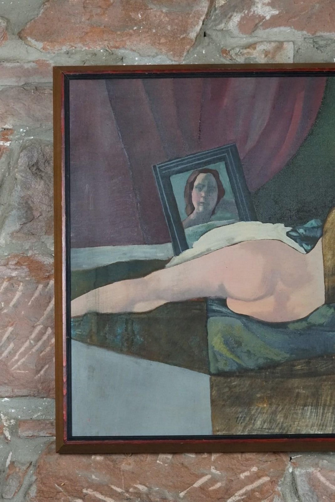 An original oil painting of a reclining female nude with the subject gazing at her own reflection.