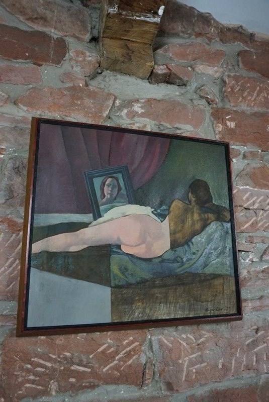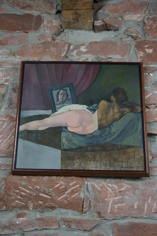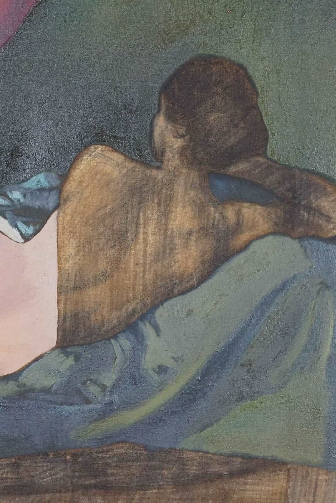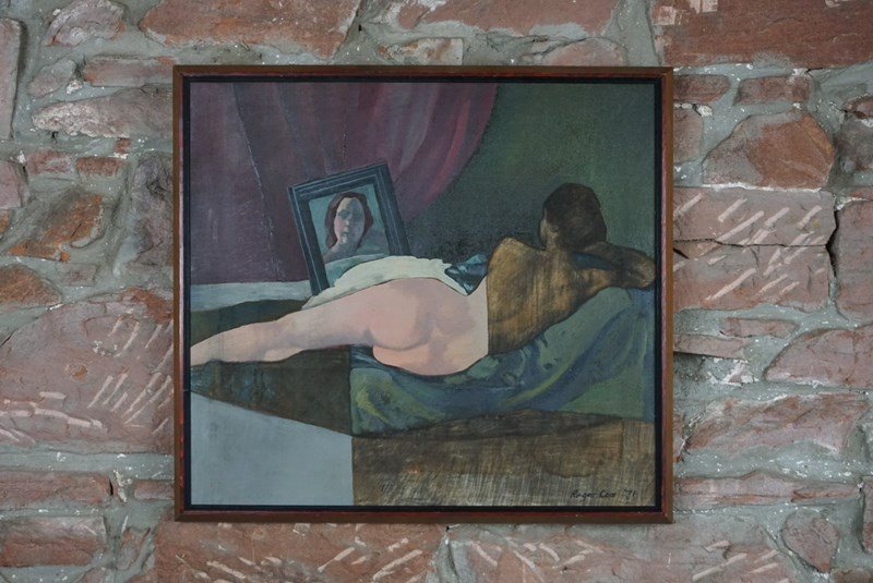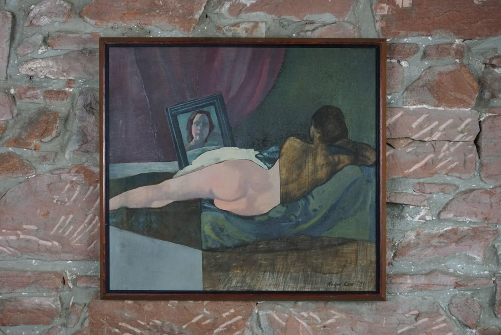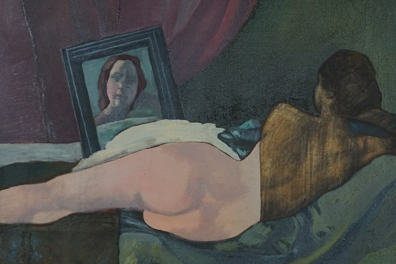 An original oil painting of a reclining female nude with the subject gazing at her own reflection.