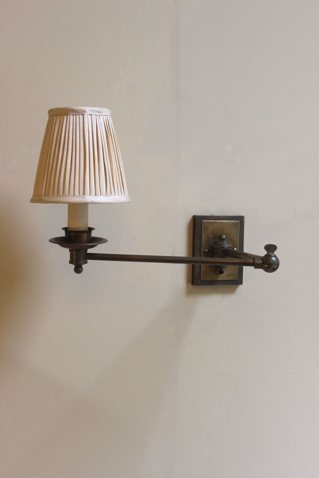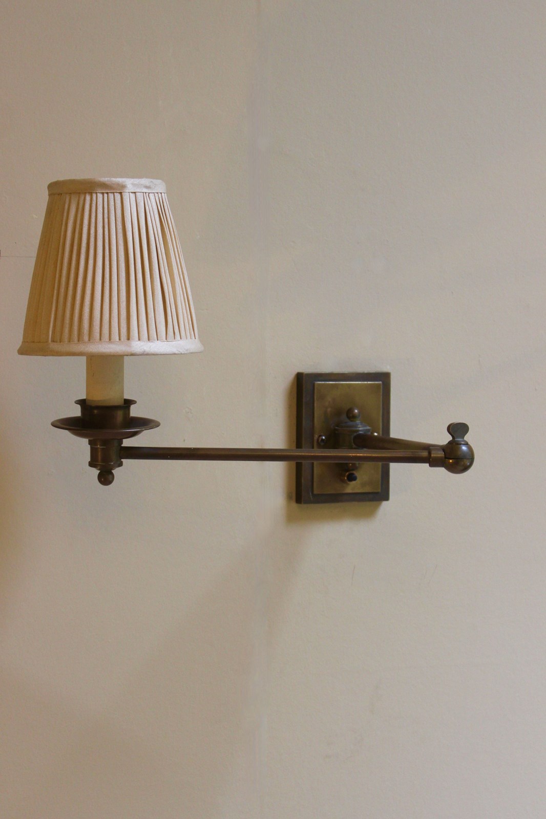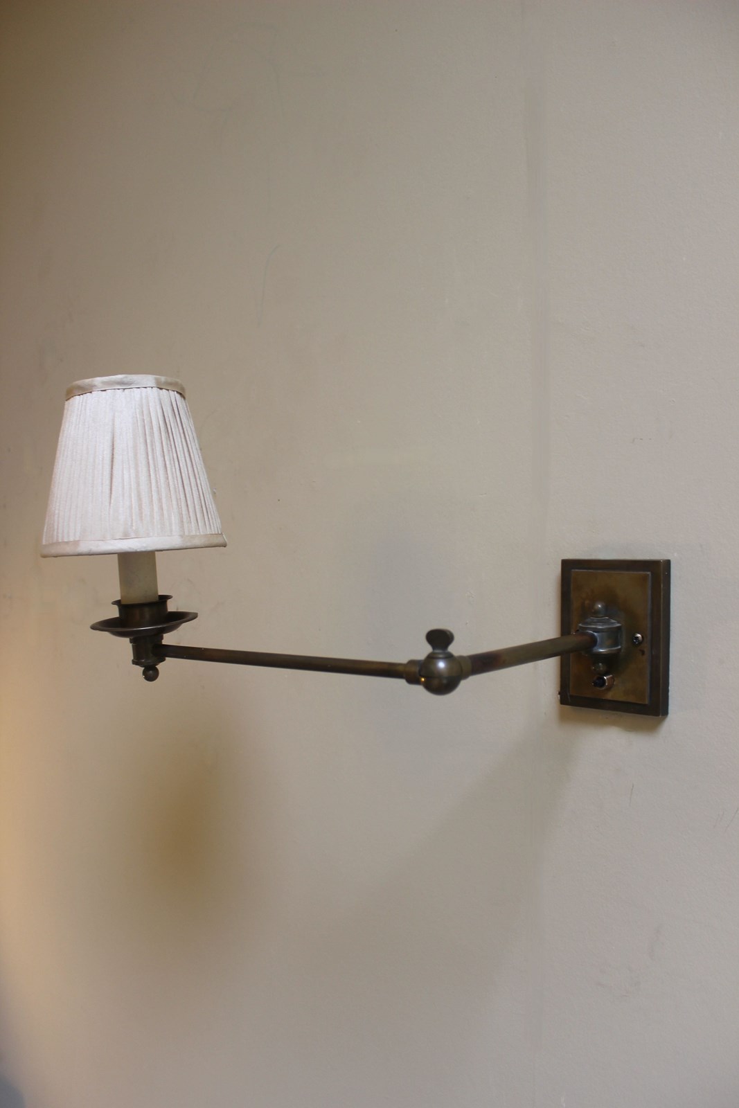 Darker brass english early 20th C swing arm wall sconce with on /off switch to the back plate and fixed first portion of the arm