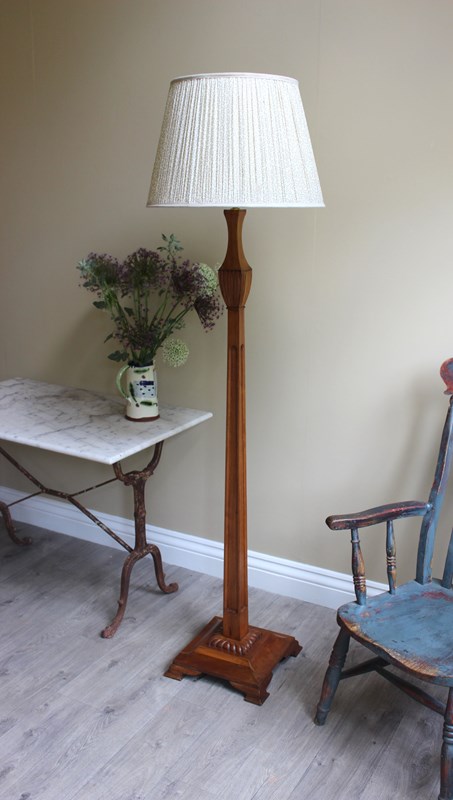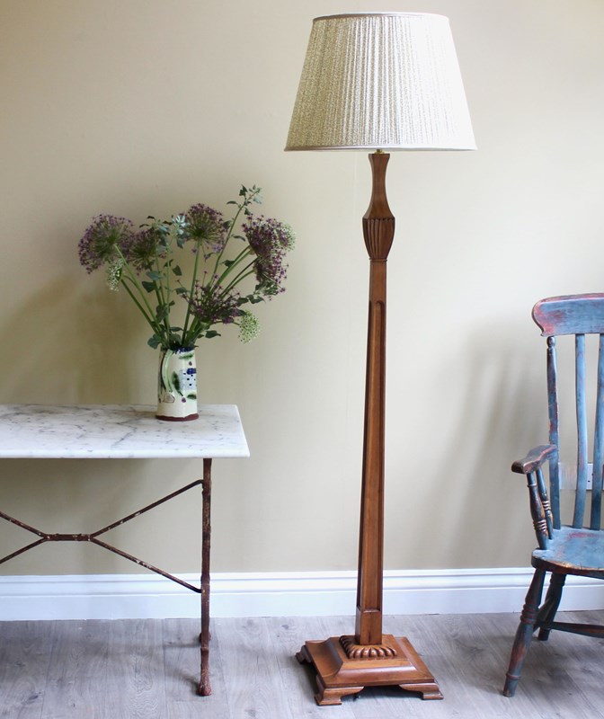 English solid carved hardwood floor lamp dating around 1930 possibly made for Heals and certainly in that style, Art Deco influences. Beautifully carved lovely patina very stable height to lampholder is 153 cms.