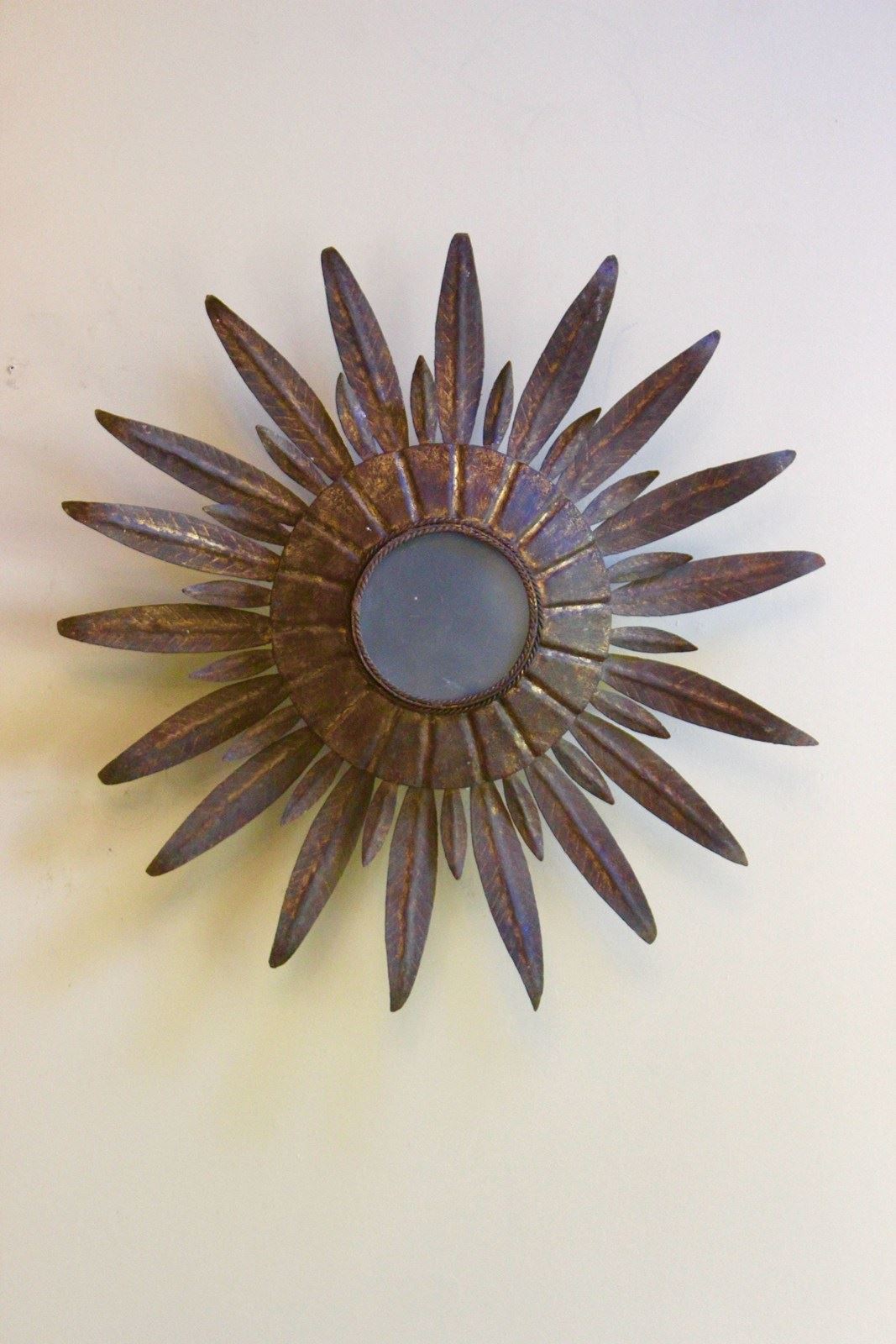 Circular French gilt metal ceiling or wall light with etched glass front and two SESE14 light points behind the glass.