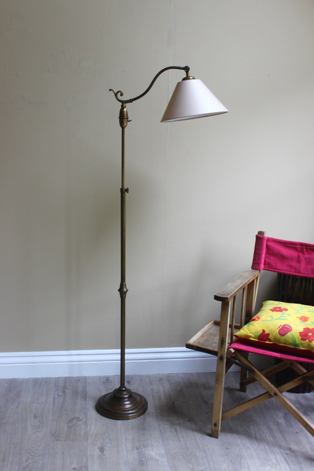 French middle 20th C reading lamp with original on/off switch and custom made taupe silk shade - similar to stock no 7193340
