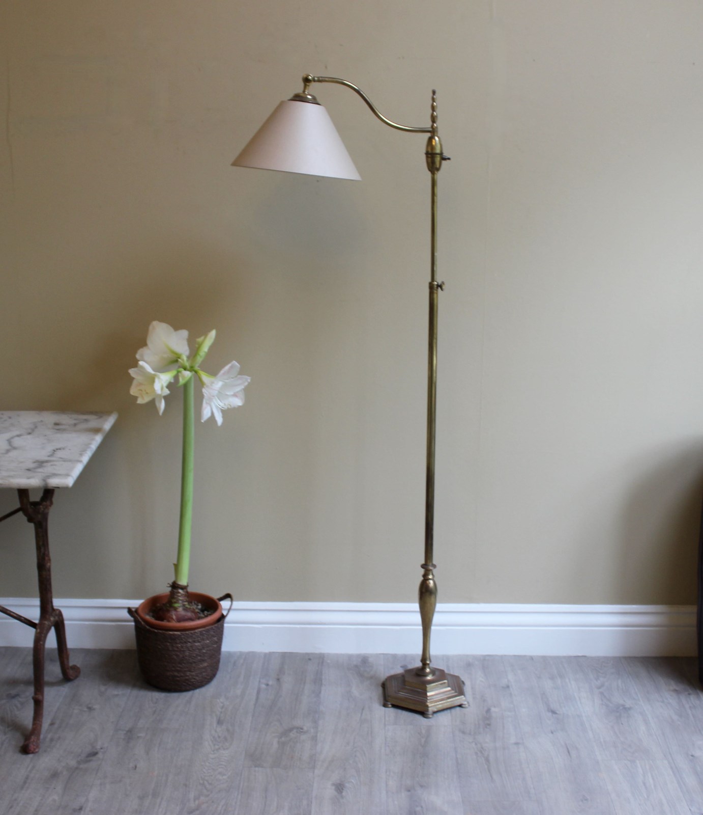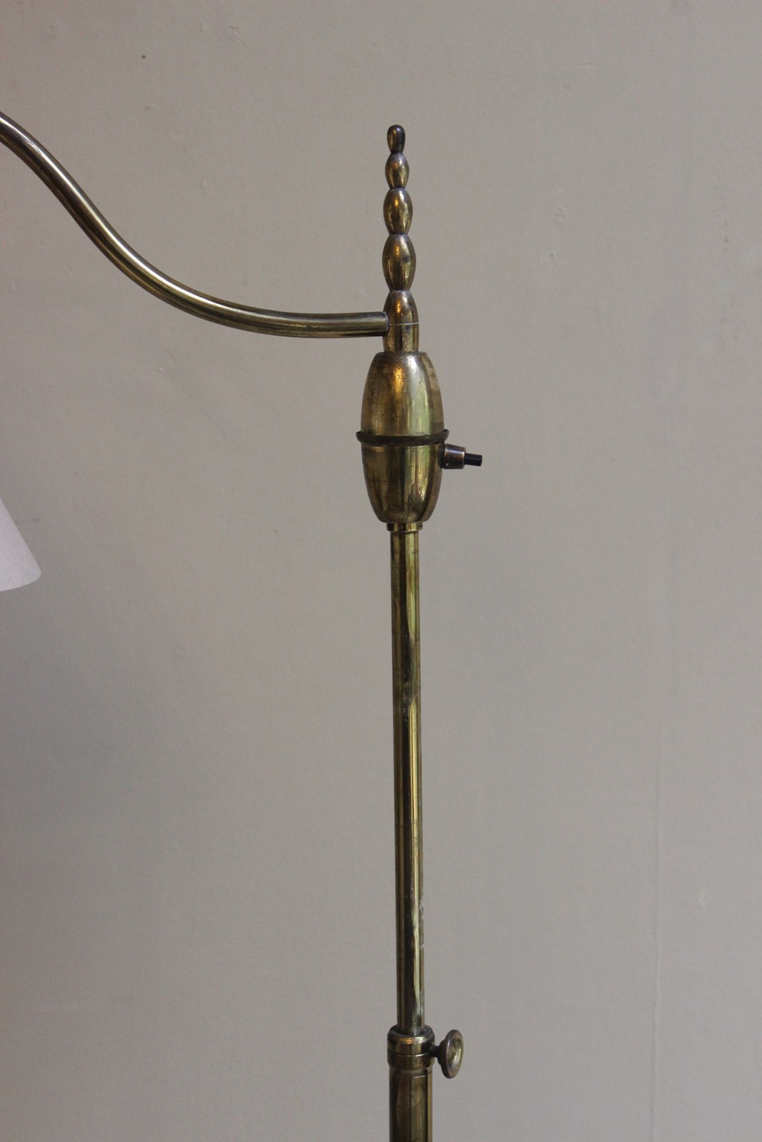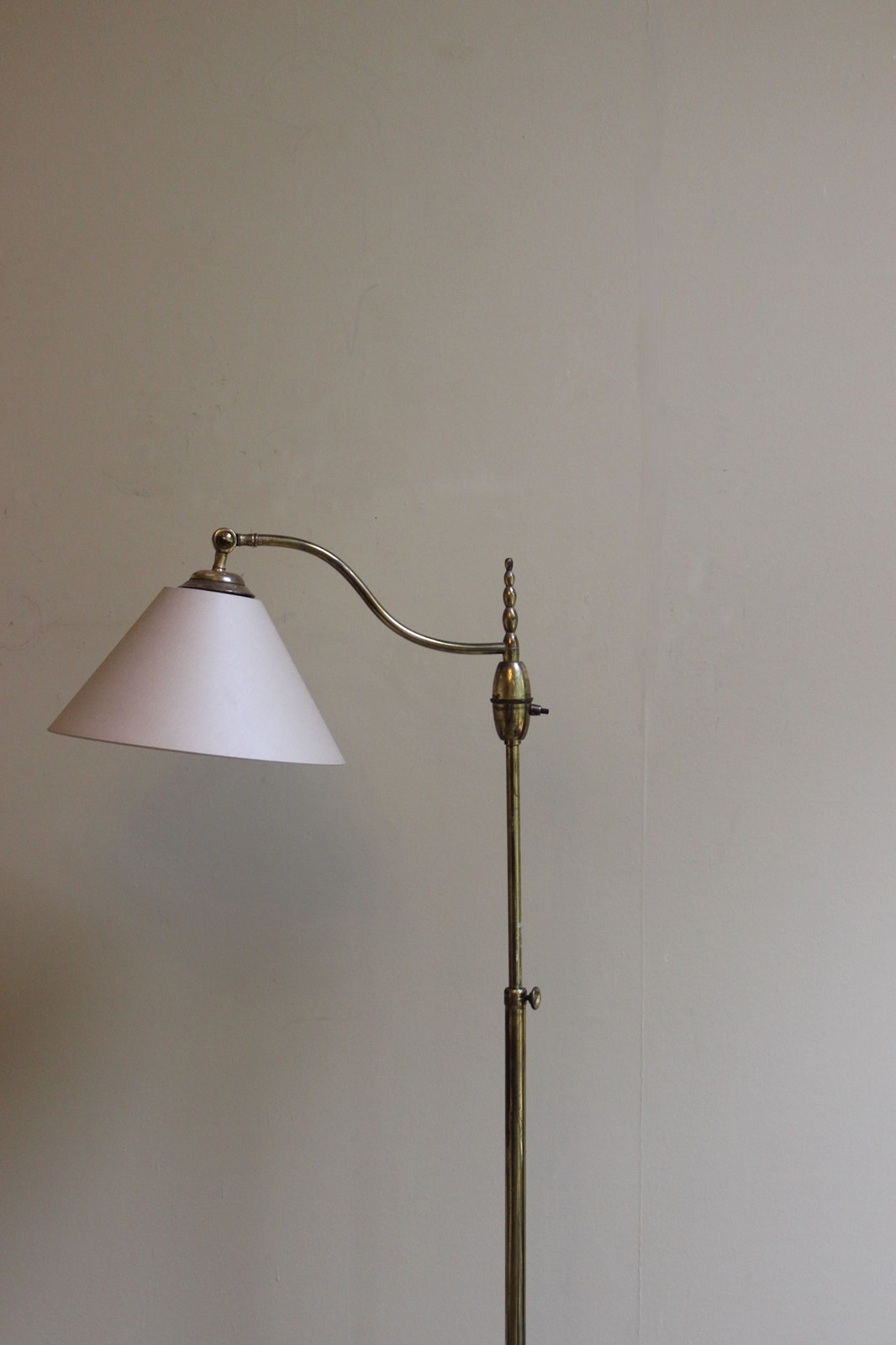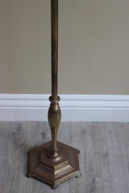 French art deco style brass floor lamp with adjustable height positions from 160 cms down to 130 cms for reading by a chair or sofa